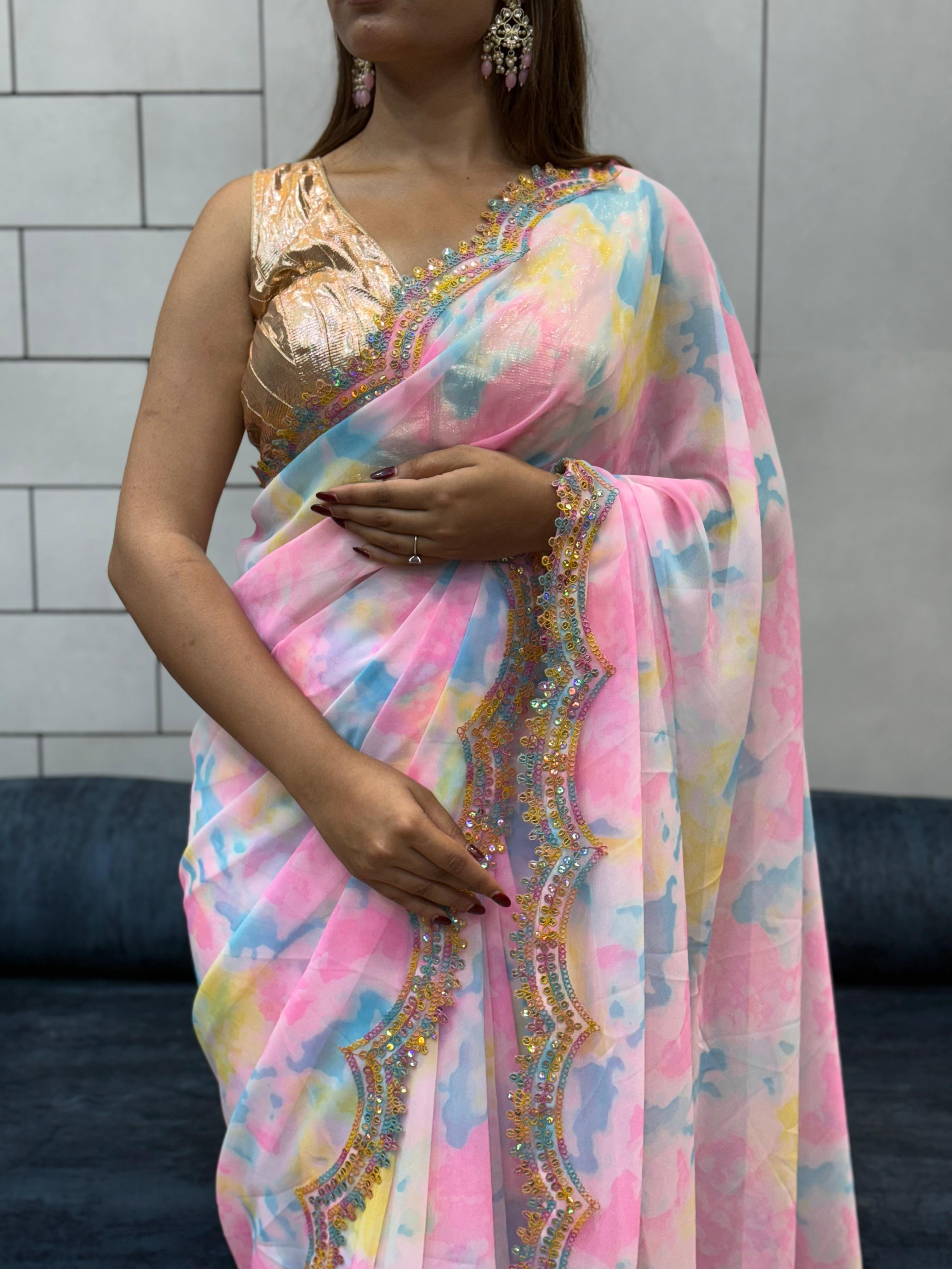 Pink Celebrity Style Shibori Print Soft Faux Georgette Saree with Rainbow Lace