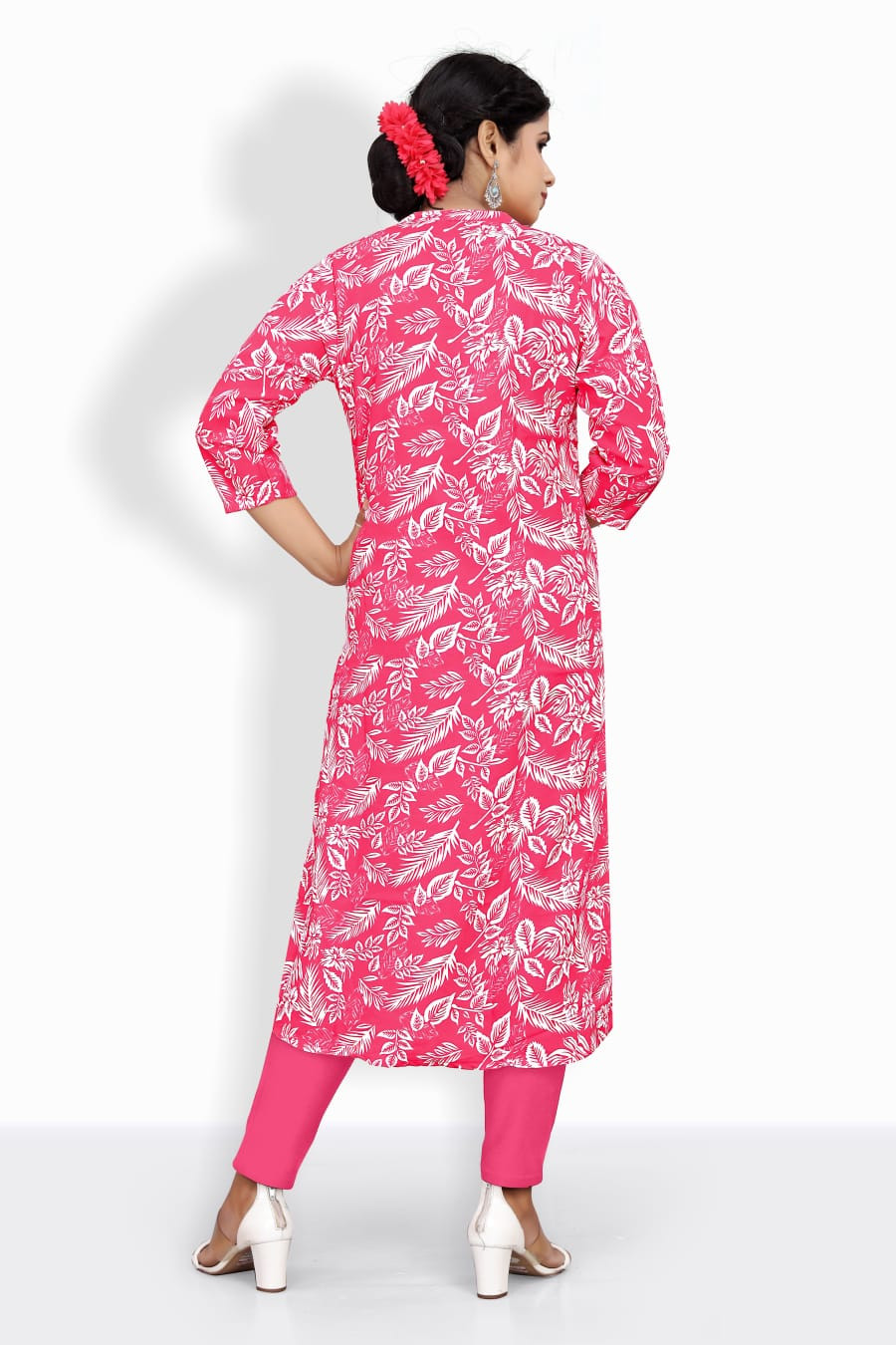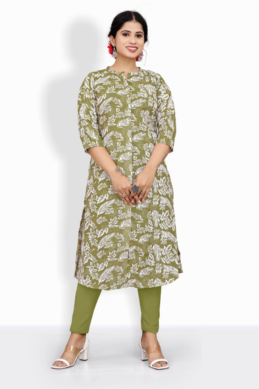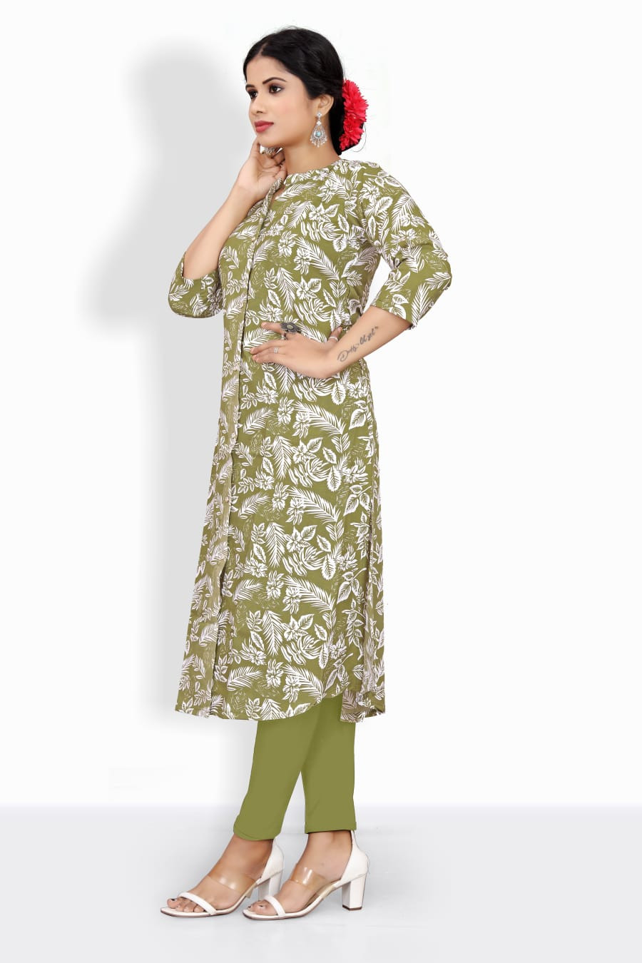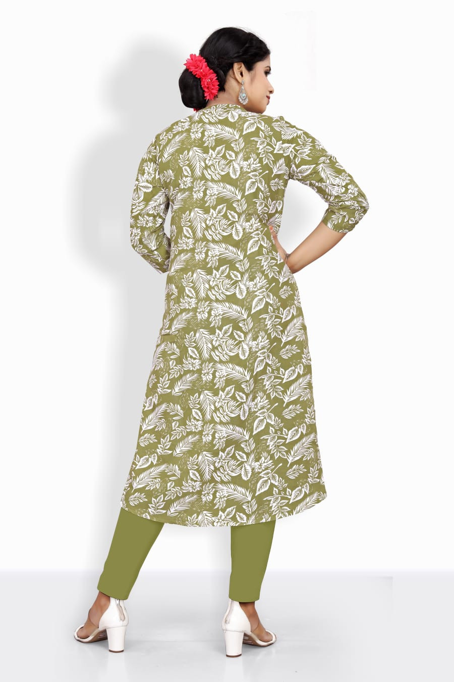 The charming contrast of soothing pink with earthy mehendi green creates a refreshing, ethnic appeal. Perfect for crafting kurtis, tunics, or fusion wear, this fabric blends tradition with a modern flair.