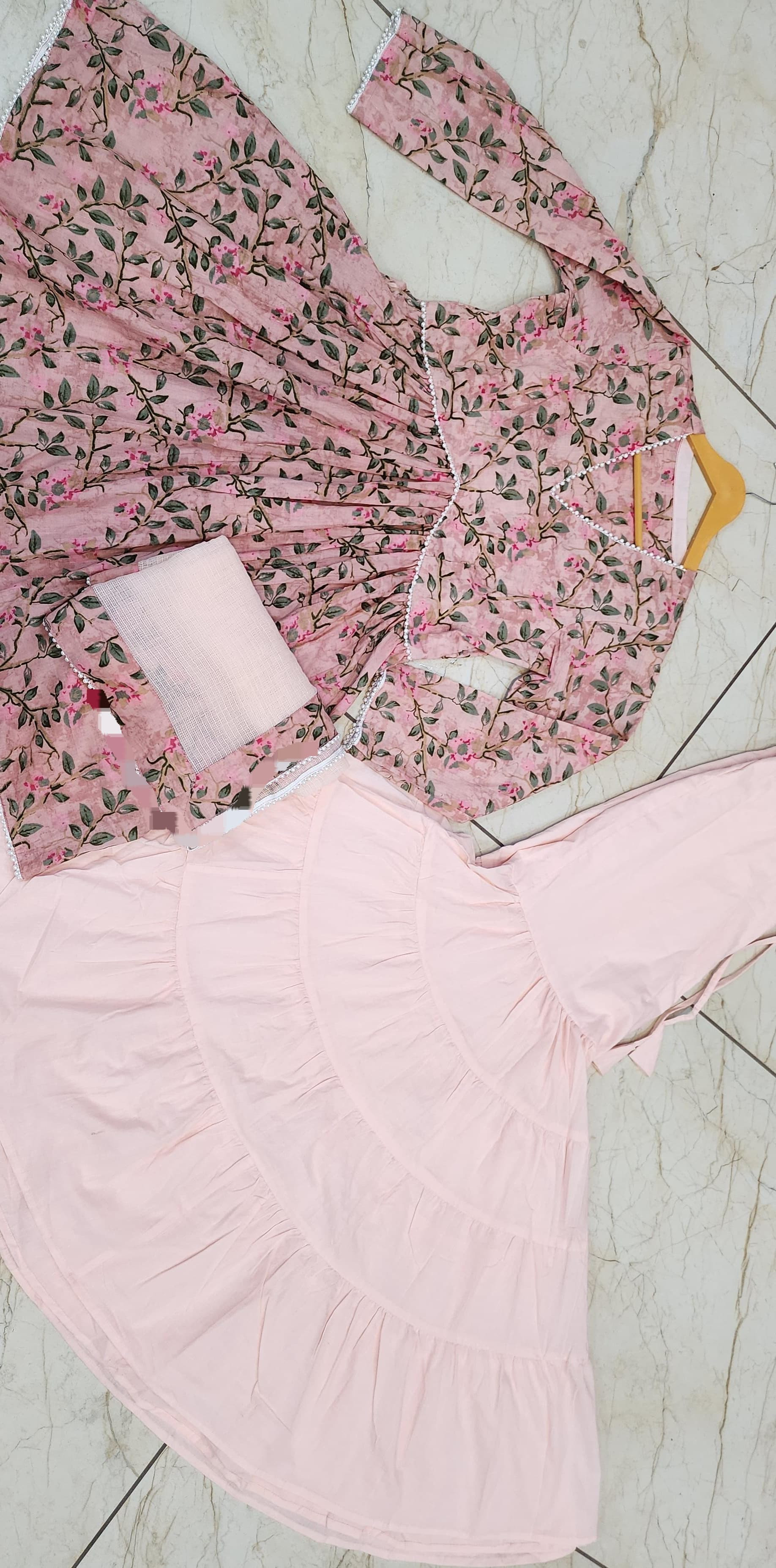 Step into effortless elegance with this pastel pink printed cotton Kurti and Sharara set, paired with a lightweight Kota Doria Dupatta in a graceful forest green accent.
