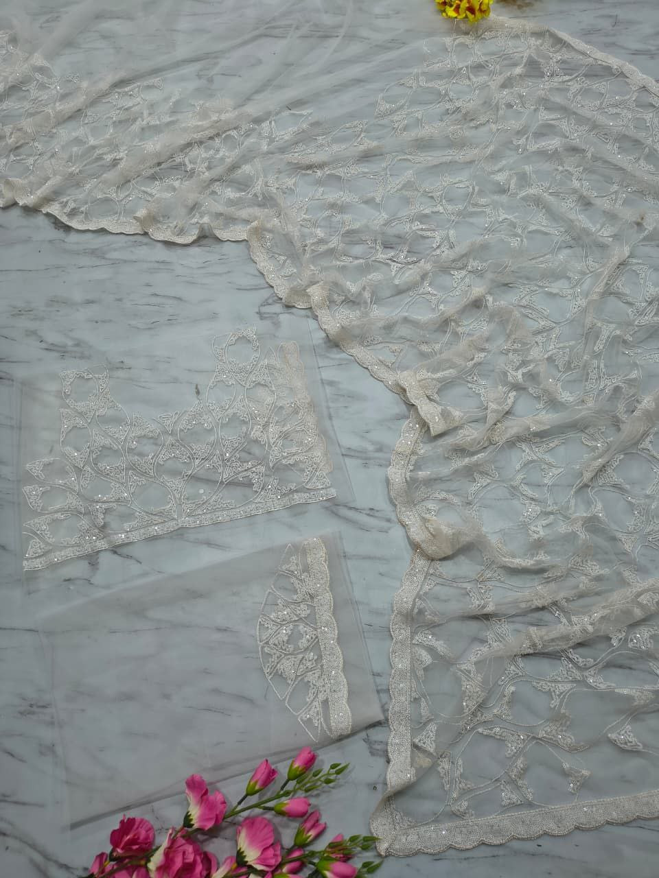 • Blouse Fabric: Premium Butterfly Net with Sequins Work (Unstitched)