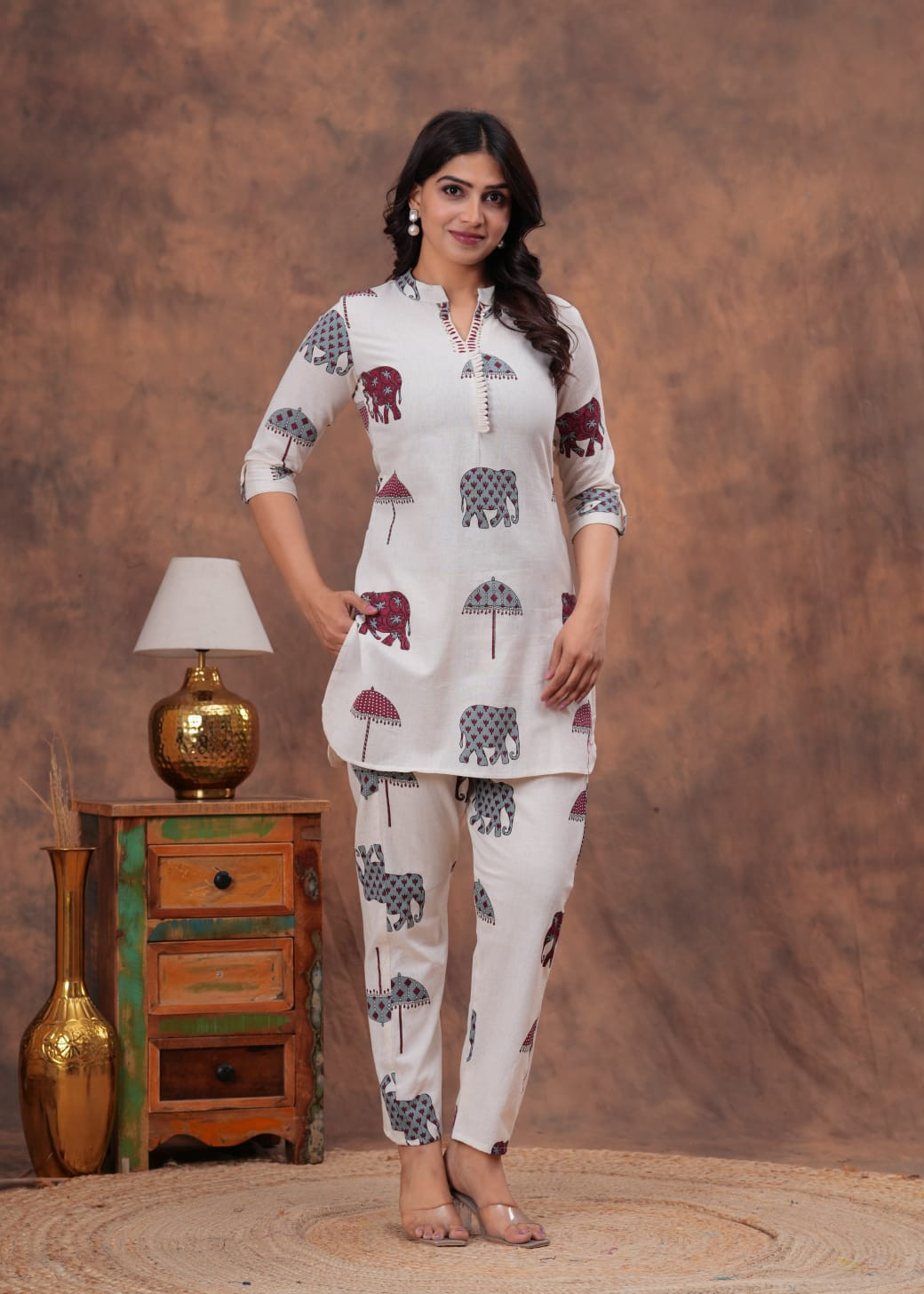 Step into timeless elegance with our Premium Cotton Flex Co-ord Set, crafted from breathable, skin-friendly cotton flex fabric and dyed using natural vegetable dyes for a sustainable and skin-safe experience. This set is adorned with a traditional Rajasthani hand block print, showcasing intricate patterns and iconic ? elephant motifs that reflect the rich heritage of Rajasthan.