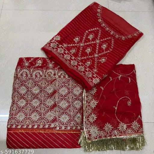 The ensemble includes a heavy contrast odhni, adorned with four-side work, detailed zaal craftsmanship, and gorgeous gotta turris, giving it a majestic finish. The kurti is enhanced with heavy galla work, offering a regal touch to the complete outfit. Comes fully stitched with astar and magji, ensuring premium quality and durability.