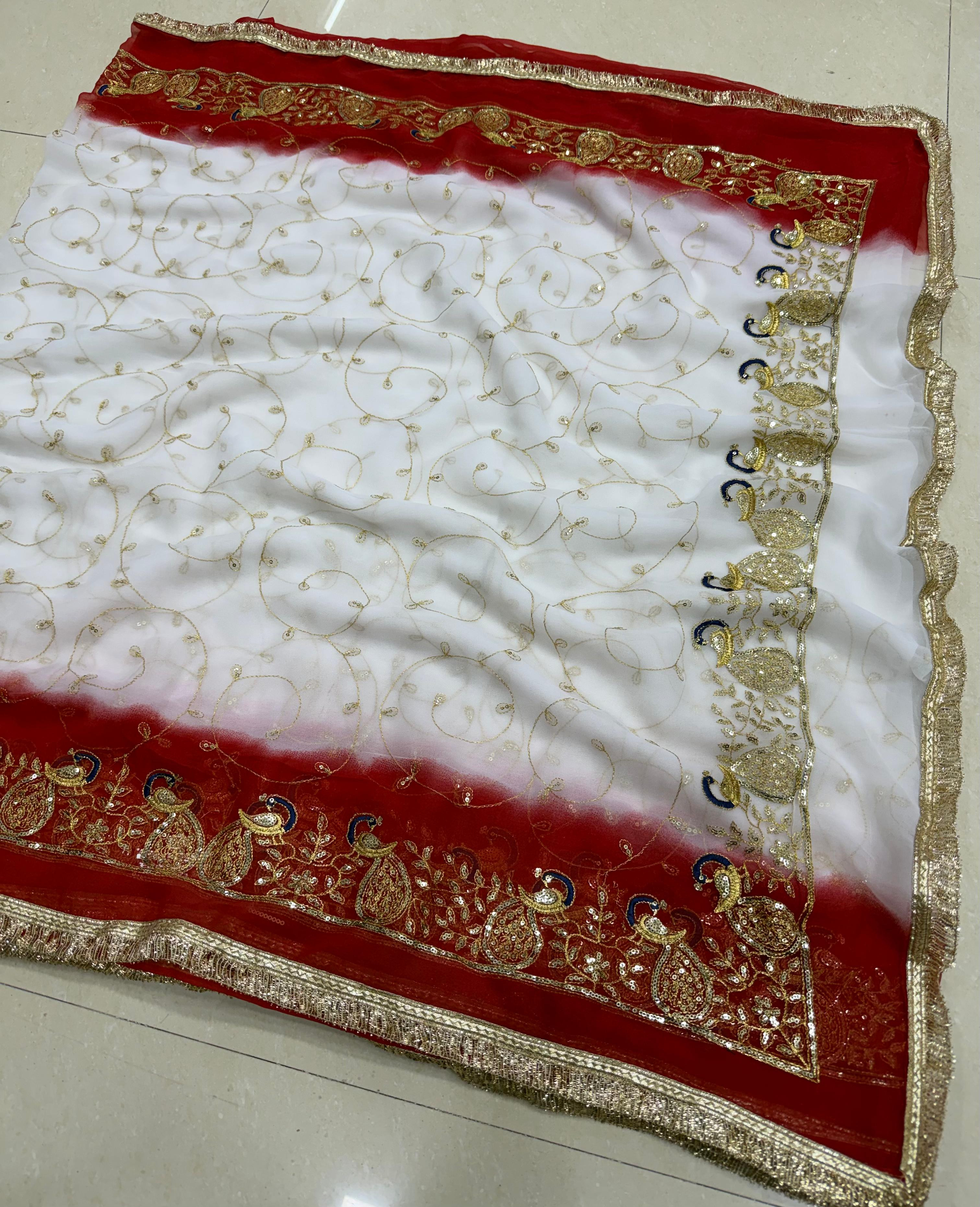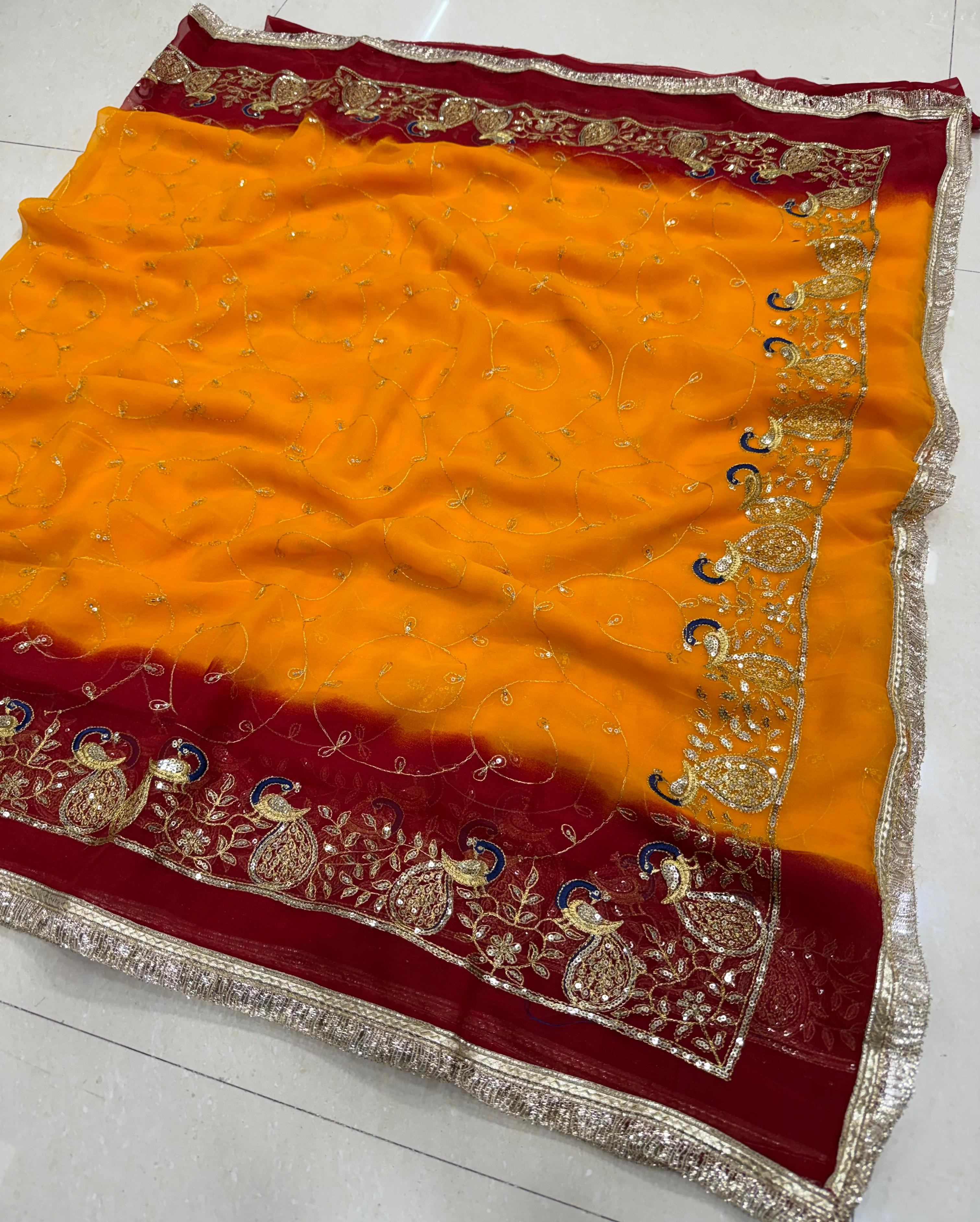 Celebrate tradition with elegance in this Premium Faguniya Rajwadi Saree, crafted from high-quality Georgette fabric that offers a graceful drape and lightweight comfort. The saree features subtle sequence work, giving it a refined festive and ethnic look without being overly heavy. Perfect for traditional functions, festive occasions, and cultural celebrations.