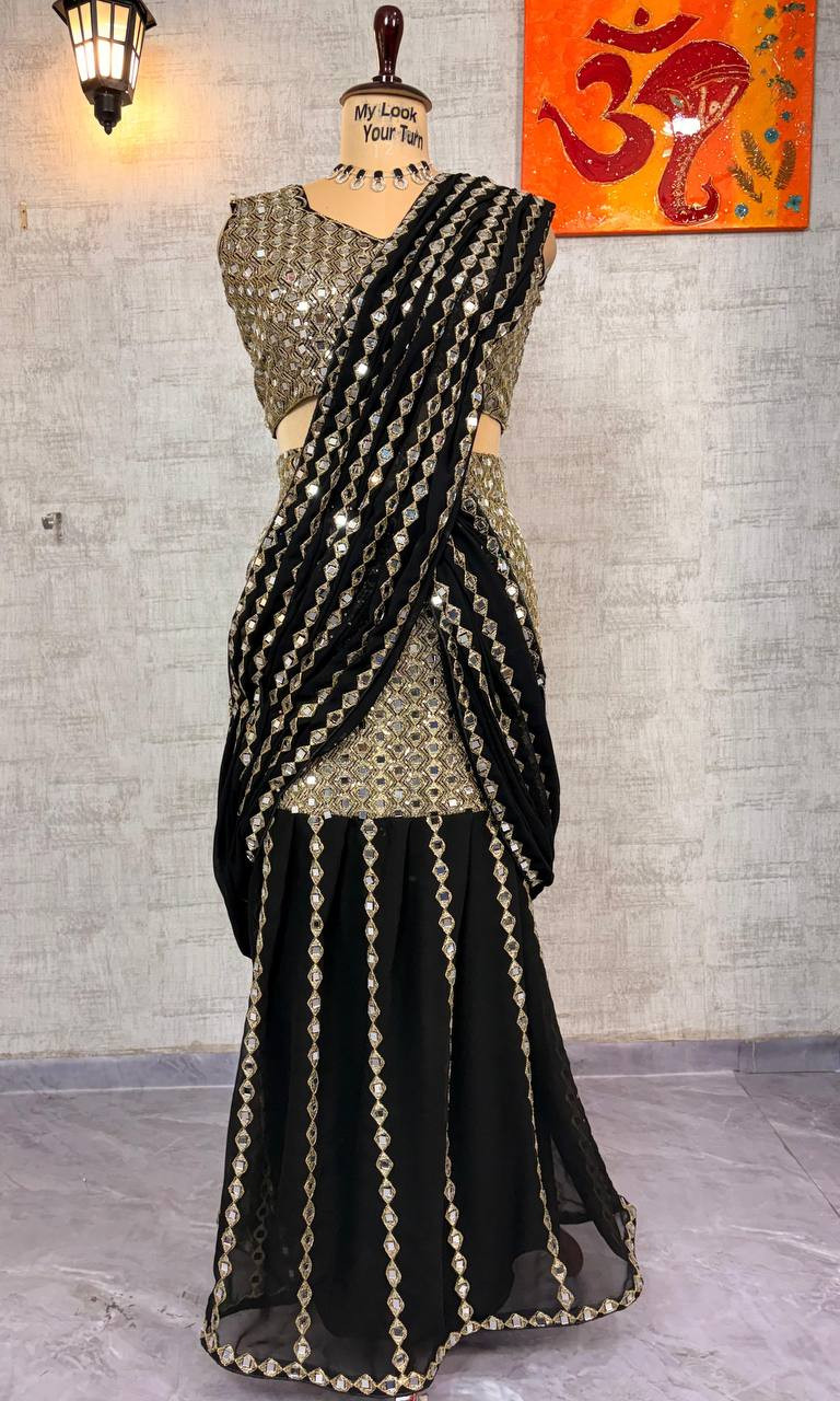 Step into effortless elegance with this Premium Faux Georgette Ready-to-Wear Saree (D.No: BD-1811), designed for women who love glamour without compromising on comfort. Crafted from lightweight faux georgette, this saree features exquisite embroidery sequins work with real mirror detailing, giving it a rich and festive appeal.