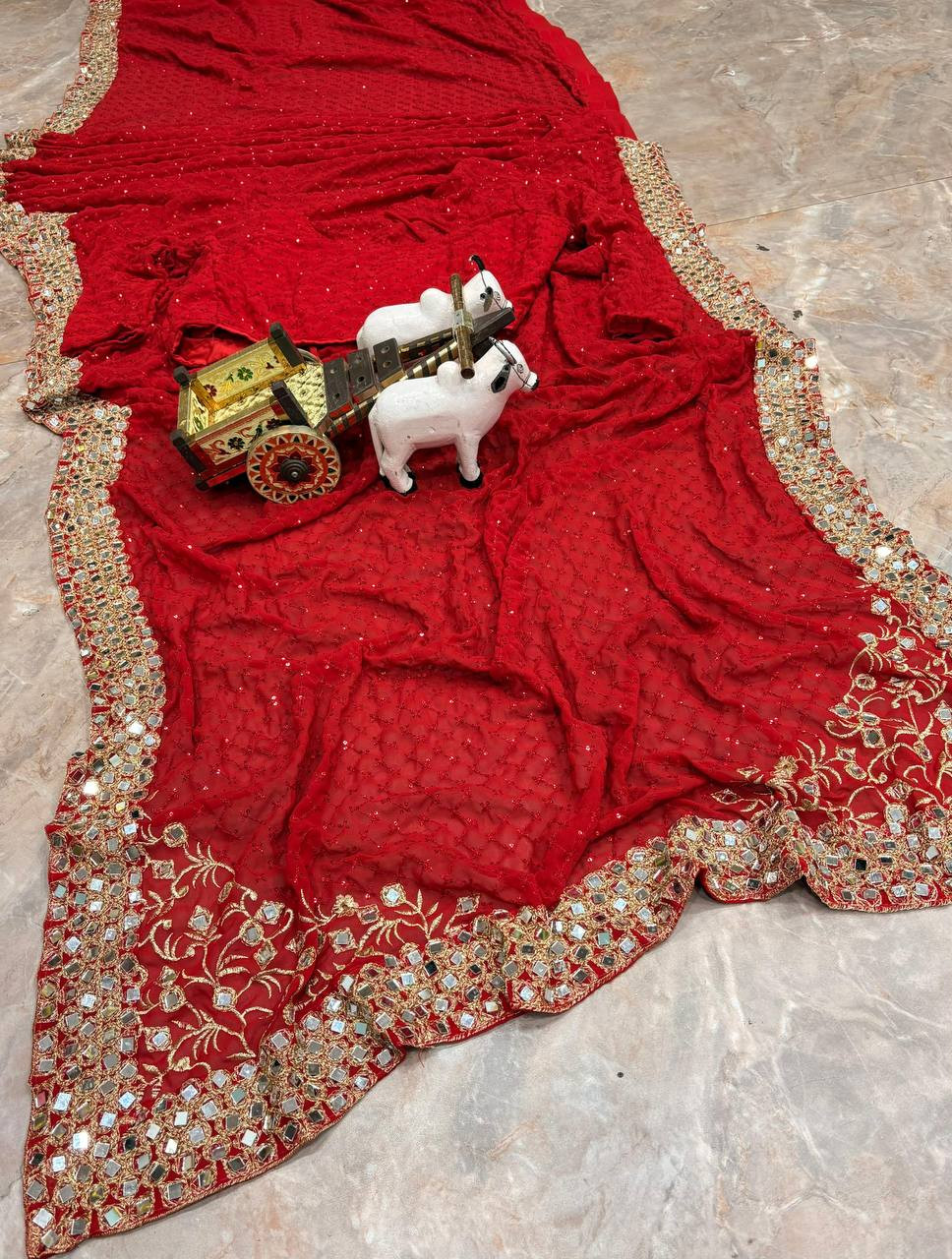Step into effortless elegance with this Premium Faux Georgette Ready-to-Wear Saree, designed to offer the perfect balance of glamour and comfort. Crafted from lightweight faux georgette, this saree features exquisite embroidery sequins work enhanced with real mirror detailing, making it ideal for festive occasions, parties, and celebrations.