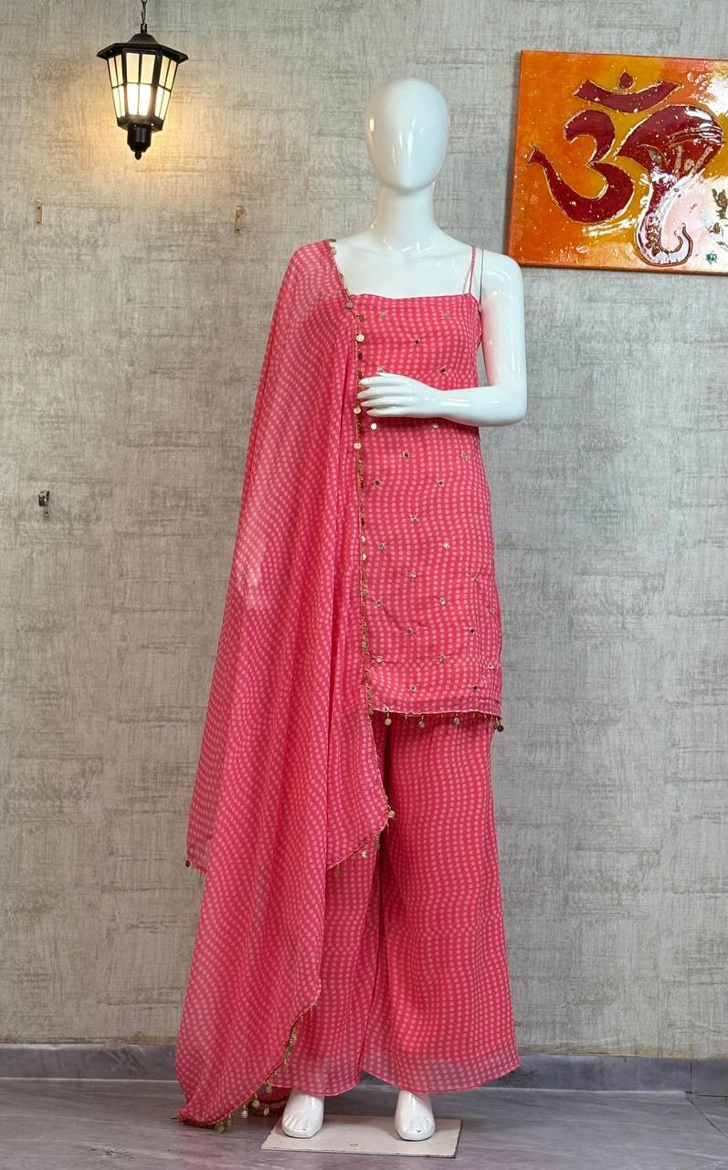 Step into elegance with our Premium Quality Faux Georgette Top–Palazzo Set (D.No: BD-1803) — designed for those who love luxury with comfort. This stunning ensemble features an exquisite blend of real mirror work and rich digital prints, creating a look that is graceful, modern, and effortlessly classy.