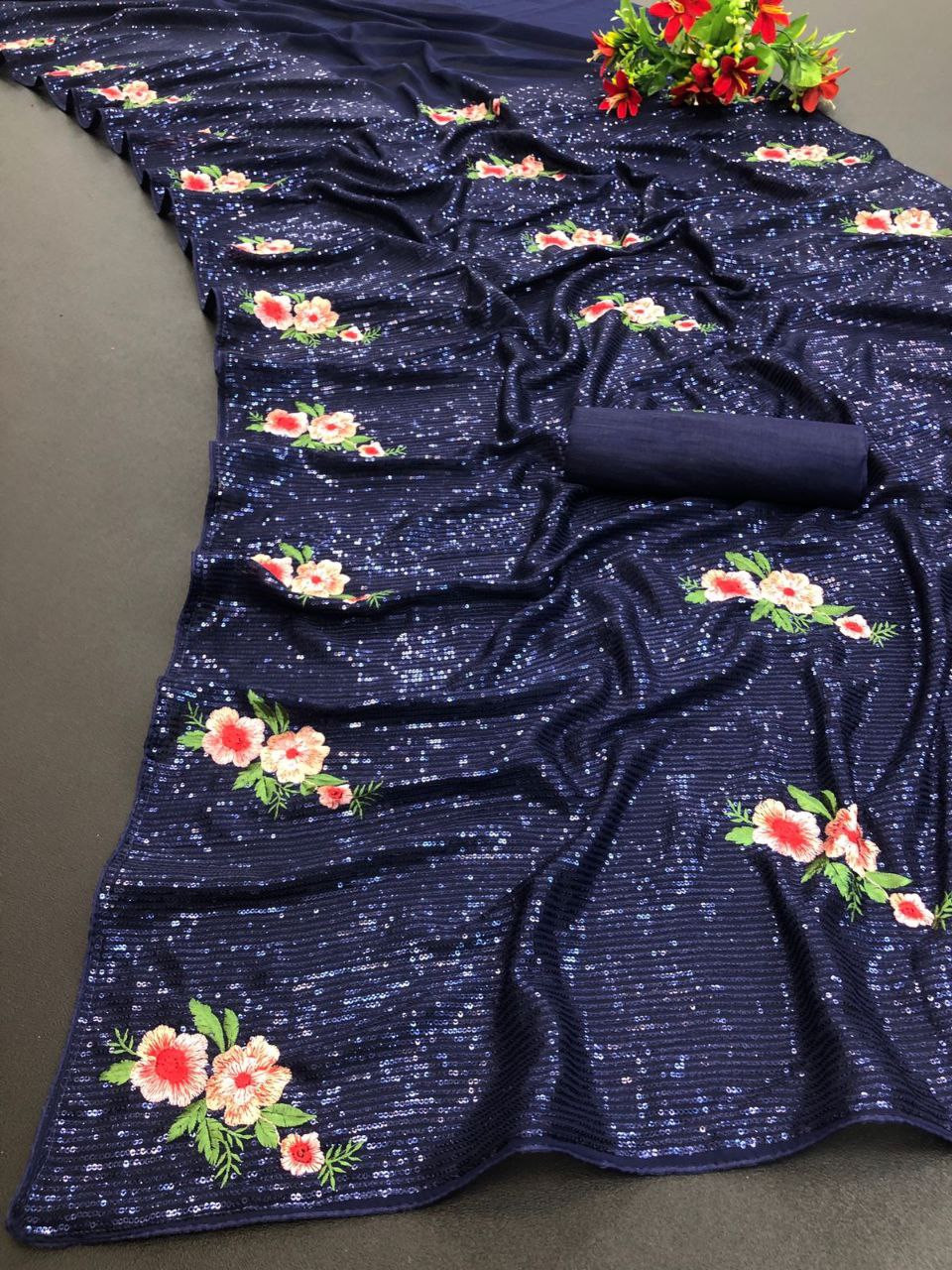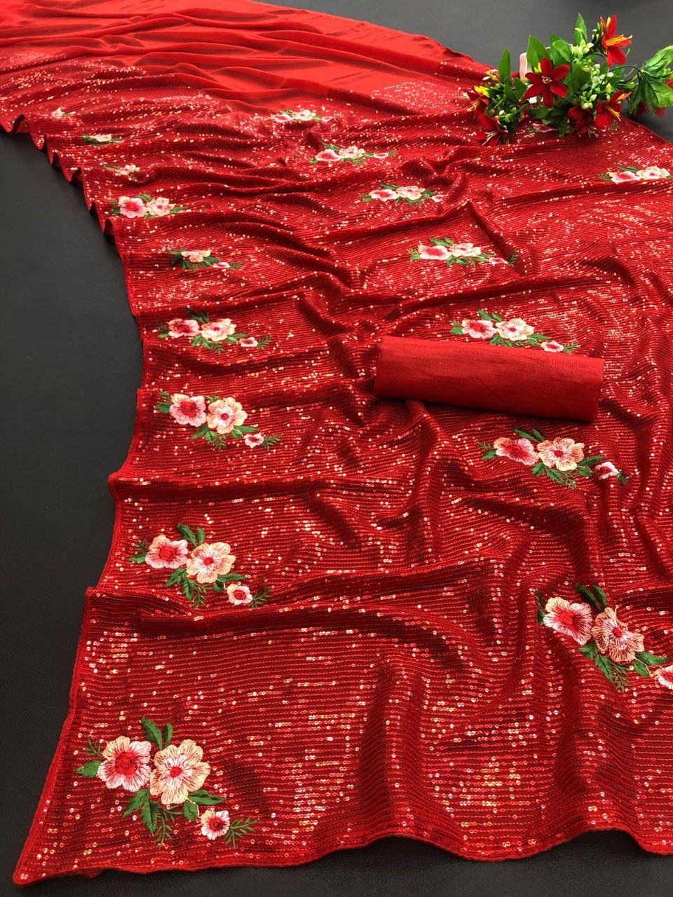 • Saree: Premium Georgette with Beautiful Sequins Work and Multi Thread Embroidery Work