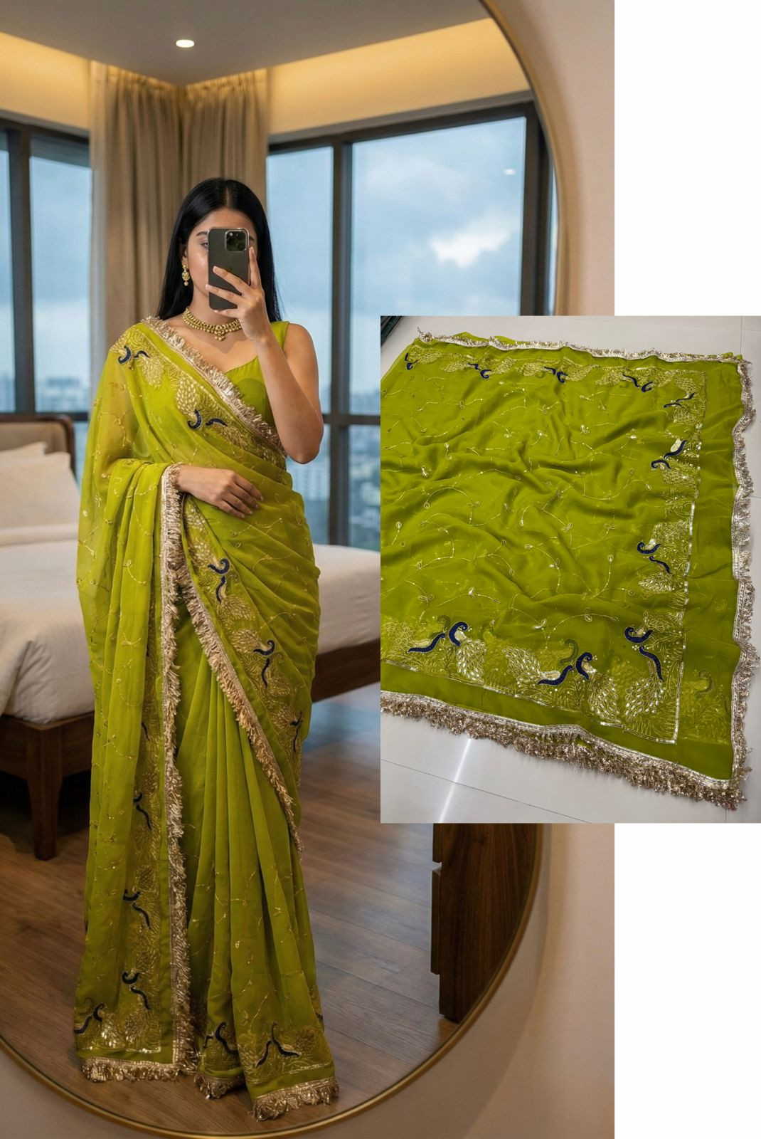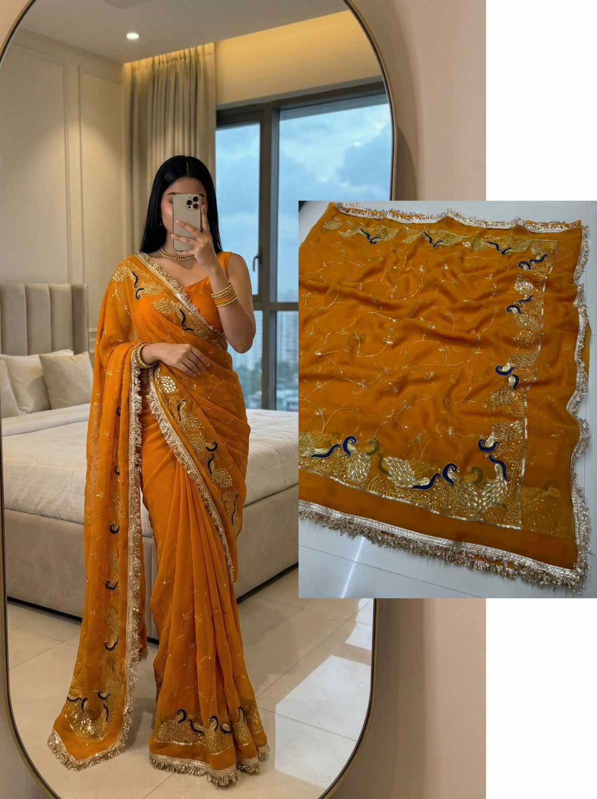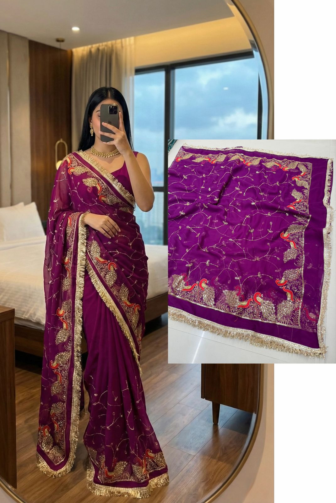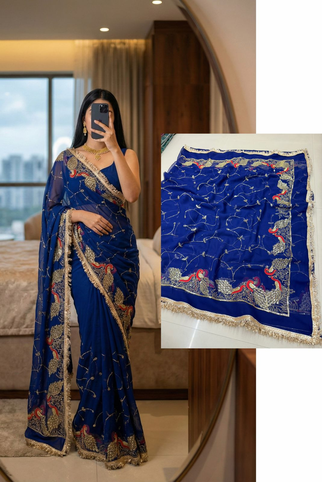 Premium Pecock Embrodred Rajputi Saree with Elegant Sequence Work
