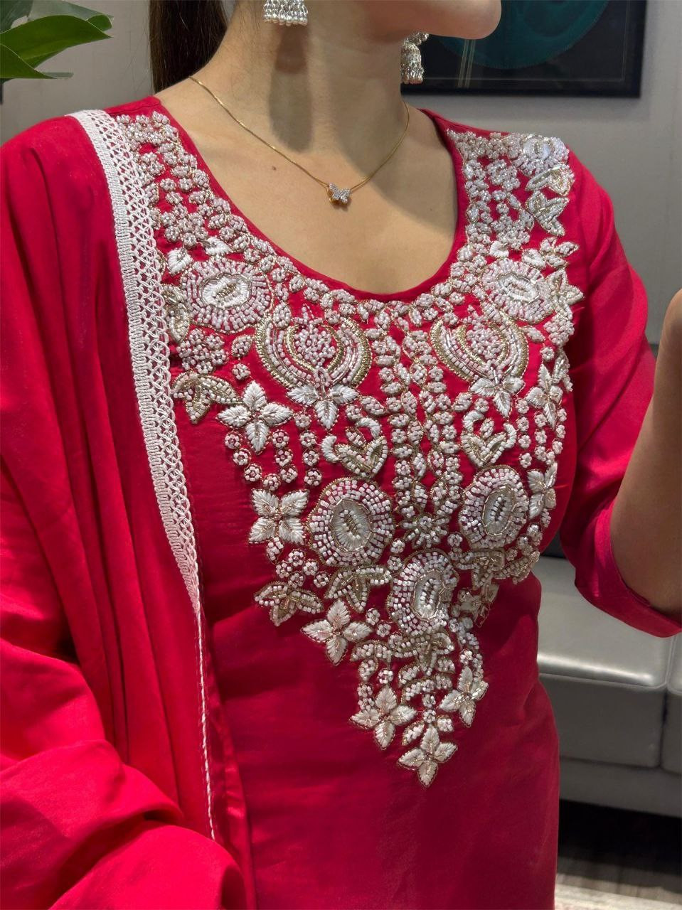 Elevate your ethnic charm with this Premium Pink Cotton Silk Kurta Set, beautifully detailed with handwork embroidery for a touch of elegance. The soft cotton silk fabric ensures comfort and luxury, while the matching pant and silk dupatta complete your graceful festive look. Perfect for weddings, parties, and traditional occasions.