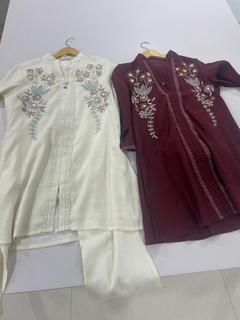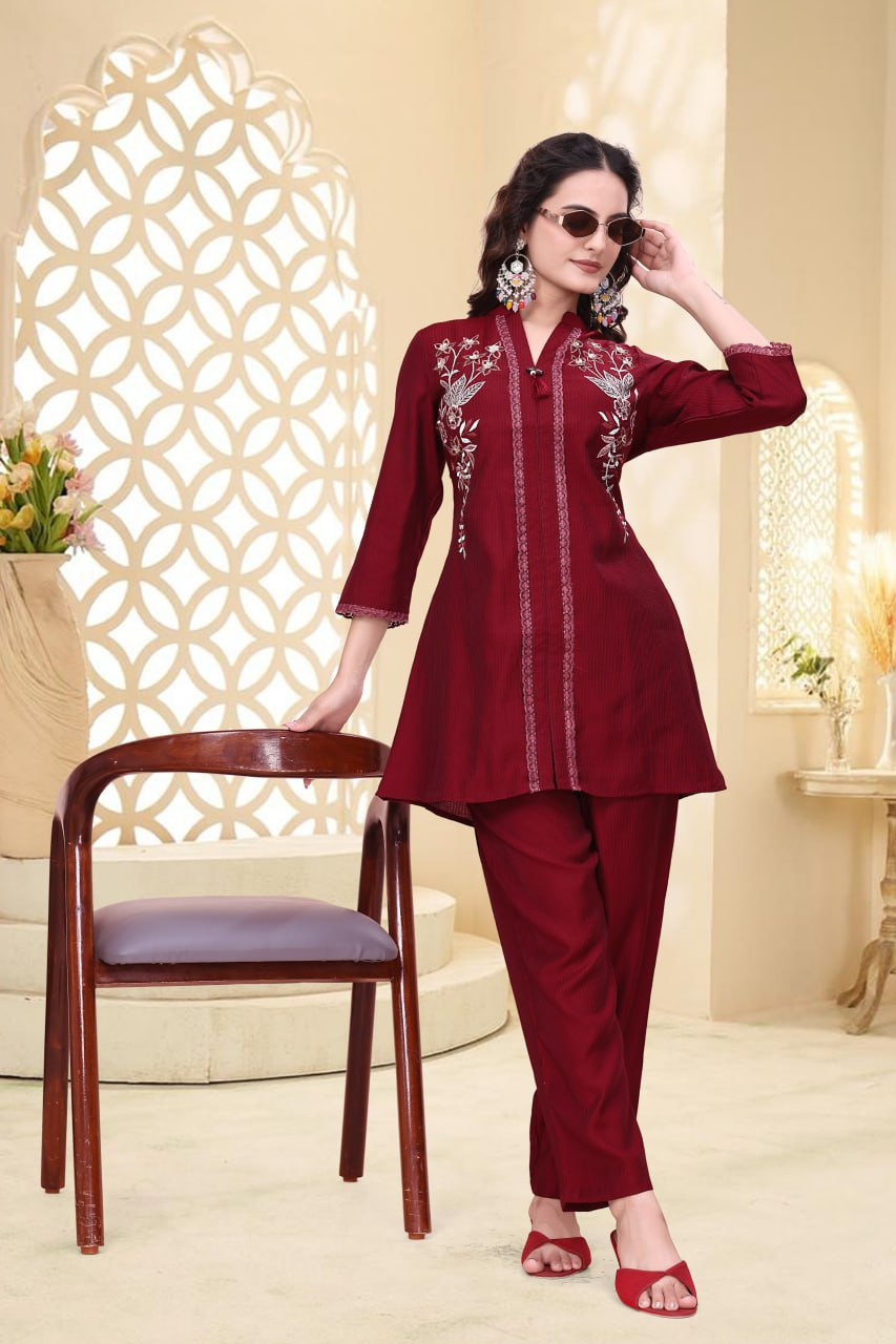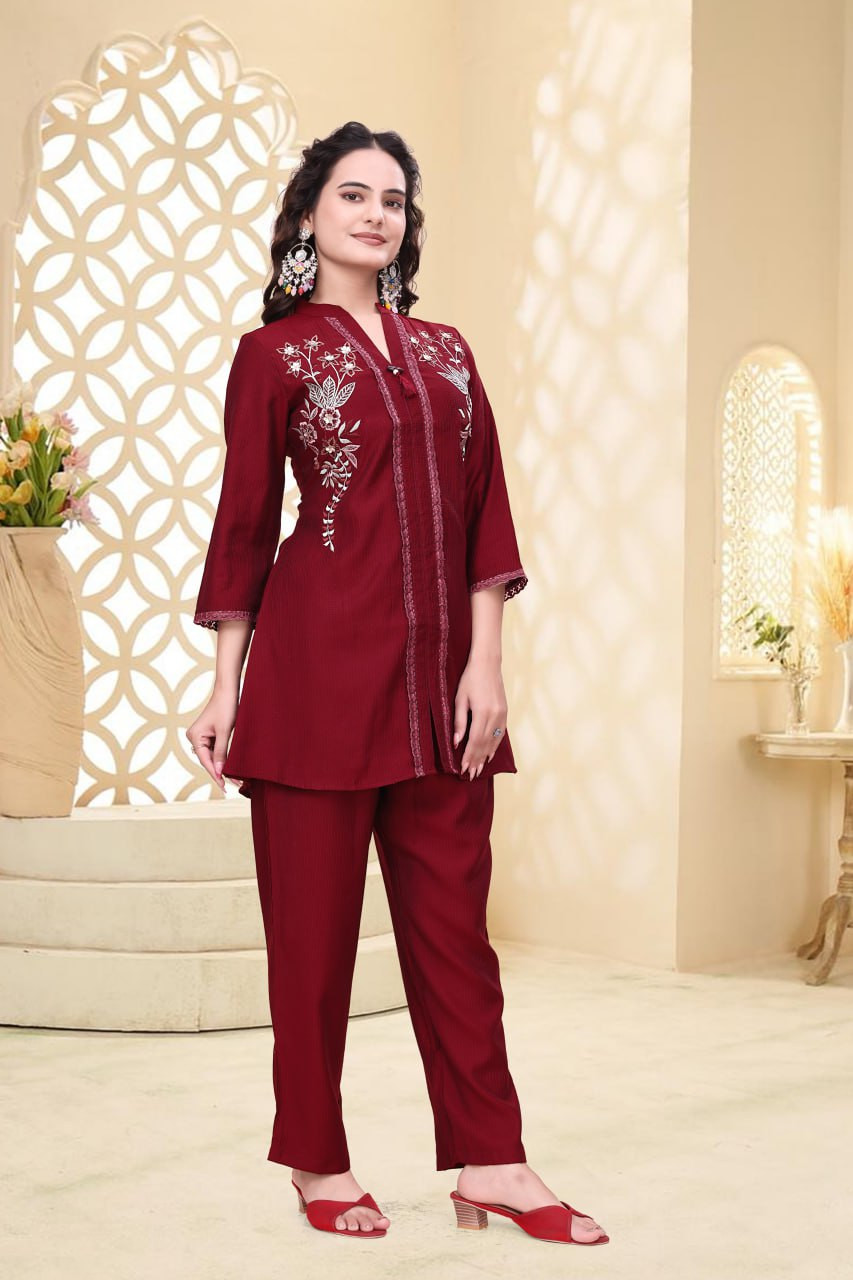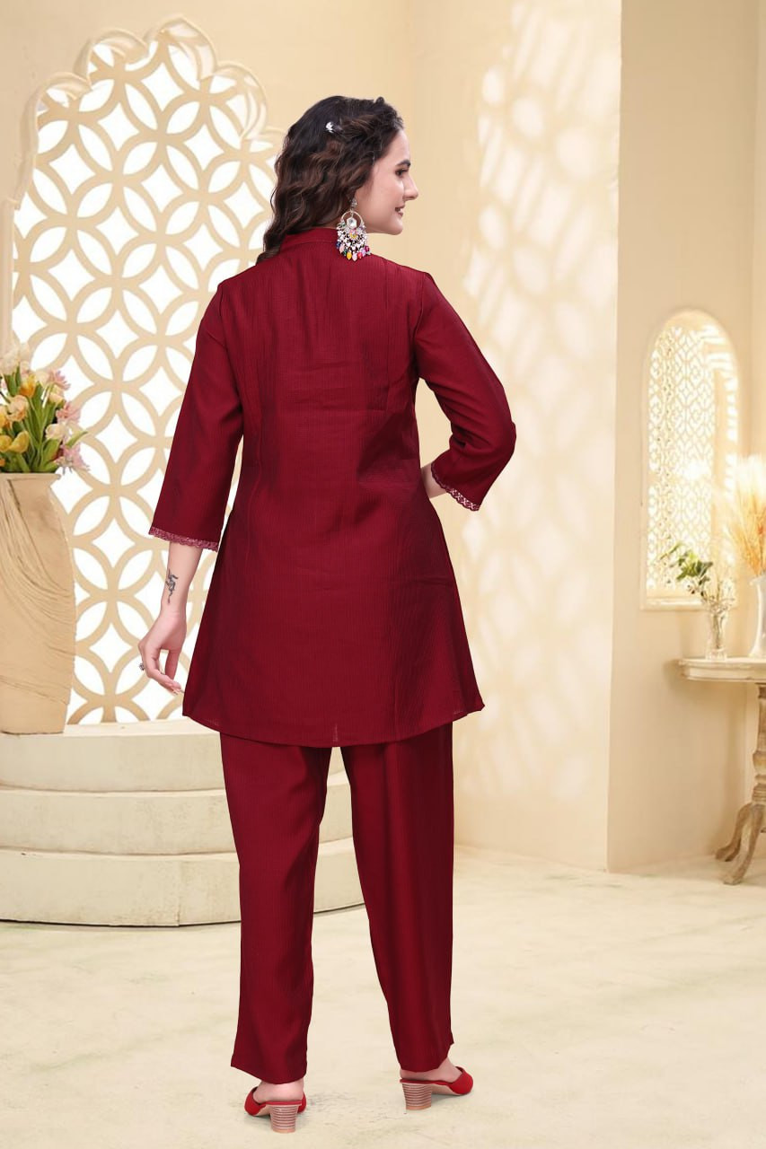 The subtle handwork detailing adds a touch of elegance, making it perfect for casual outings, office wear, festive gatherings, or smart day wear. The coordinated top and bottom create a balanced silhouette that’s both modern and graceful.