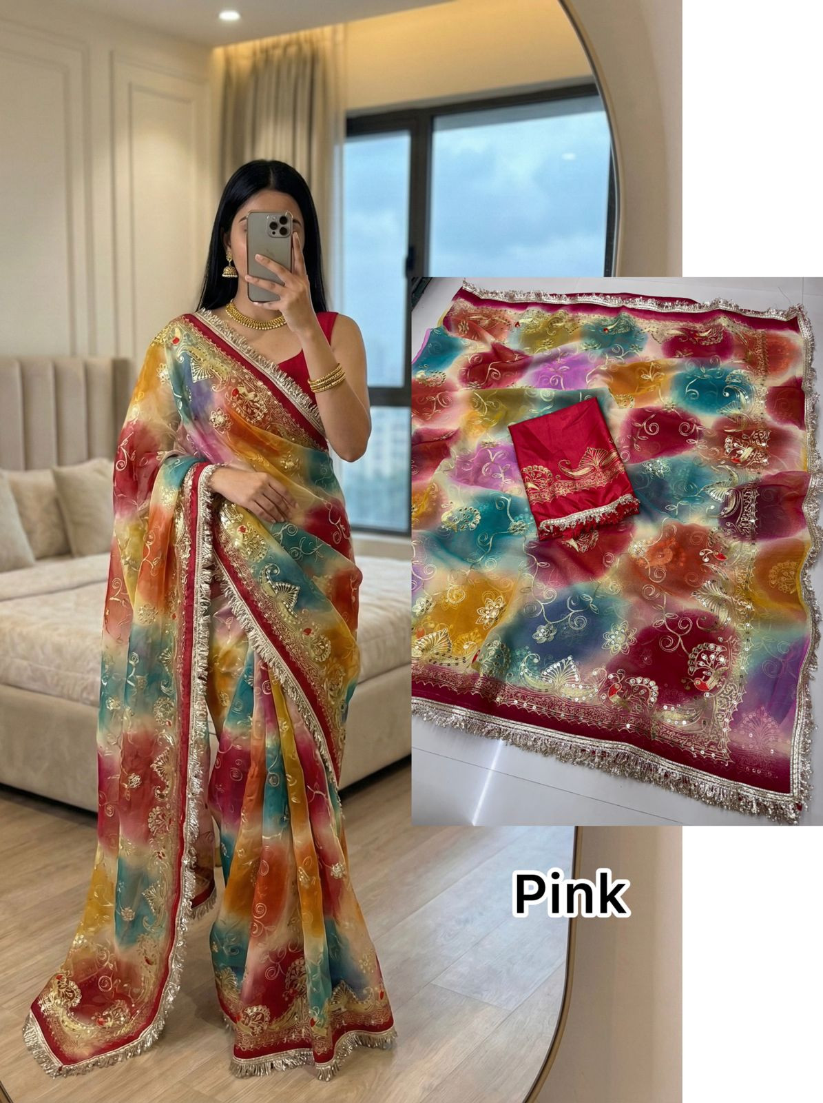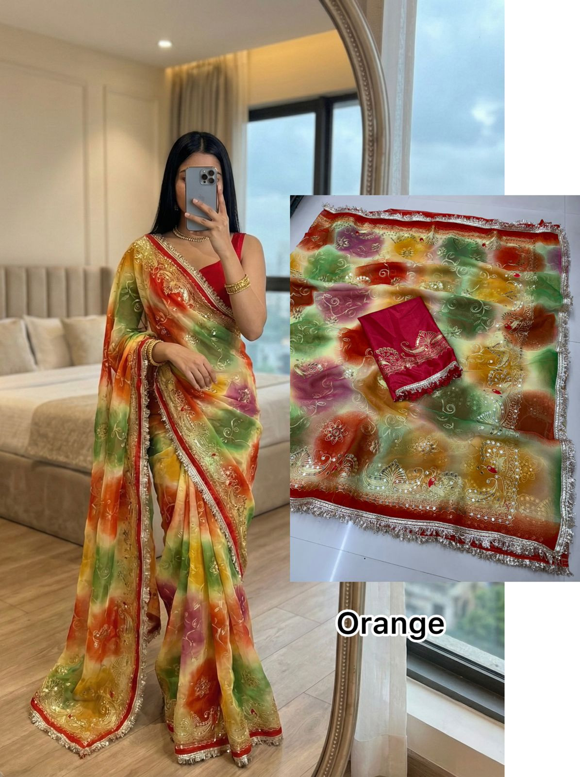 Elevate your ethnic style with this Premium Royal Georgette Saree, crafted from original royal georgette fabric for a soft, flowy, and luxurious drape. The saree is beautifully adorned with 5mm less sequin kasab work, adding a subtle shimmer that enhances its royal appeal without being overpowering.