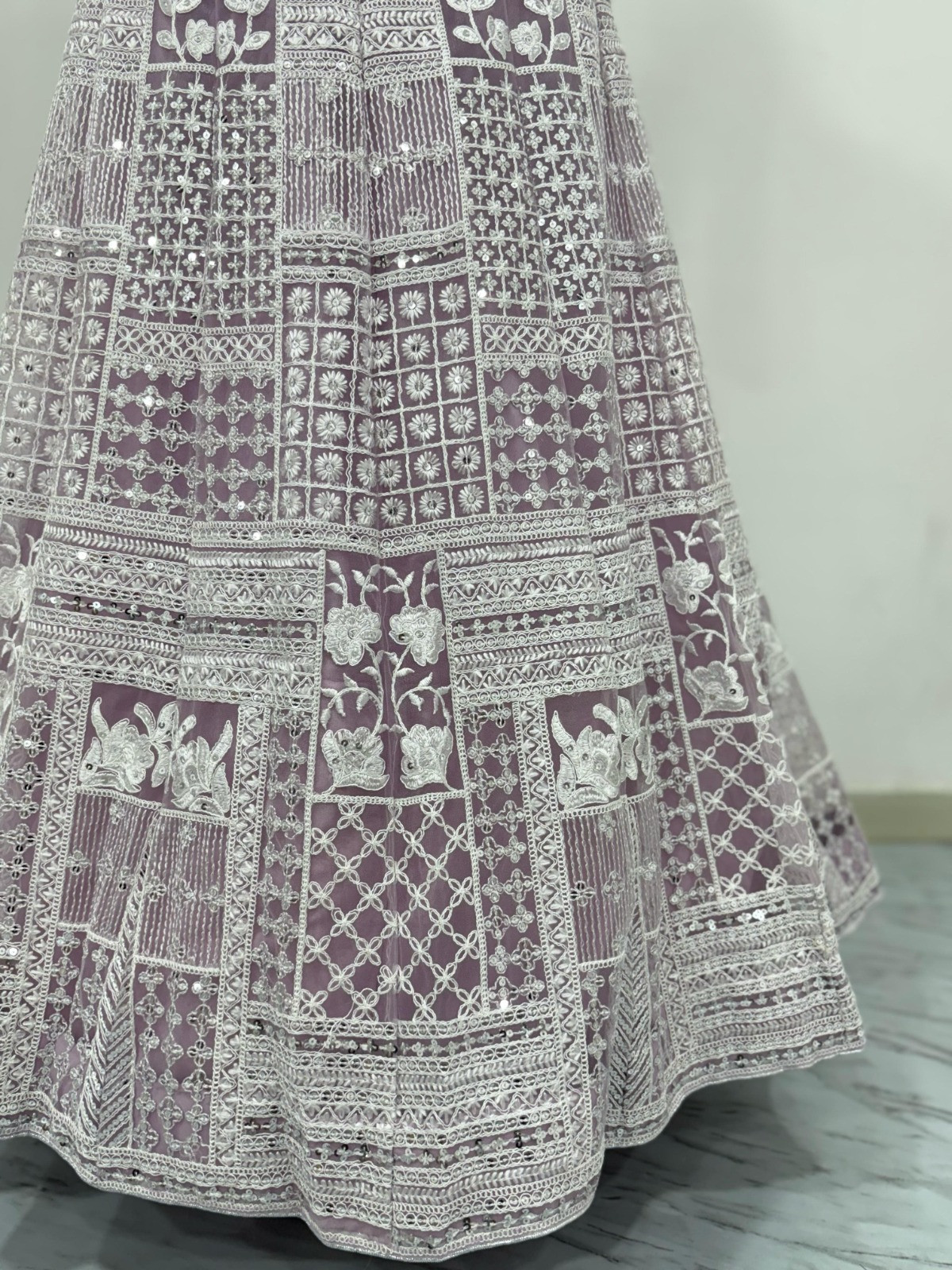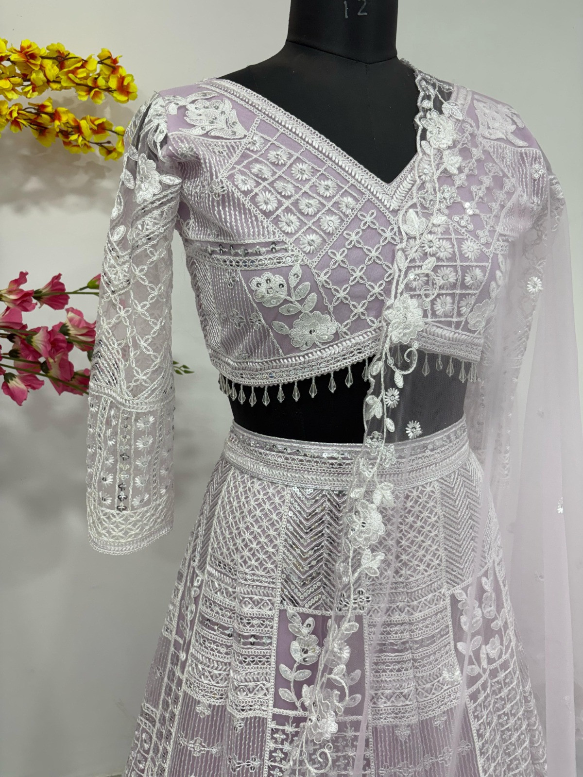 The matching blouse is adorned with detailed embroidery and sequins work on both front and back, complemented with elegant pearl lace on the sleeves. Paired with a beautifully embroidered butterfly net dupatta, this ensemble creates a complete premium ethnic look.