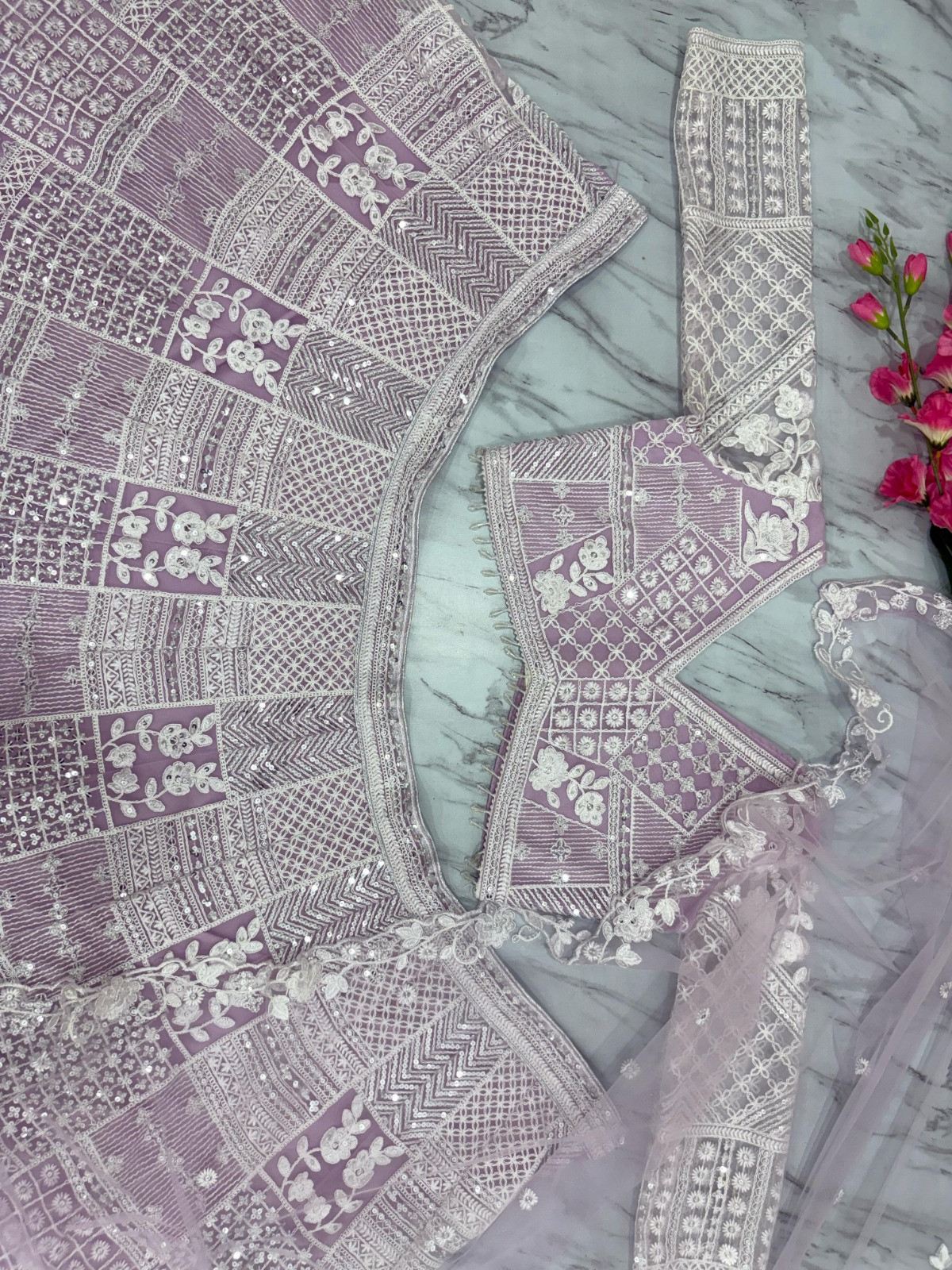 The matching blouse is adorned with detailed embroidery and sequins work on both front and back, complemented with elegant pearl lace on the sleeves. Paired with a beautifully embroidered butterfly net dupatta, this ensemble creates a complete premium ethnic look.