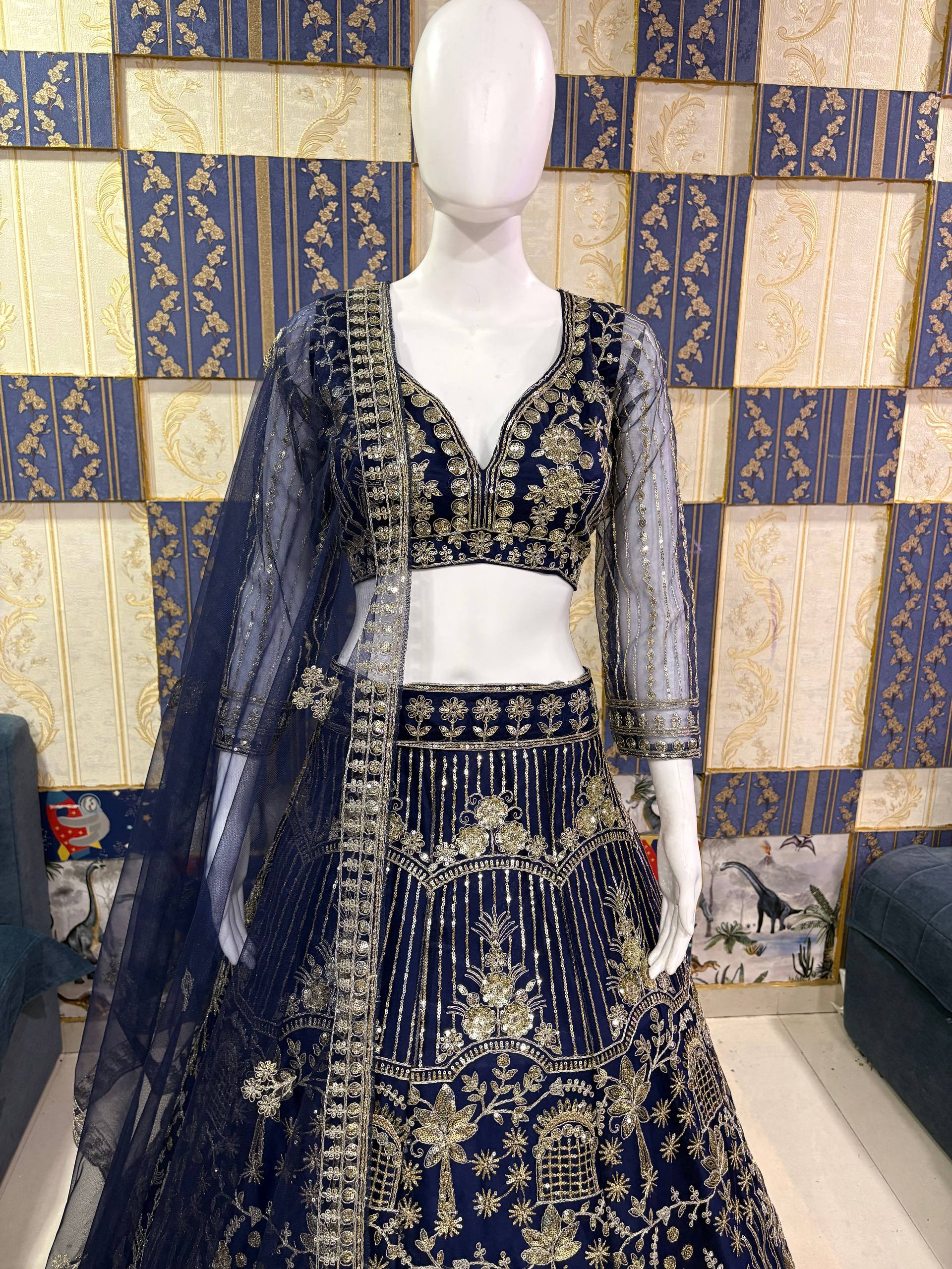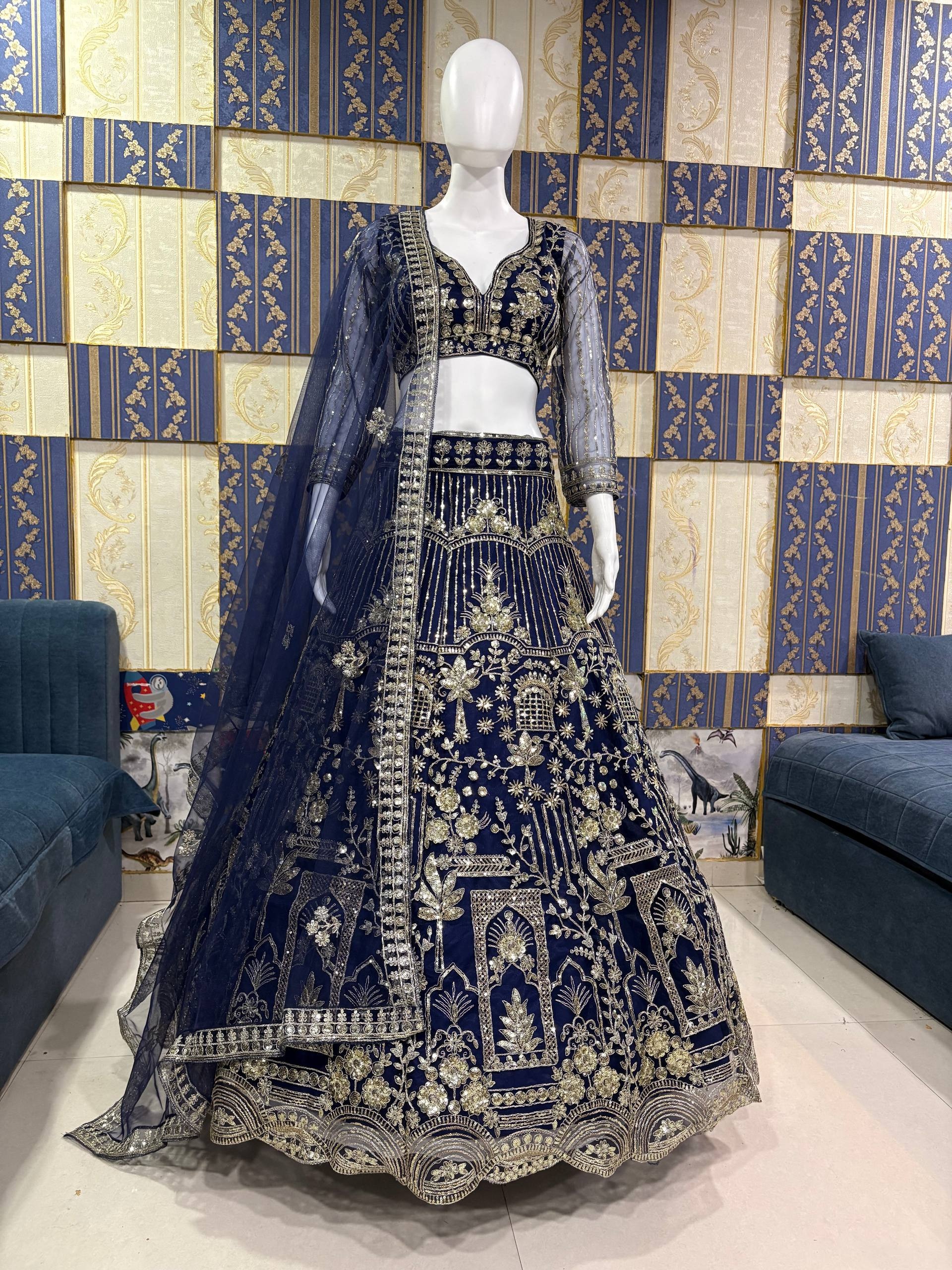 Paired with a matching unstitched blouse featuring detailed sequins coding work and a soft net dupatta, this ensemble is perfect for weddings, festive celebrations, and special occasions.