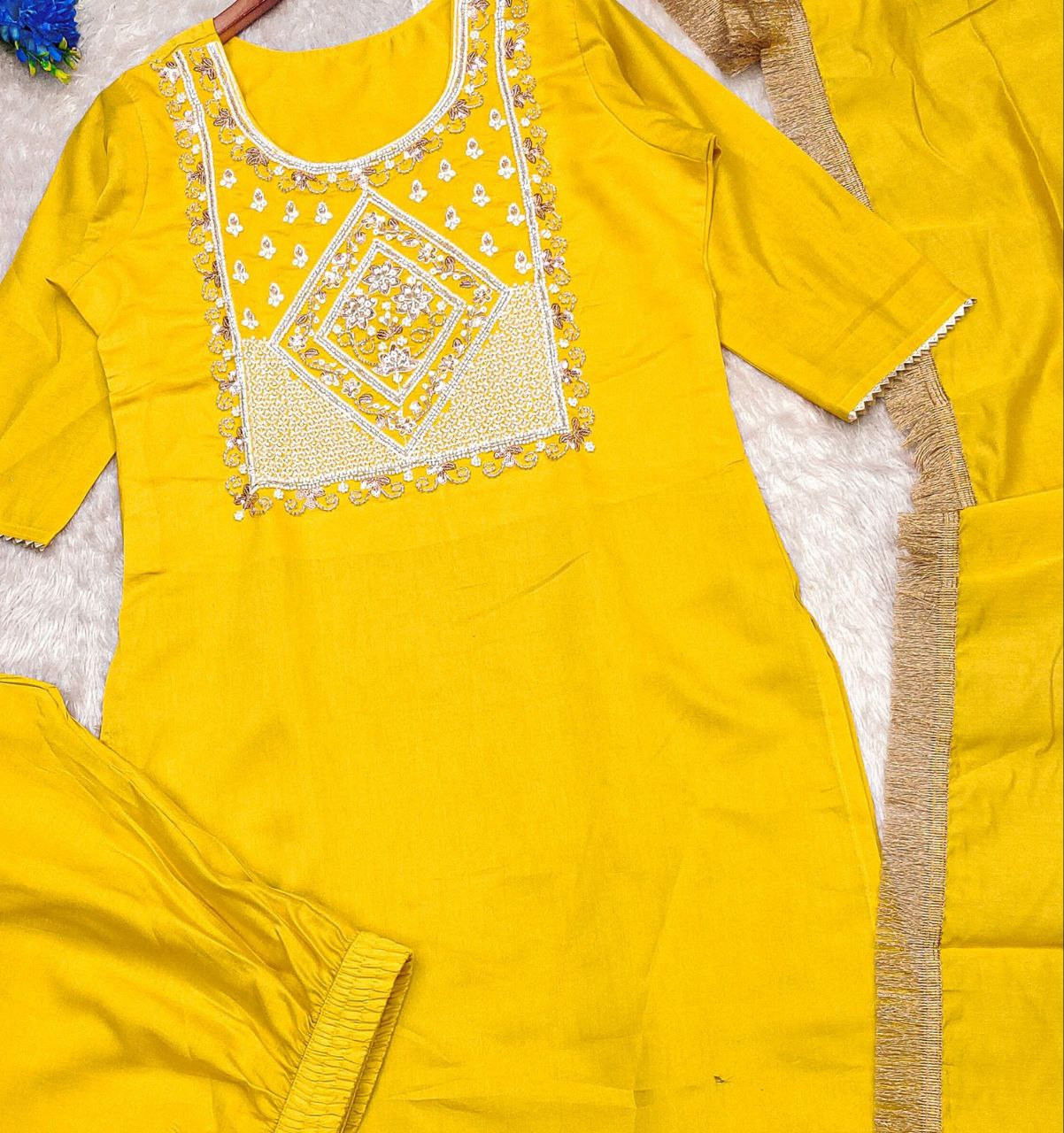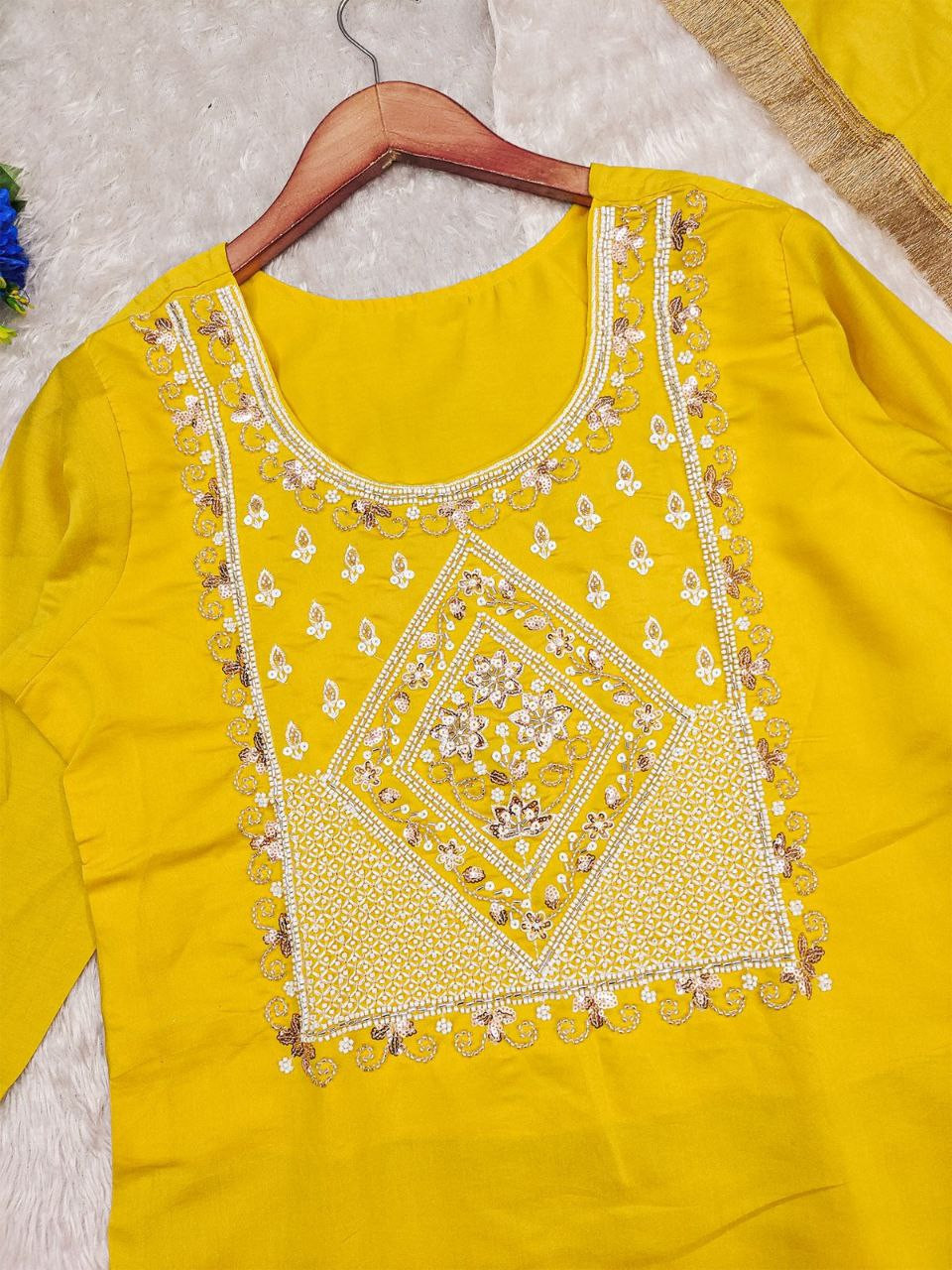 Crafted from luxurious cotton silk, this beautiful yellow kurti features delicate hand embroidery for a refined look. The ¾ sleeves and 43-inch length offer a graceful silhouette, making it perfect for festive, party, or casual occasions.