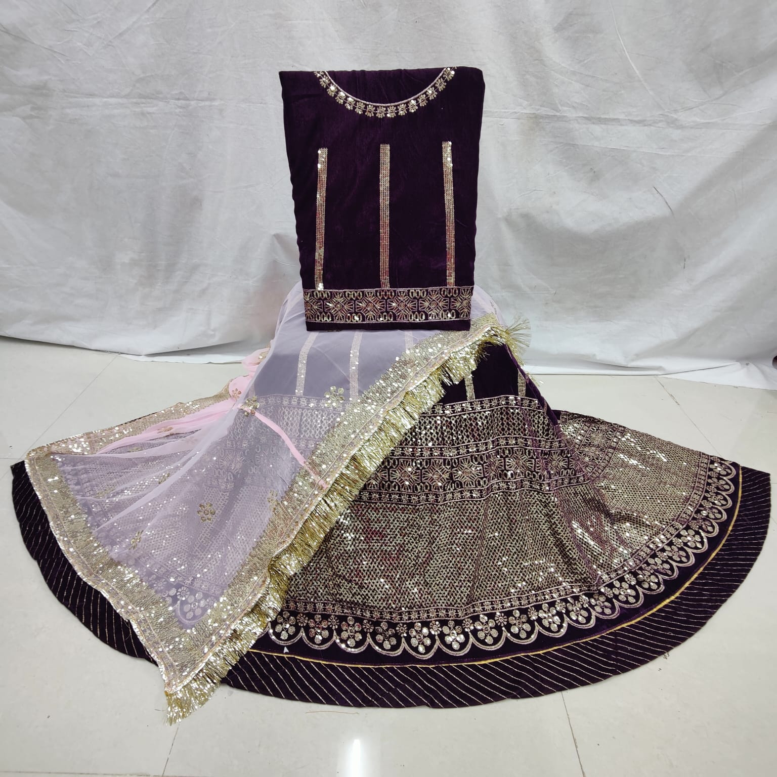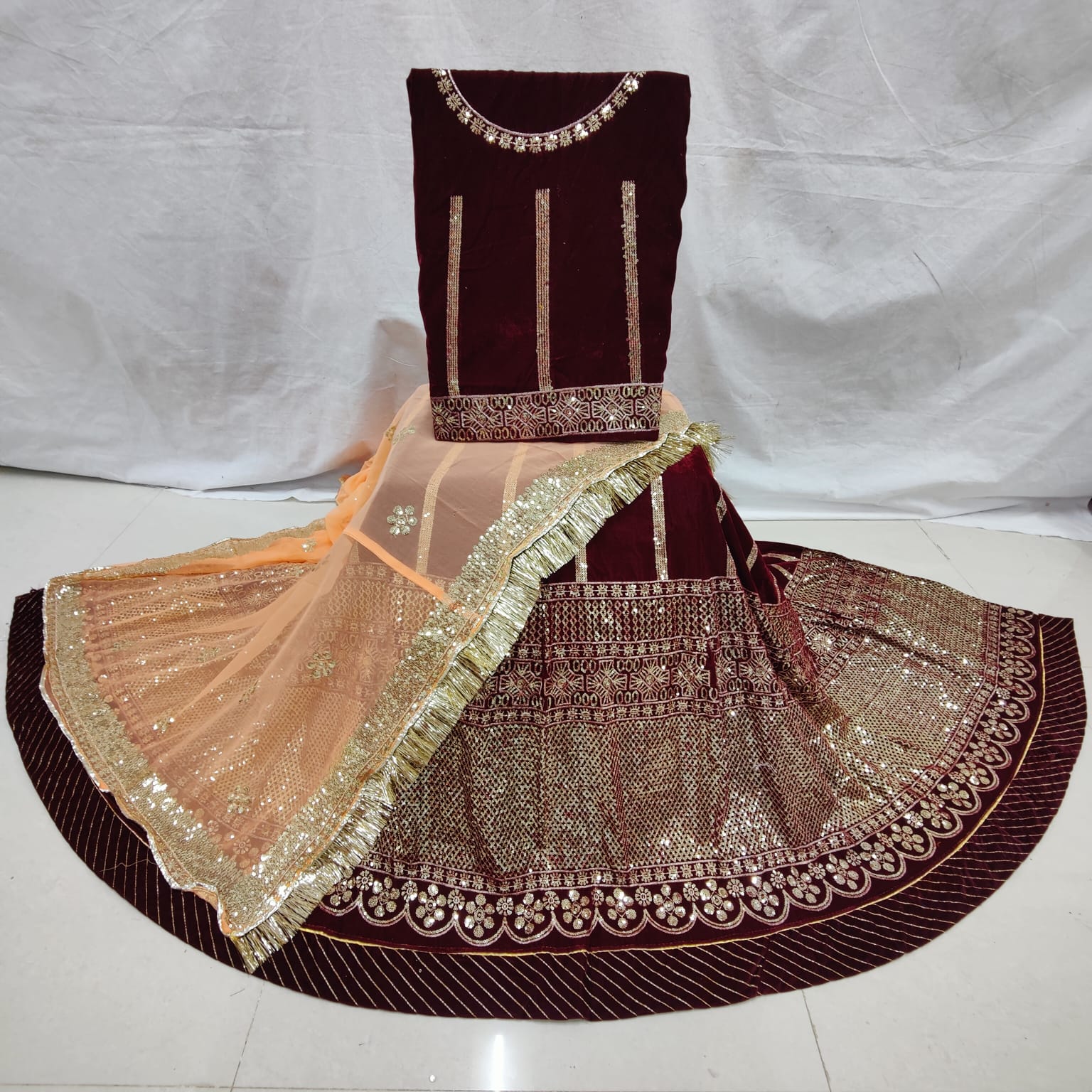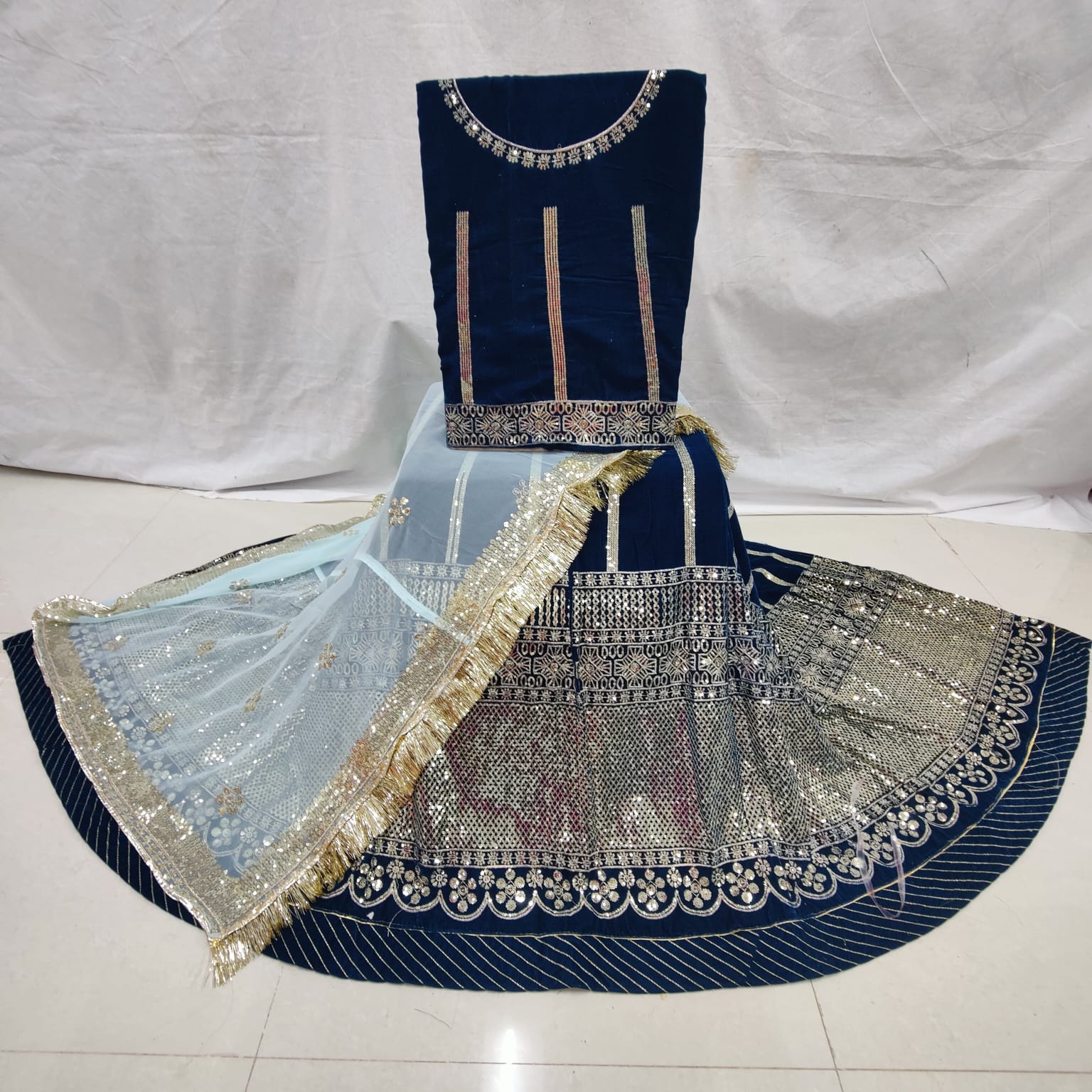 3. Heavy Galla gold multizari kurti gala work with sequence work.