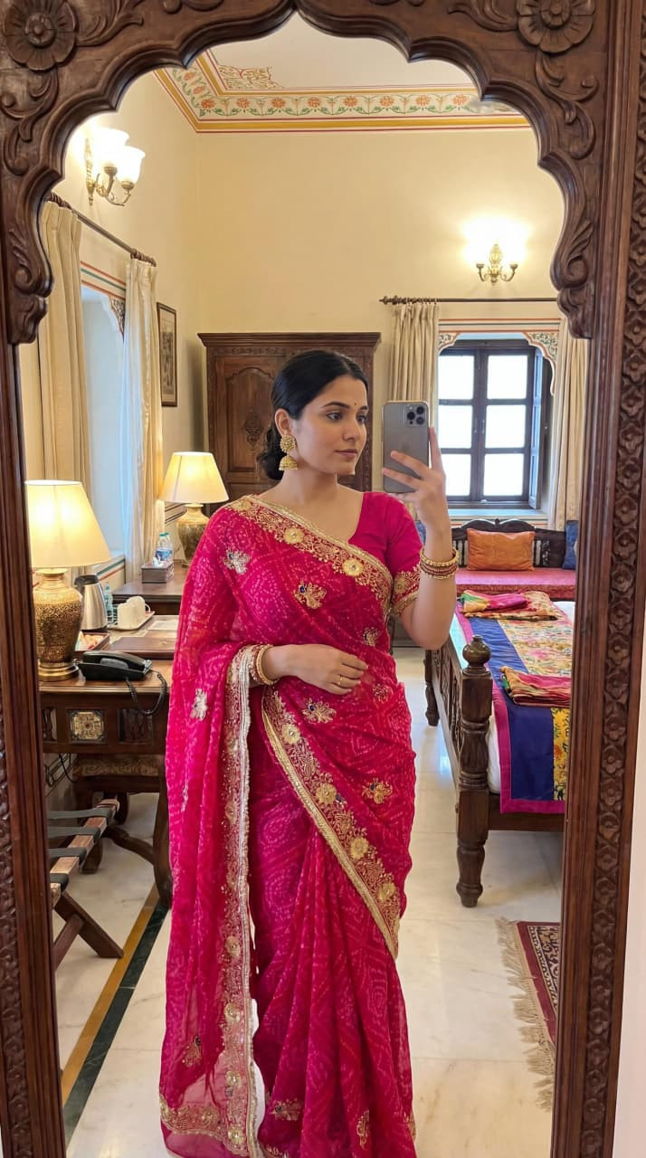 Perfect for festive occasions, cultural events, and casual traditional wear, this saree blends Rajasthani Bandhej style with modern elegance.