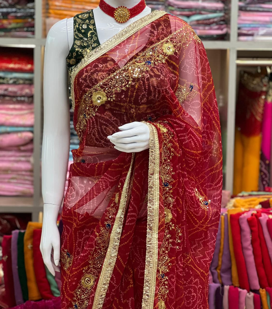 Grace your wardrobe with this elegant Rajwadi Bandhej Saree crafted from original georgette fabric, offering a soft, lightweight, and comfortable drape. The saree features delicate sequence work with minimal detailing, giving it a subtle festive shine while maintaining traditional charm.