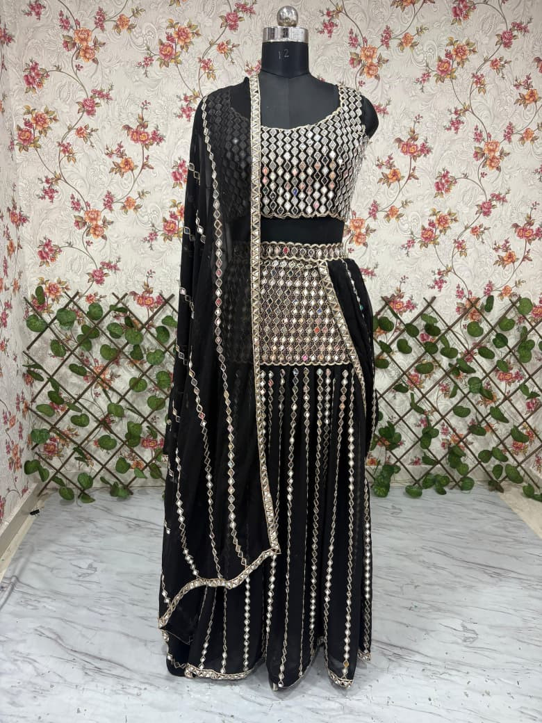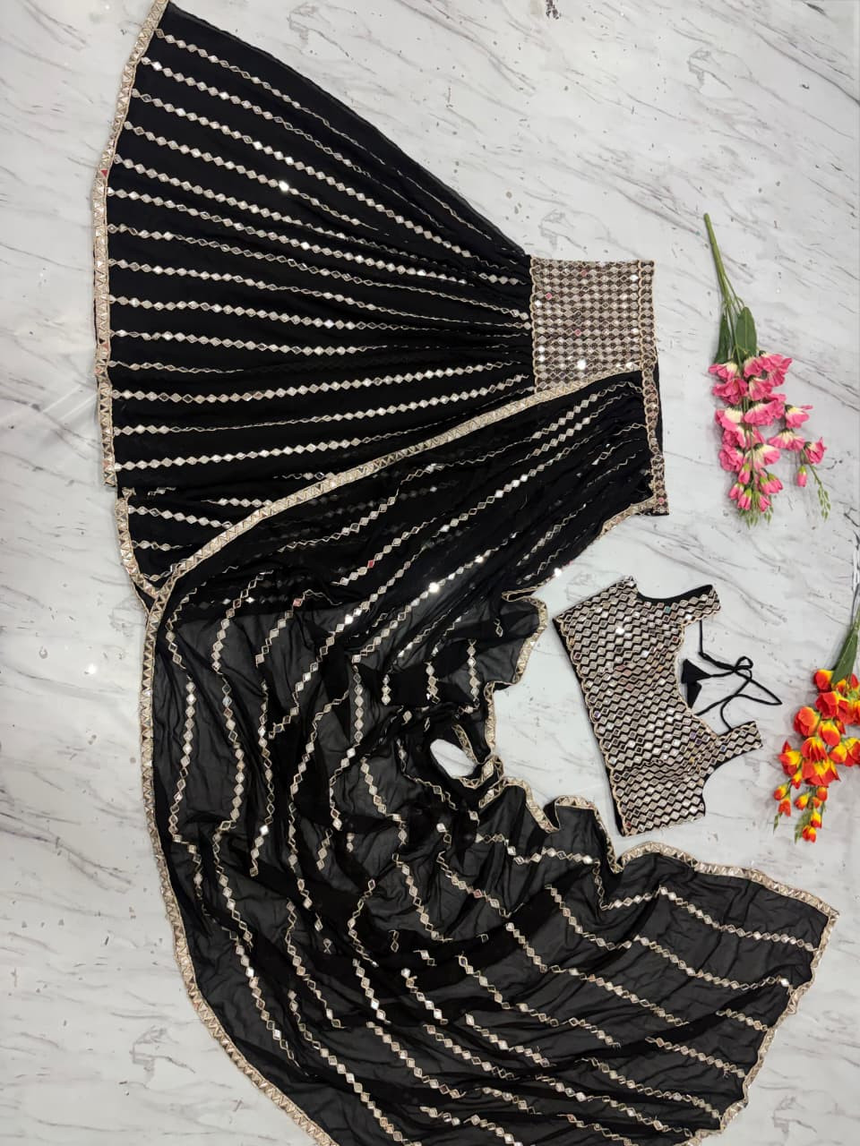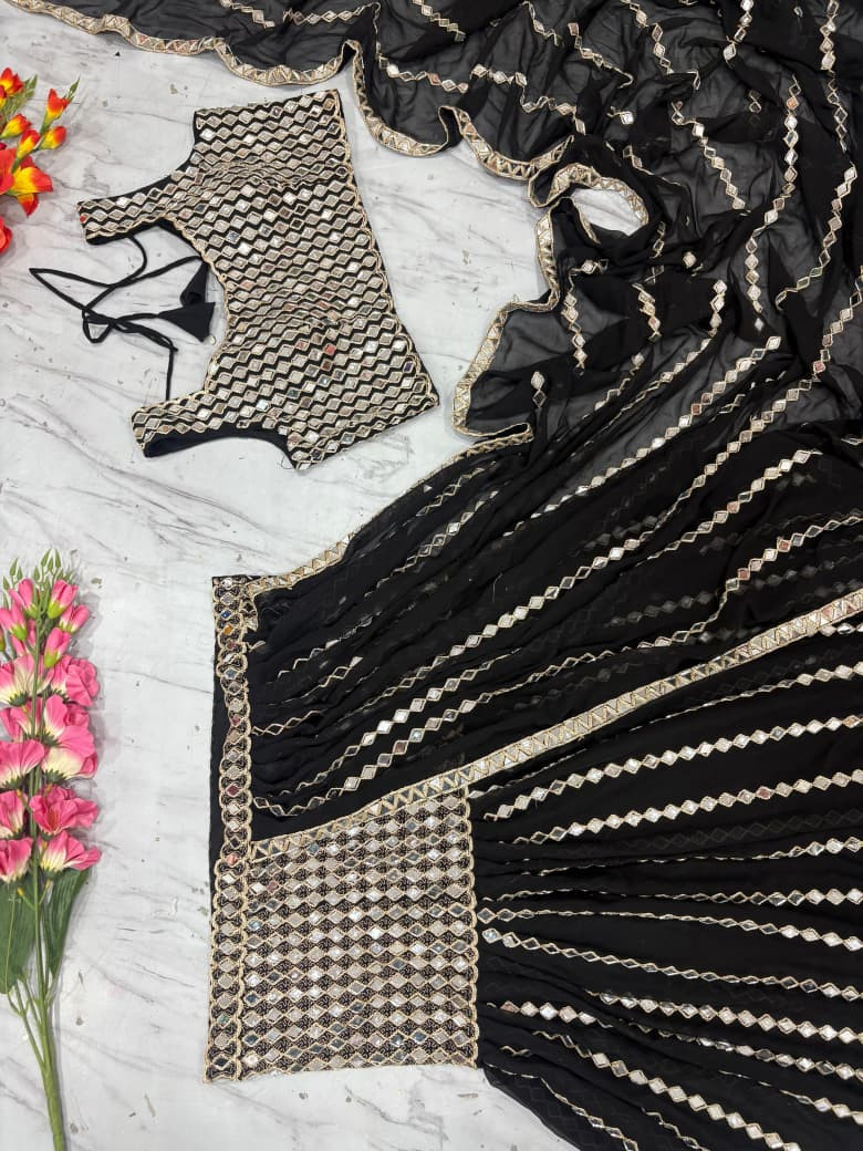 Lehenga Saree With Attached Dupatta: Premium Faux Georgette Embellished With Dori Work And Embellished With Real Mirror Work( Full Stitched Upto Xxl/44 )
