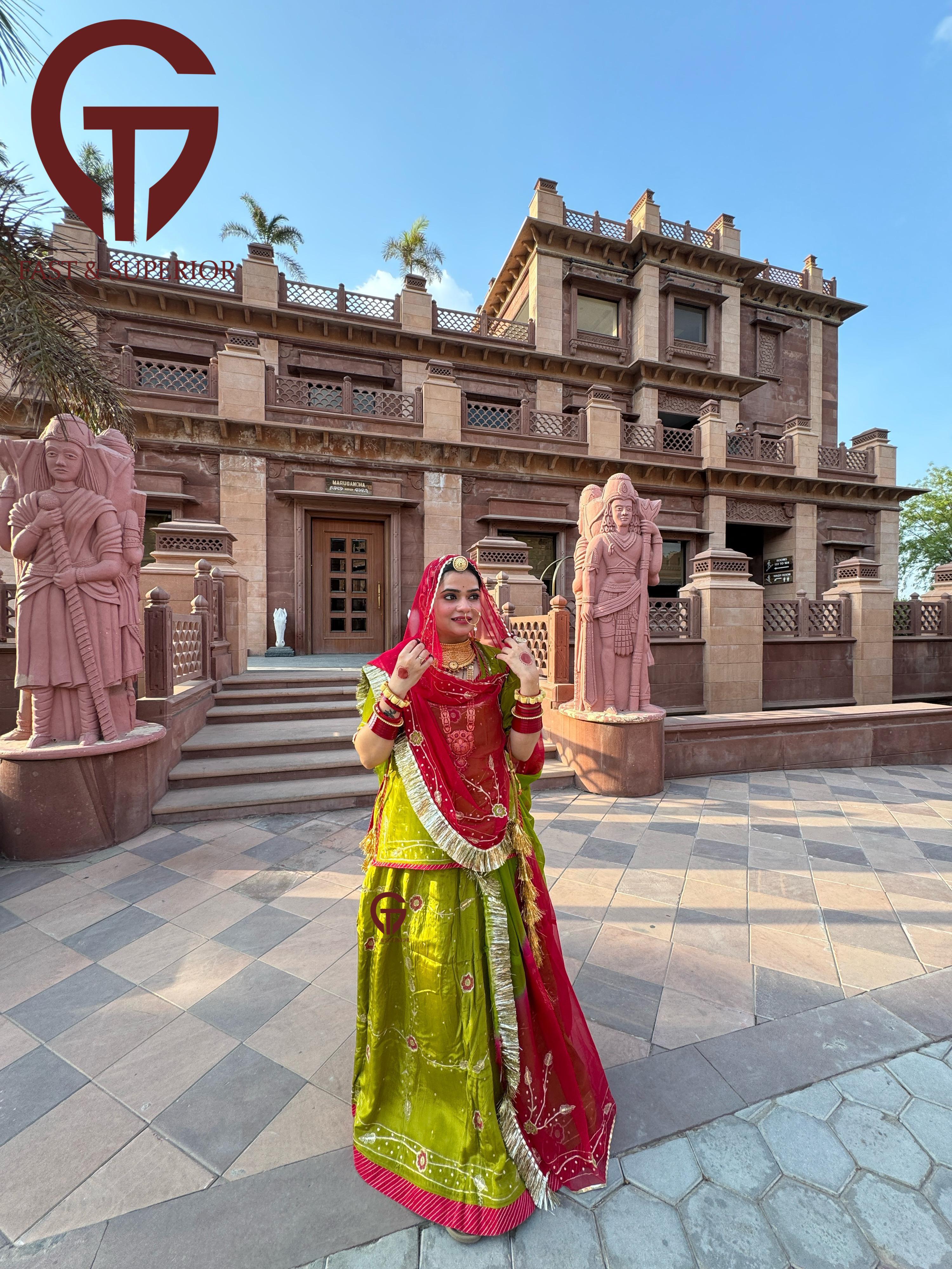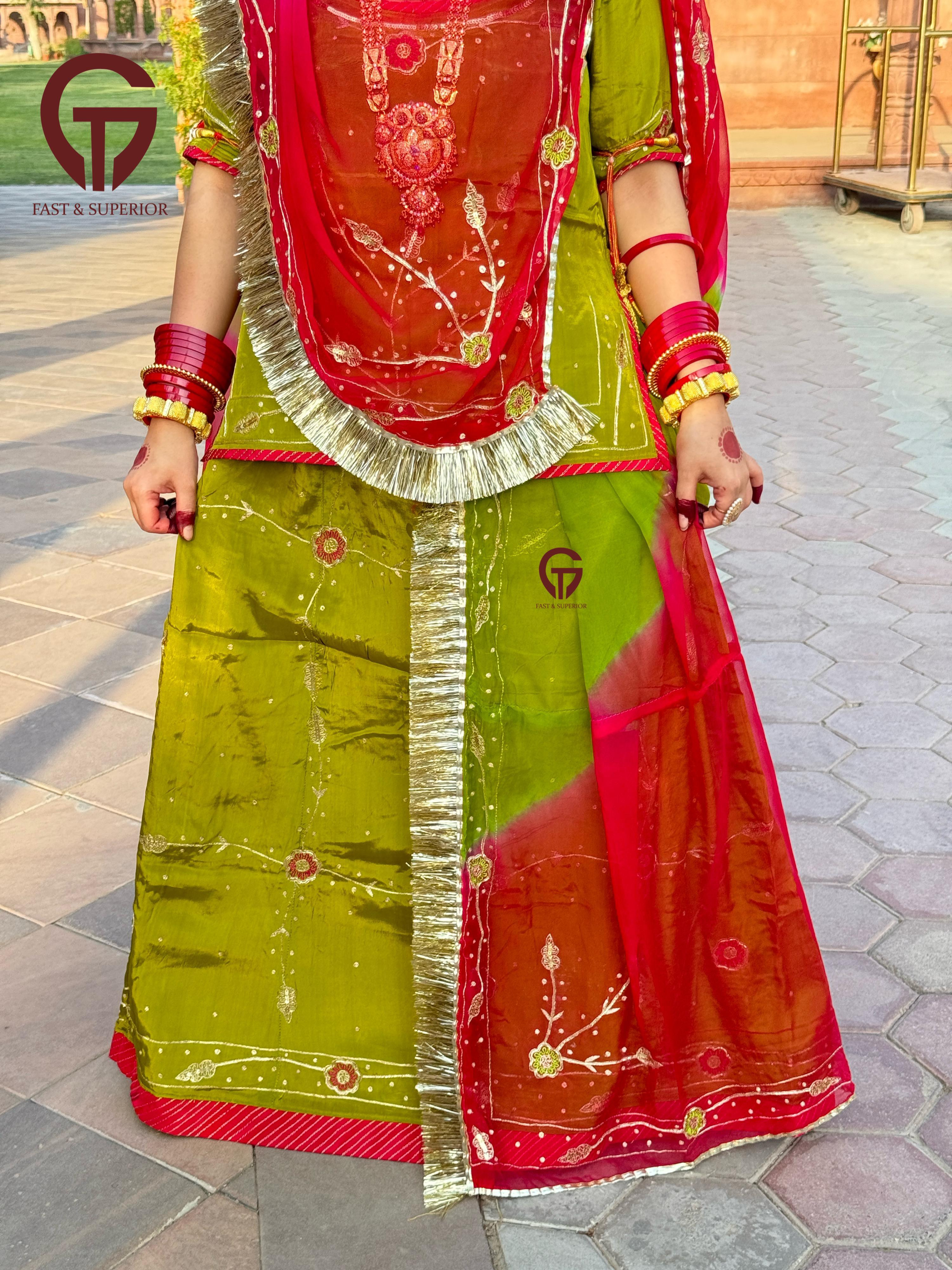 Red Mehandi Multi Coloured Branded Natural Crepe Humrahi Rajputi Poshak