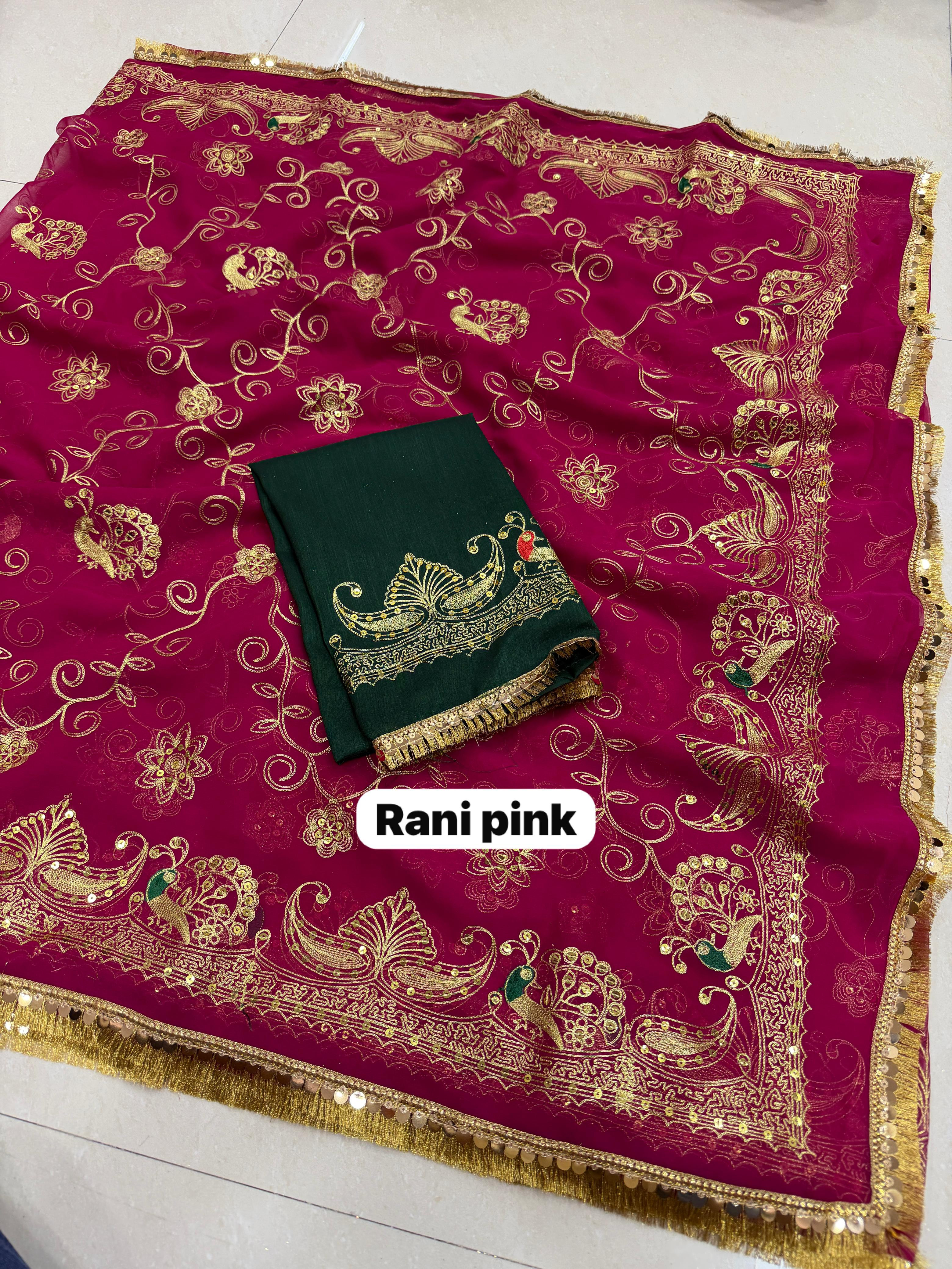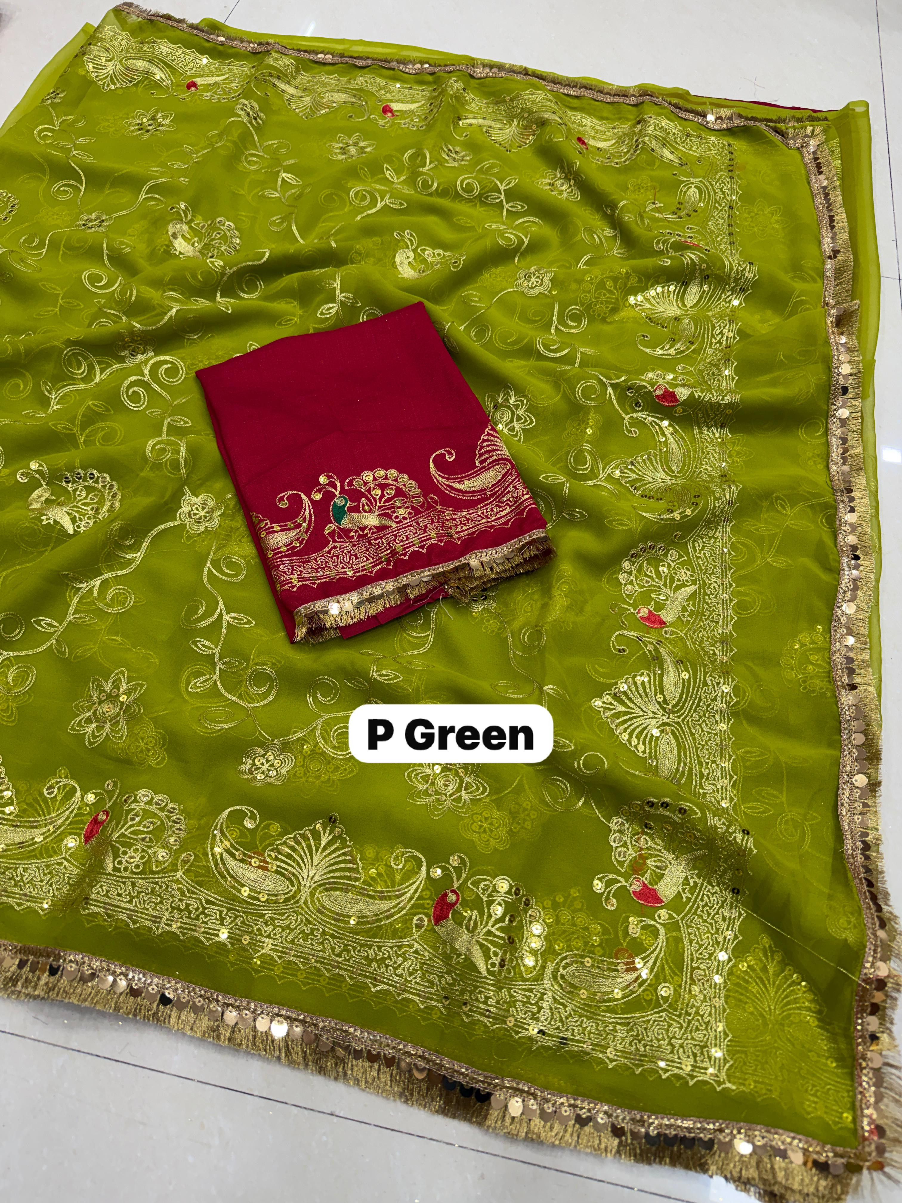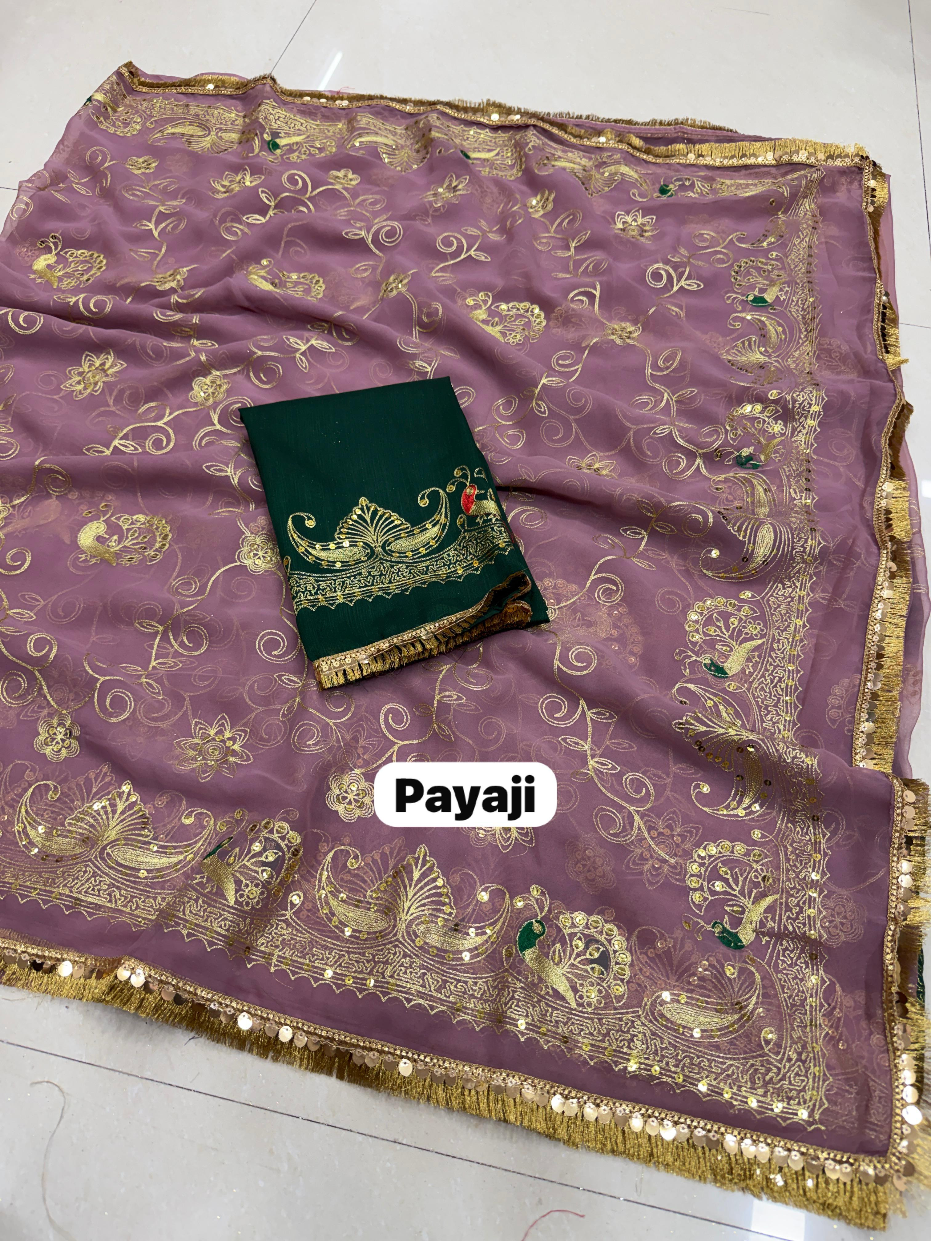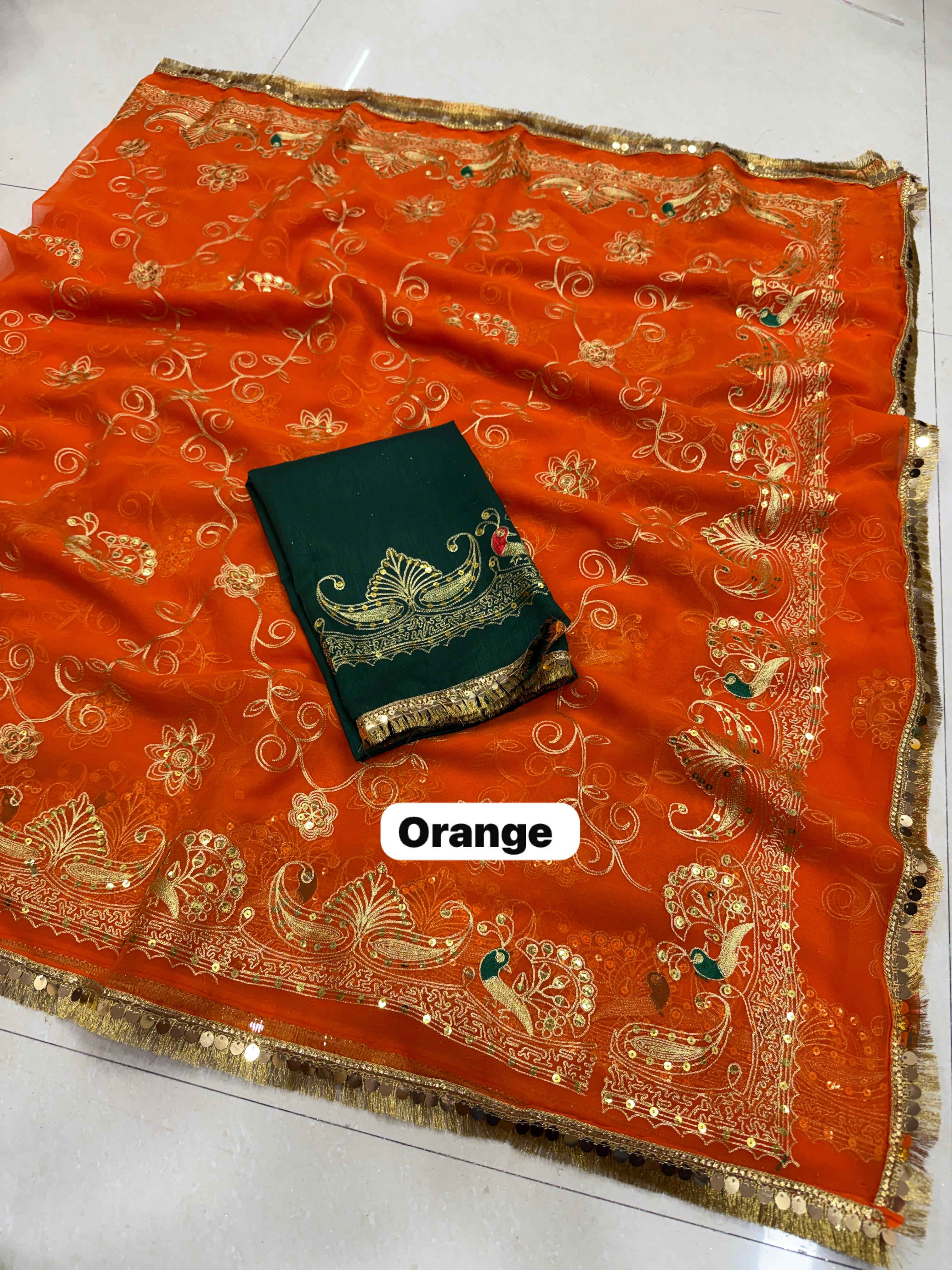 Add royal elegance to your wardrobe with this Premium Royal Georgette Rajputi Saree, designed for a graceful and traditional look. Crafted from Original Royal Georgette fabric, this saree features beautiful Kasab sequins work with subtle sequin detailing, giving it a classy and sophisticated appeal perfect for festive and special occasions.