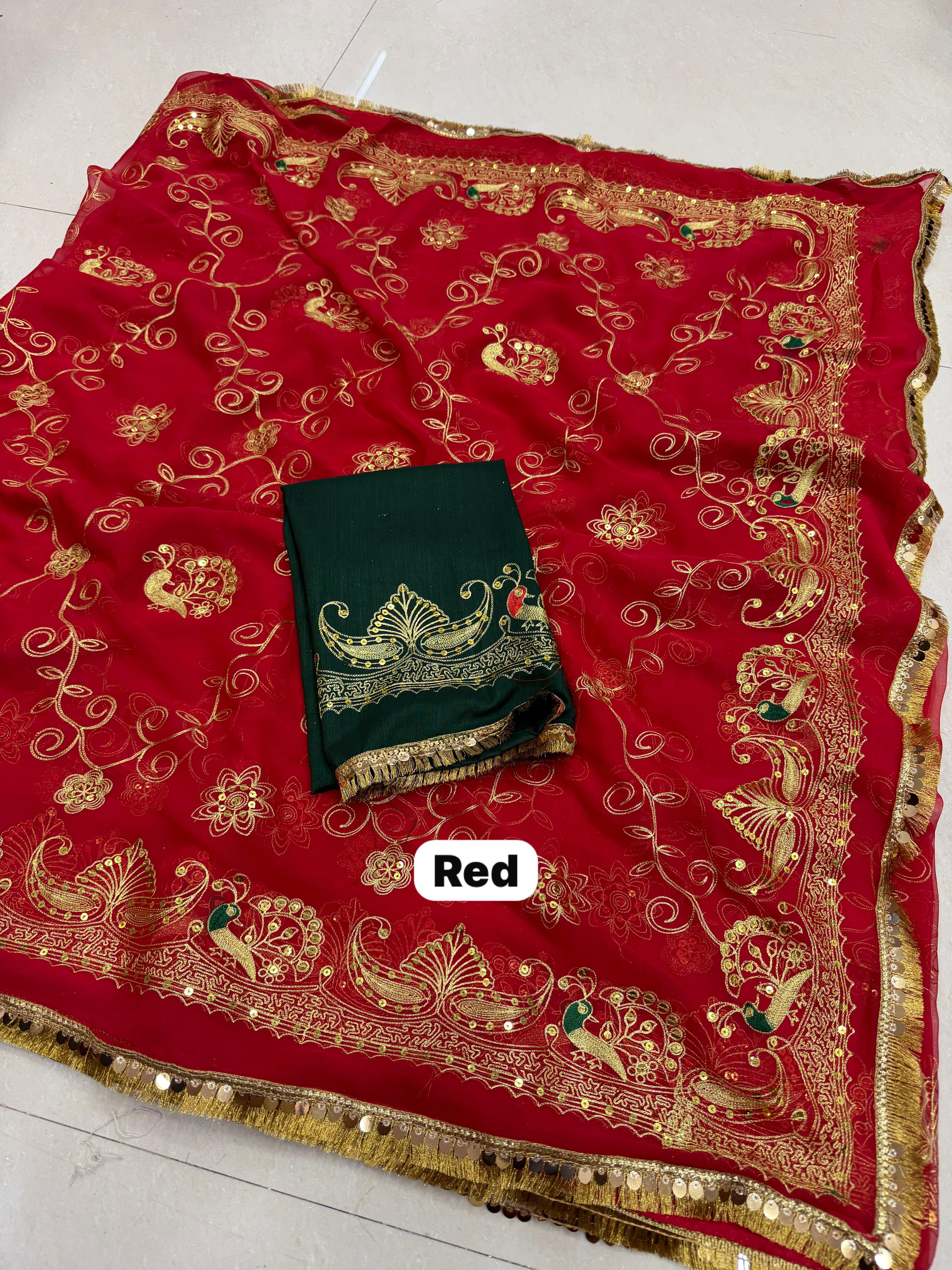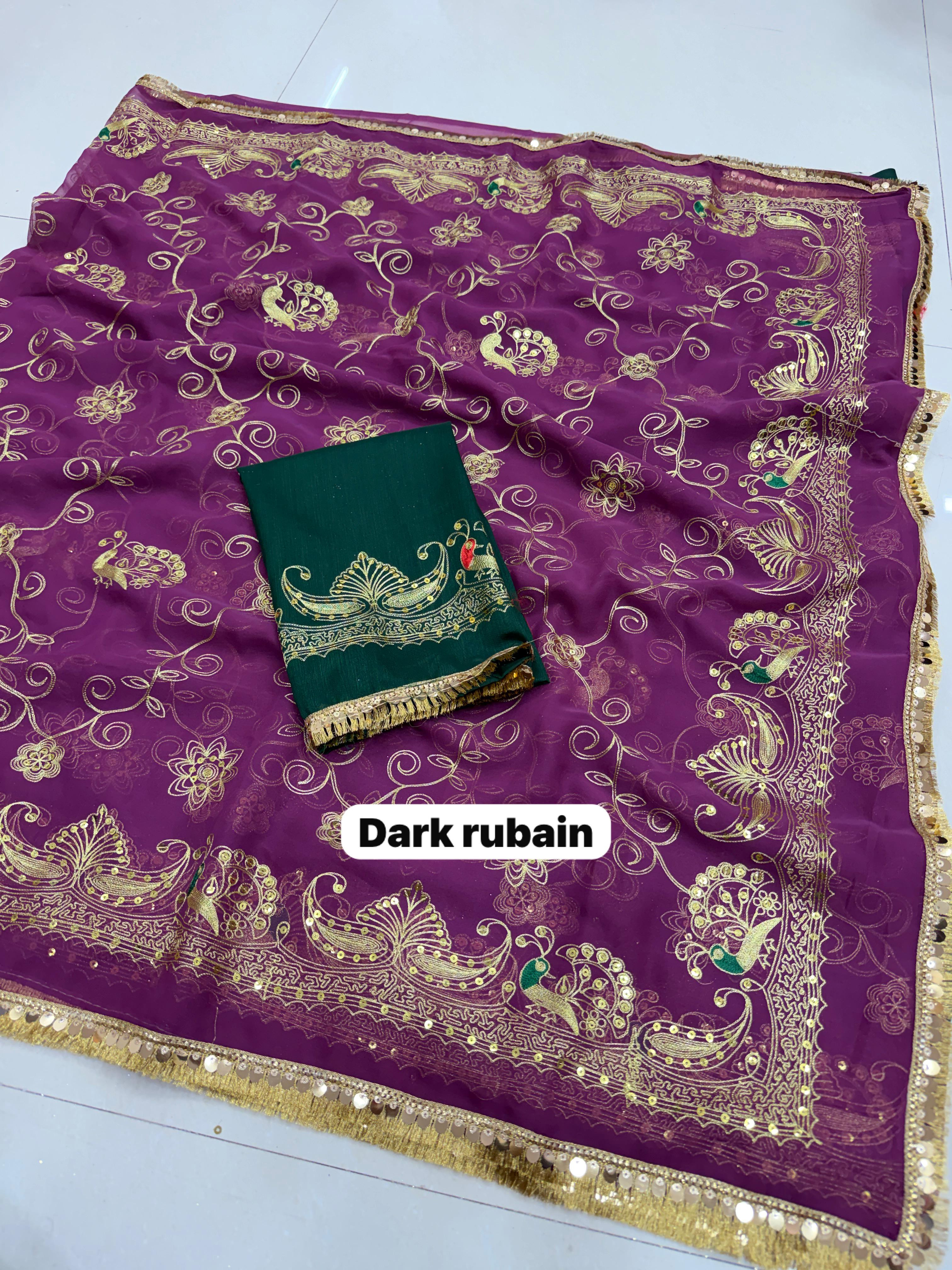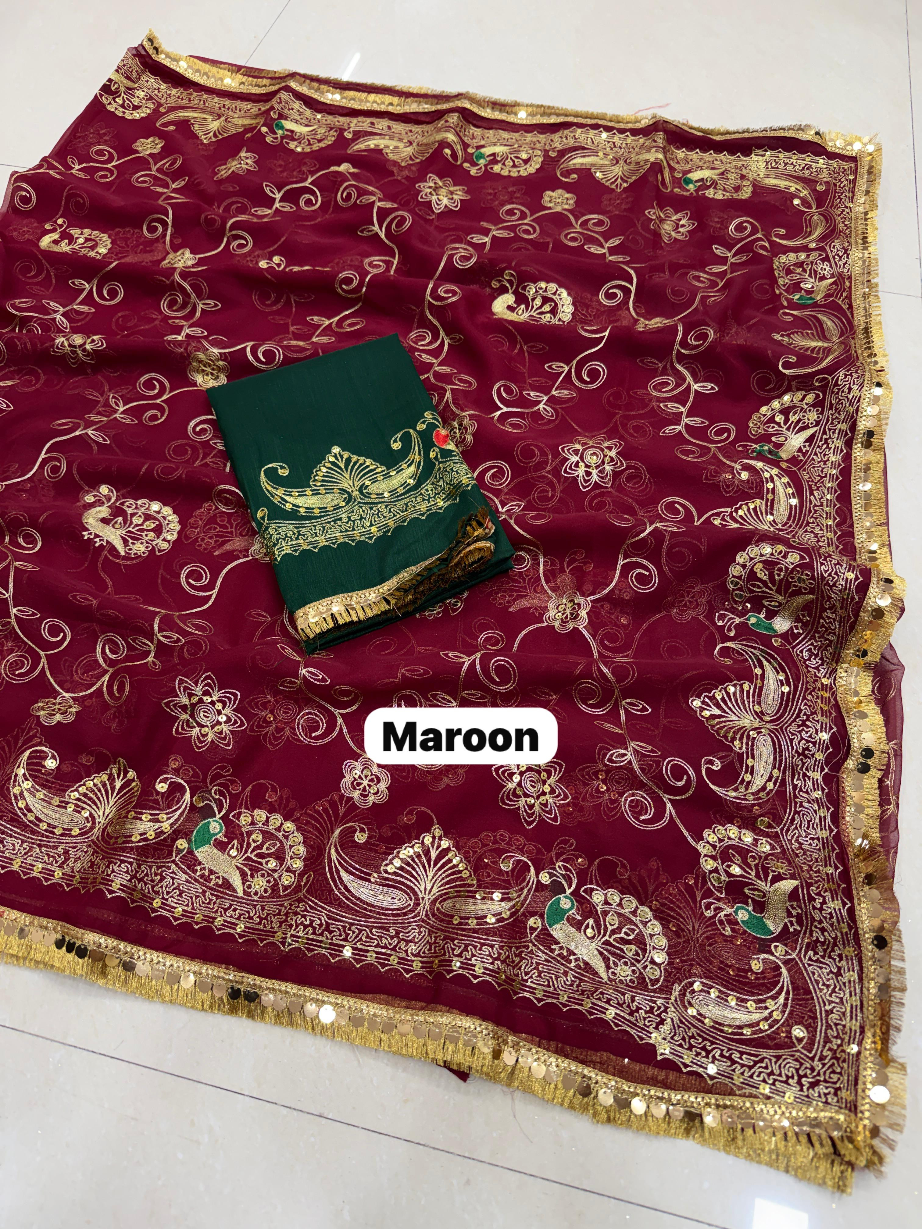 Add royal elegance to your wardrobe with this Premium Royal Georgette Rajputi Saree, designed for a graceful and traditional look. Crafted from Original Royal Georgette fabric, this saree features beautiful Kasab sequins work with subtle sequin detailing, giving it a classy and sophisticated appeal perfect for festive and special occasions.