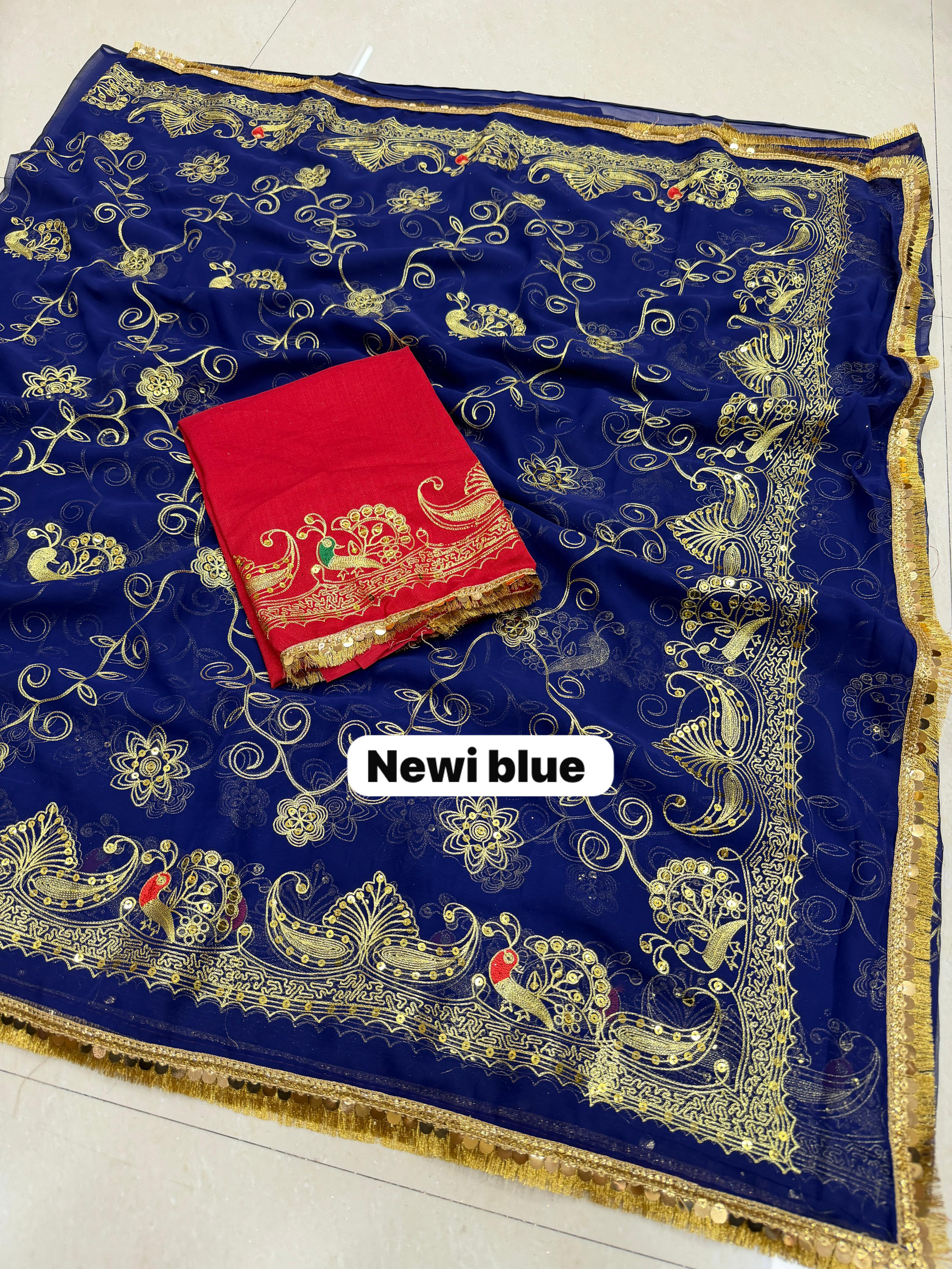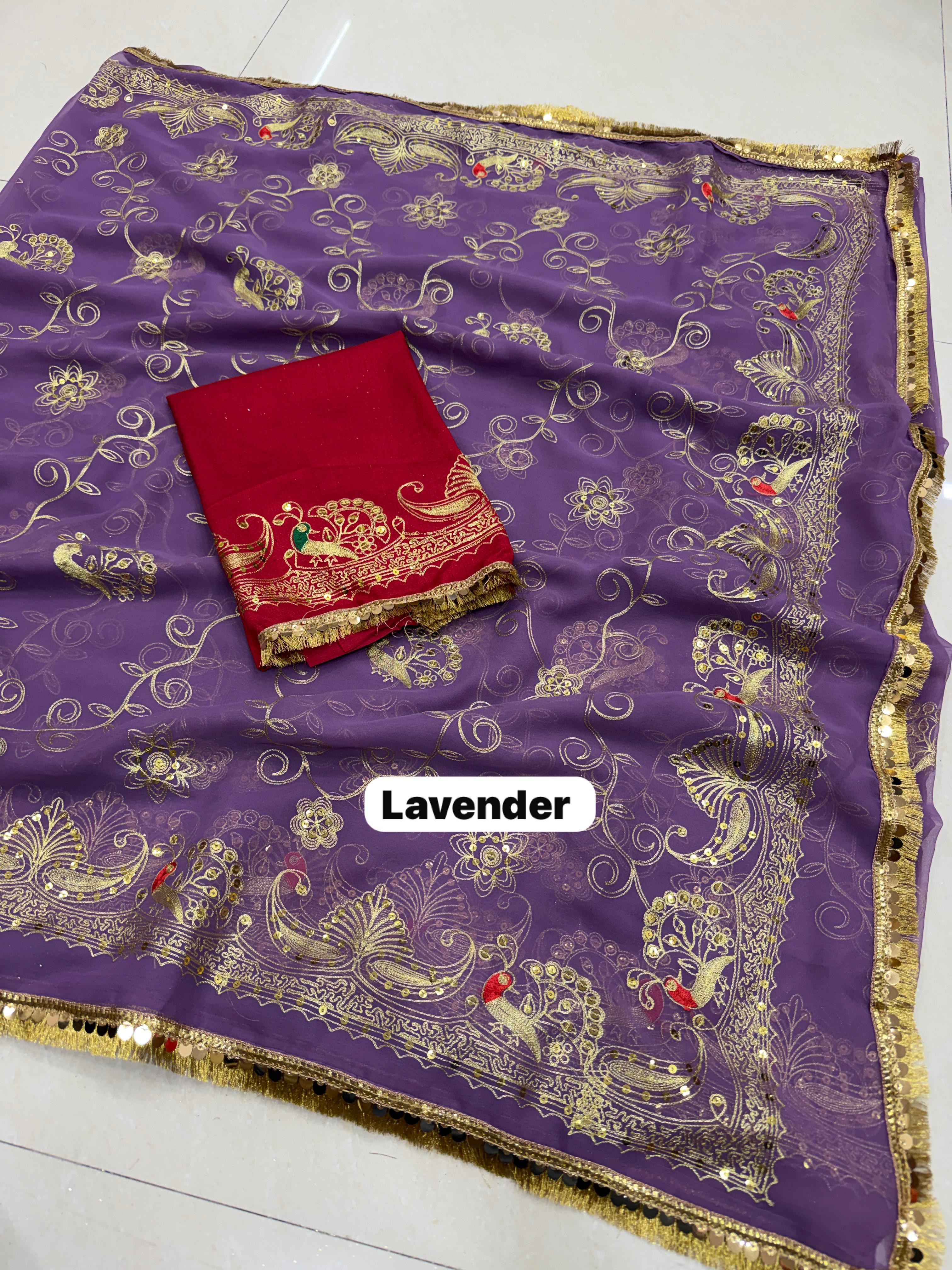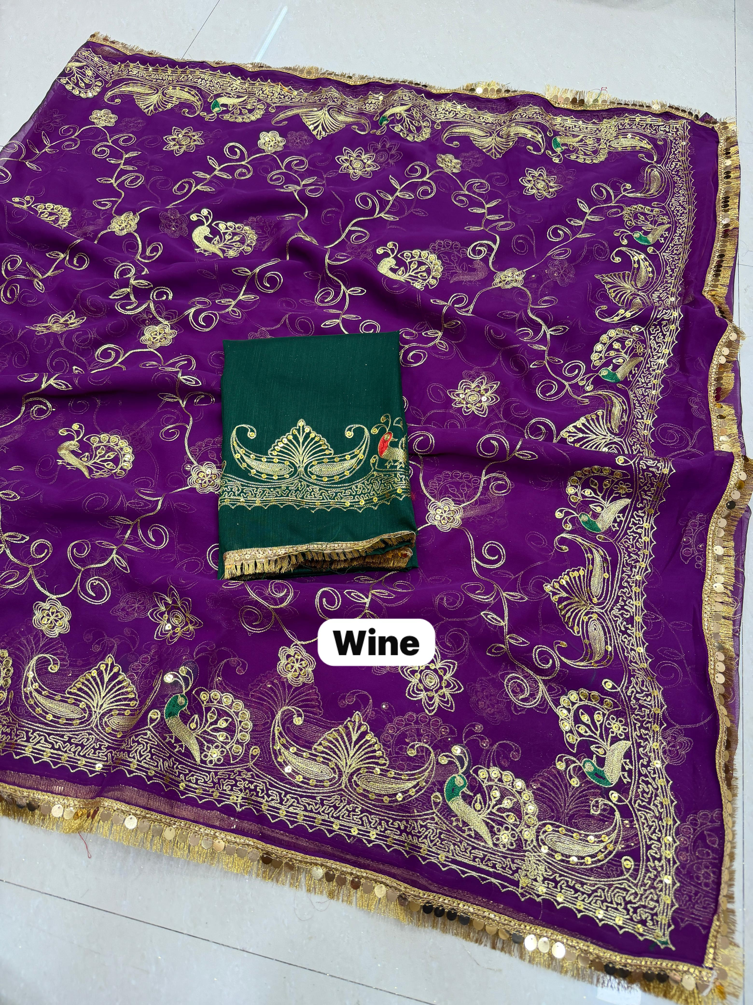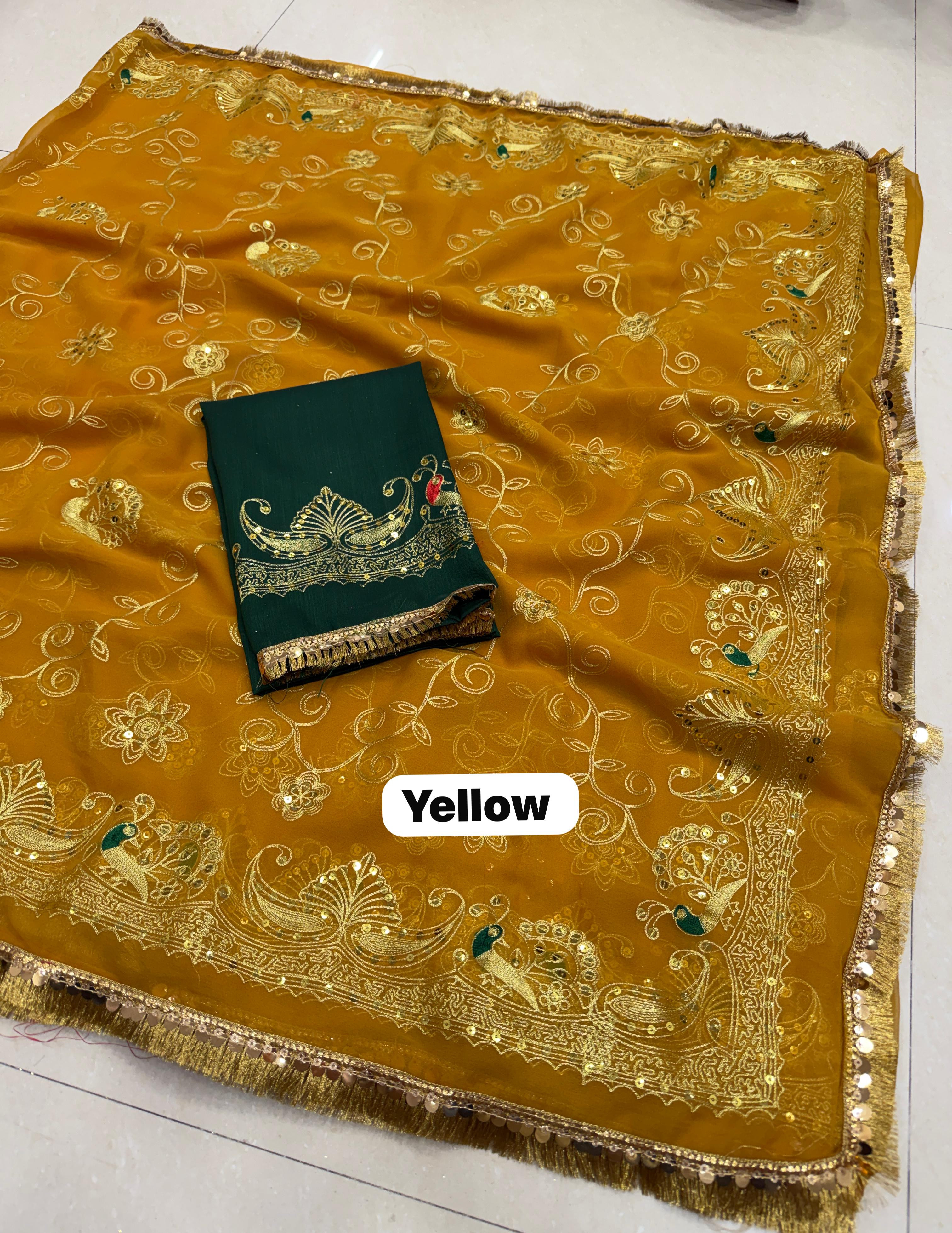 Add royal elegance to your wardrobe with this Premium Royal Georgette Rajputi Saree, designed for a graceful and traditional look. Crafted from Original Royal Georgette fabric, this saree features beautiful Kasab sequins work with subtle sequin detailing, giving it a classy and sophisticated appeal perfect for festive and special occasions.