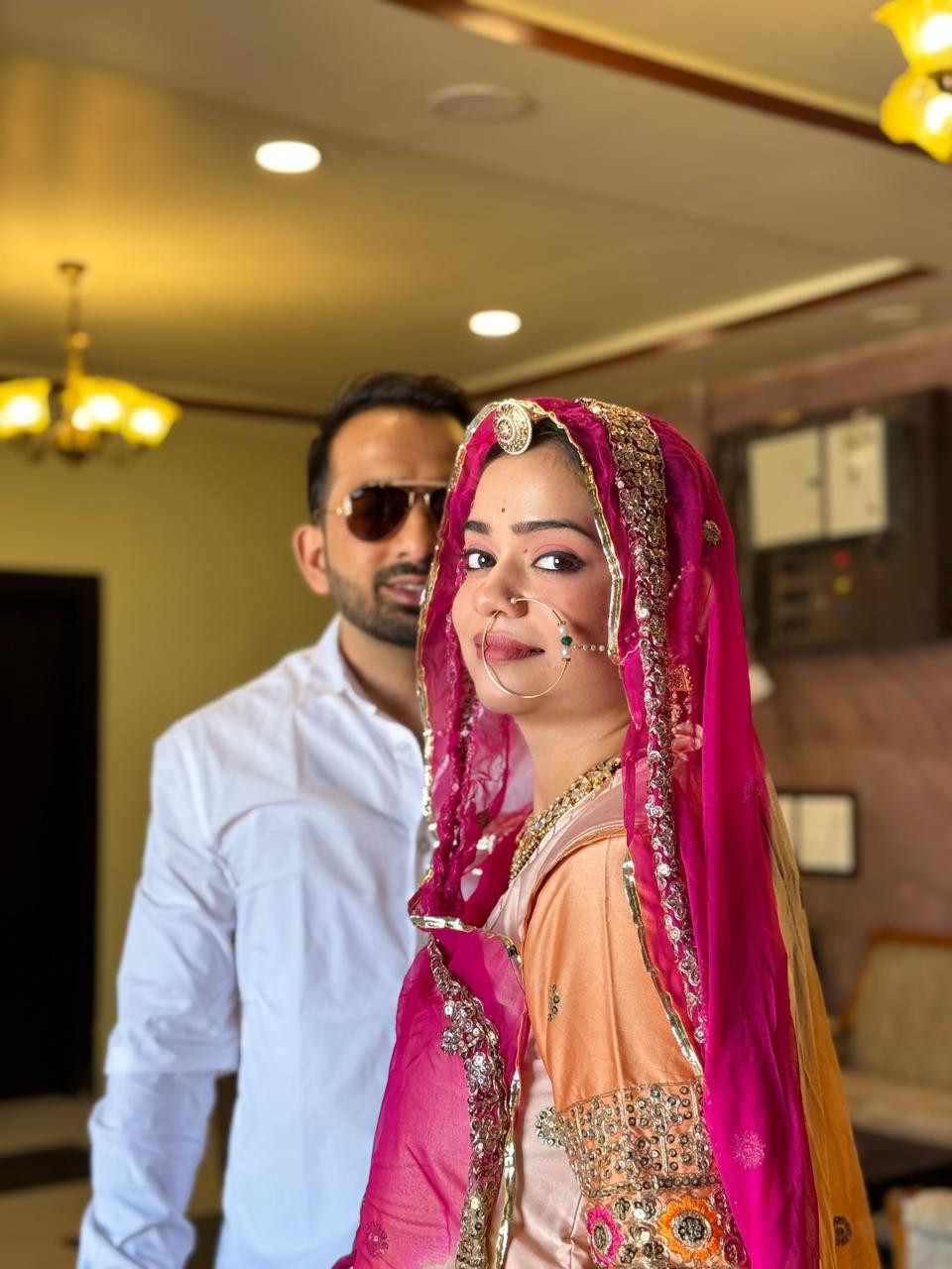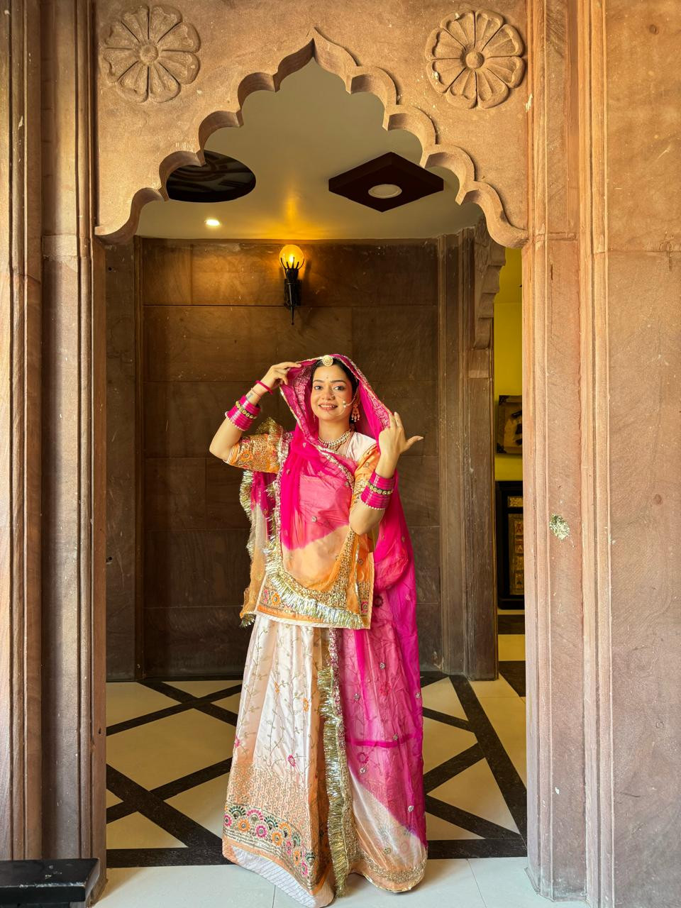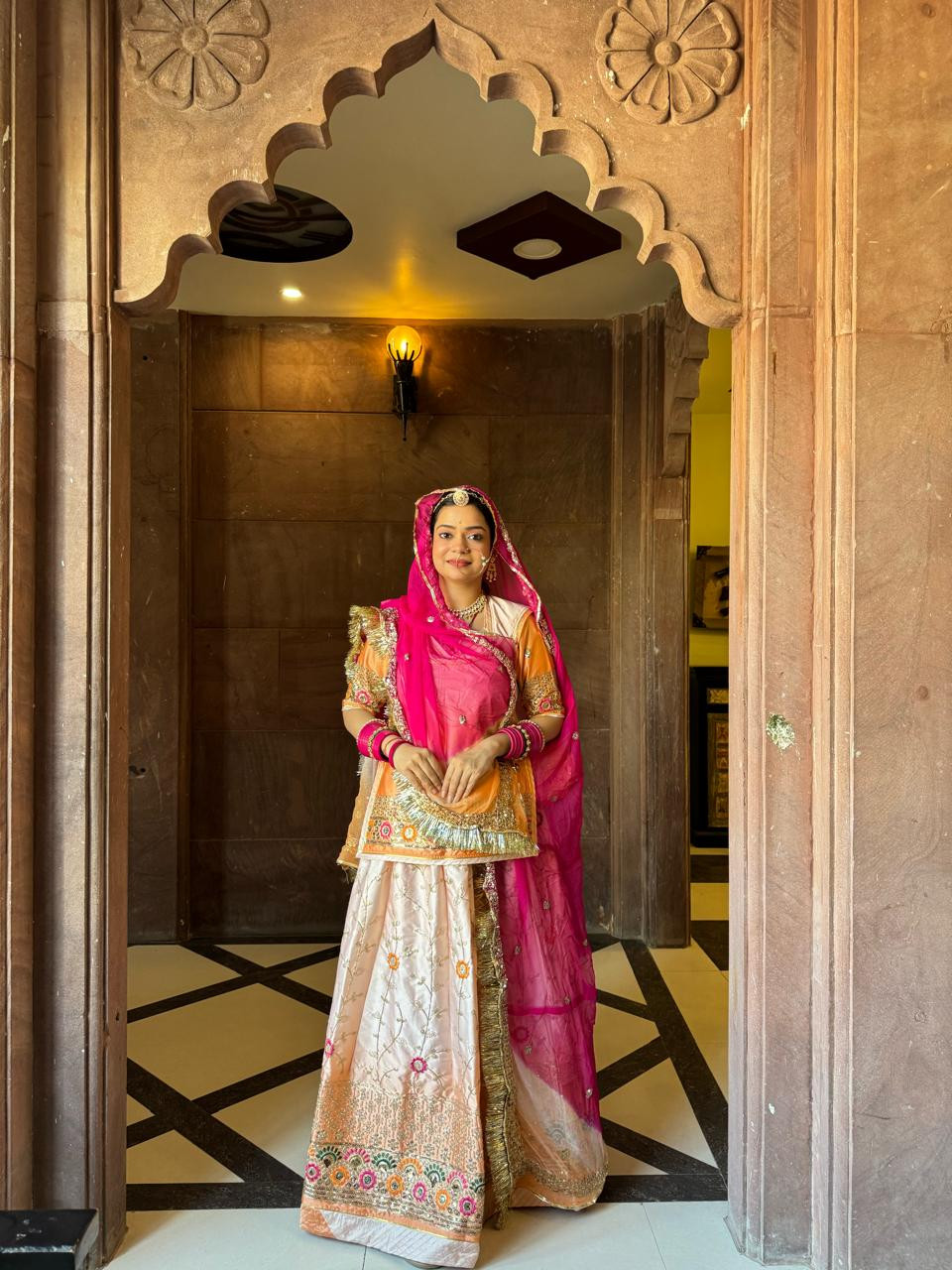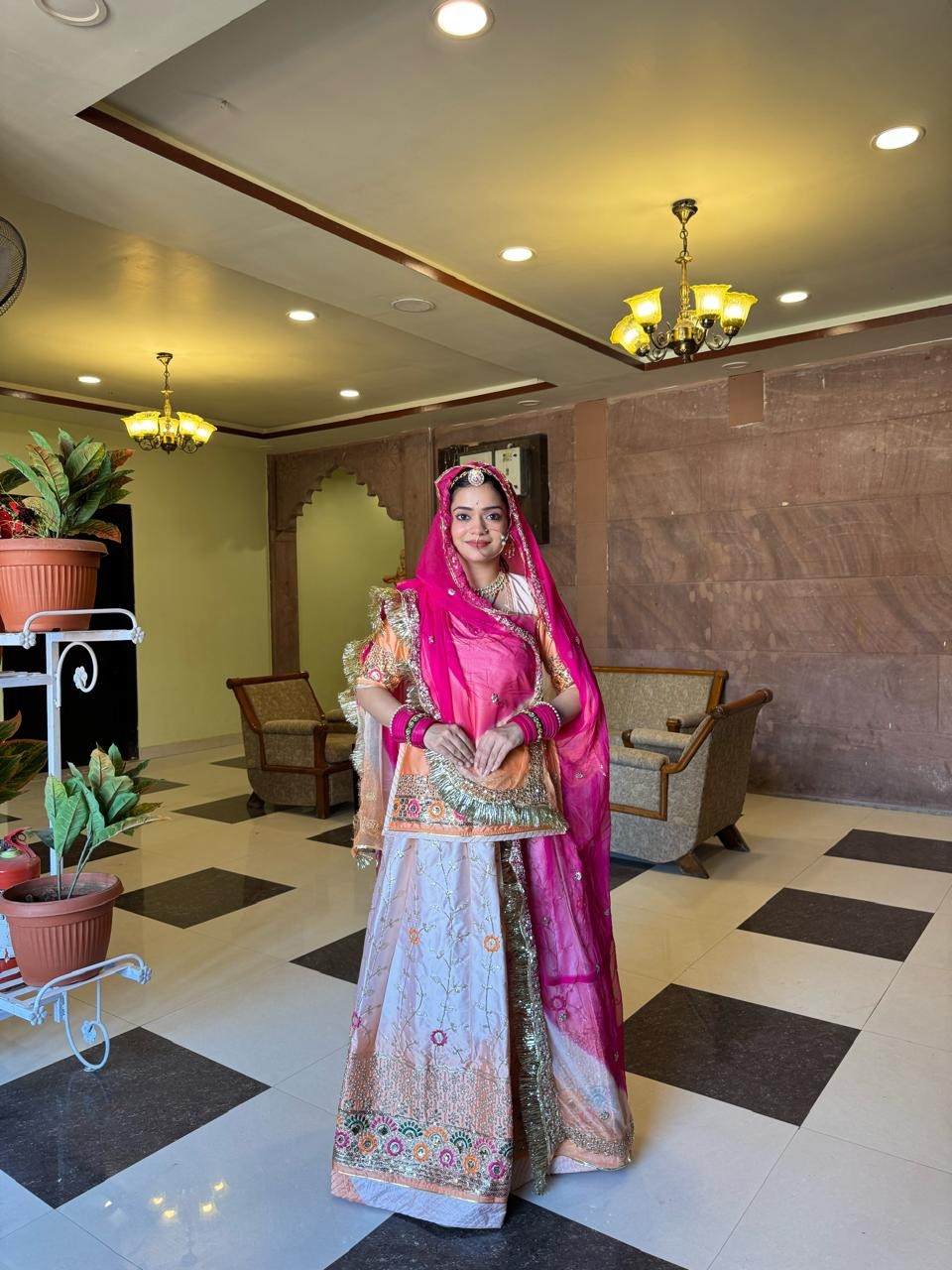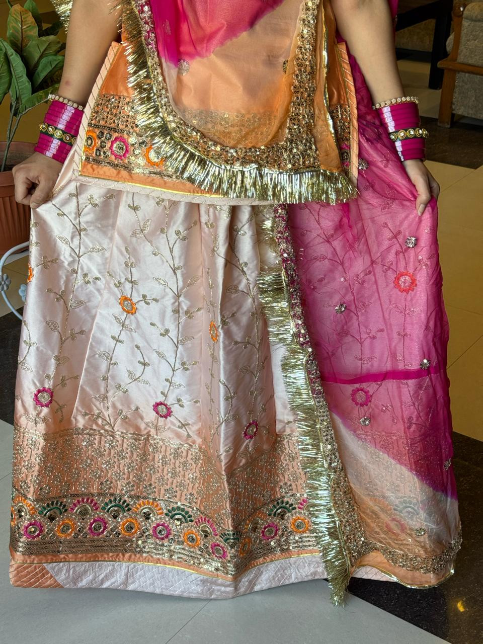 Step into timeless elegance with this Heavy Satin Rajputi Poshak, crafted to perfection for royal occasions. Featuring luxurious satin fabric adorned with heavy fancy work, this masterpiece radiates grace and grandeur. The set is completed with a Premium Hamrahi Pure Odhna, beautifully finished with Gota Kiran detailing that enhances its traditional charm. Perfect for weddings, festive celebrations, and cultural events, this Poshak is designed to make you feel regal and confident.