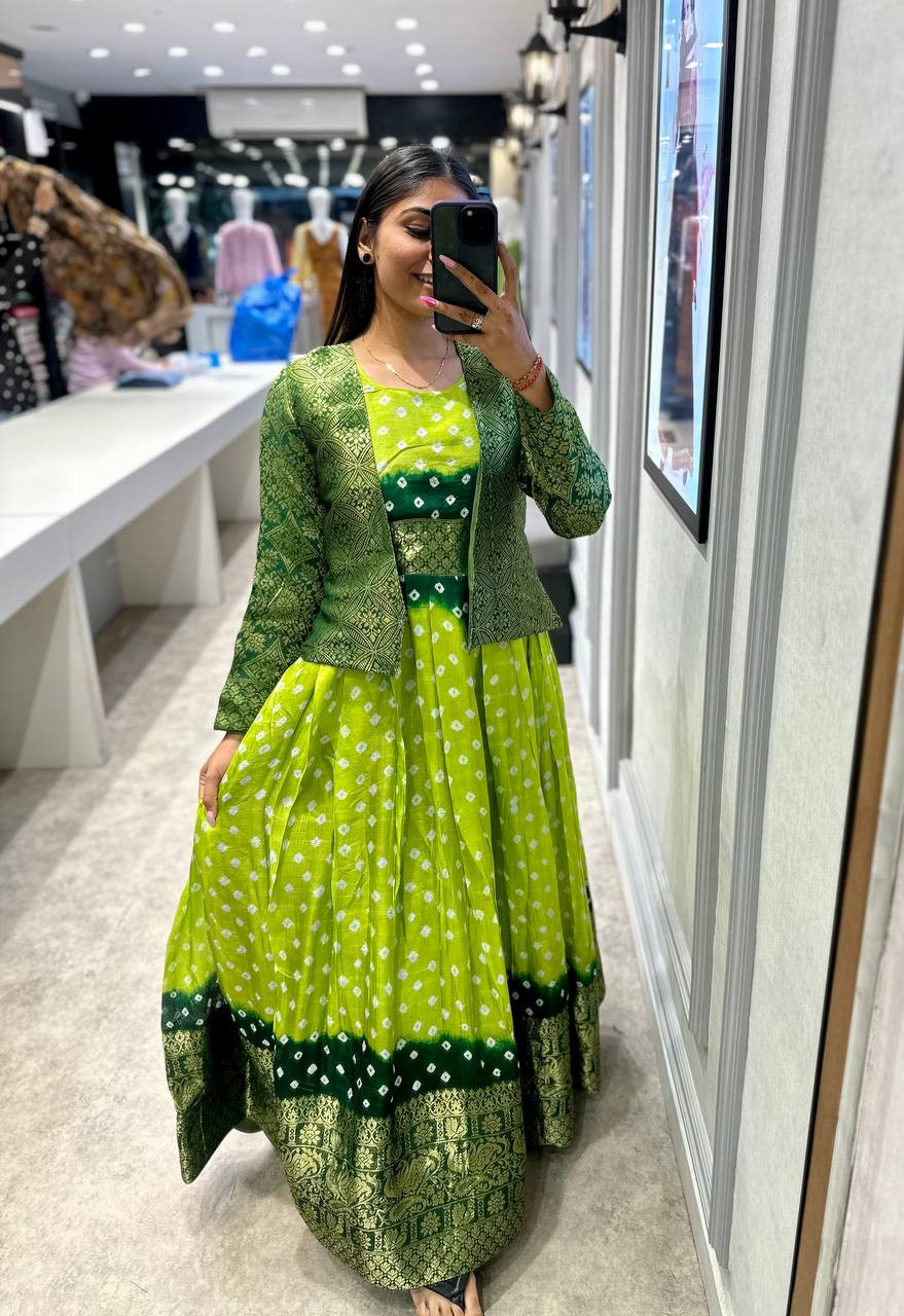 Royal Kanjiveram Silk Bandhani Gown with Koti | 5 Meter Flare Zari Bandhej Dress