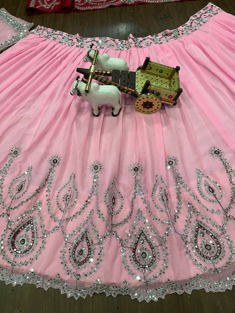 Crafted with premium Fox Georgette fabric, this semi-stitched lehenga features authentic mirror embroidery work, giving it a radiant, festive charm. The 3.5-meter flare adds grand volume, supported by Can-Can and Canvas layers for a royal silhouette.