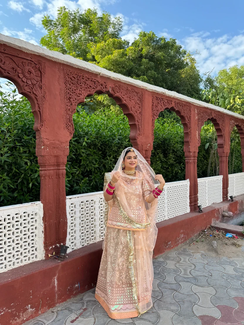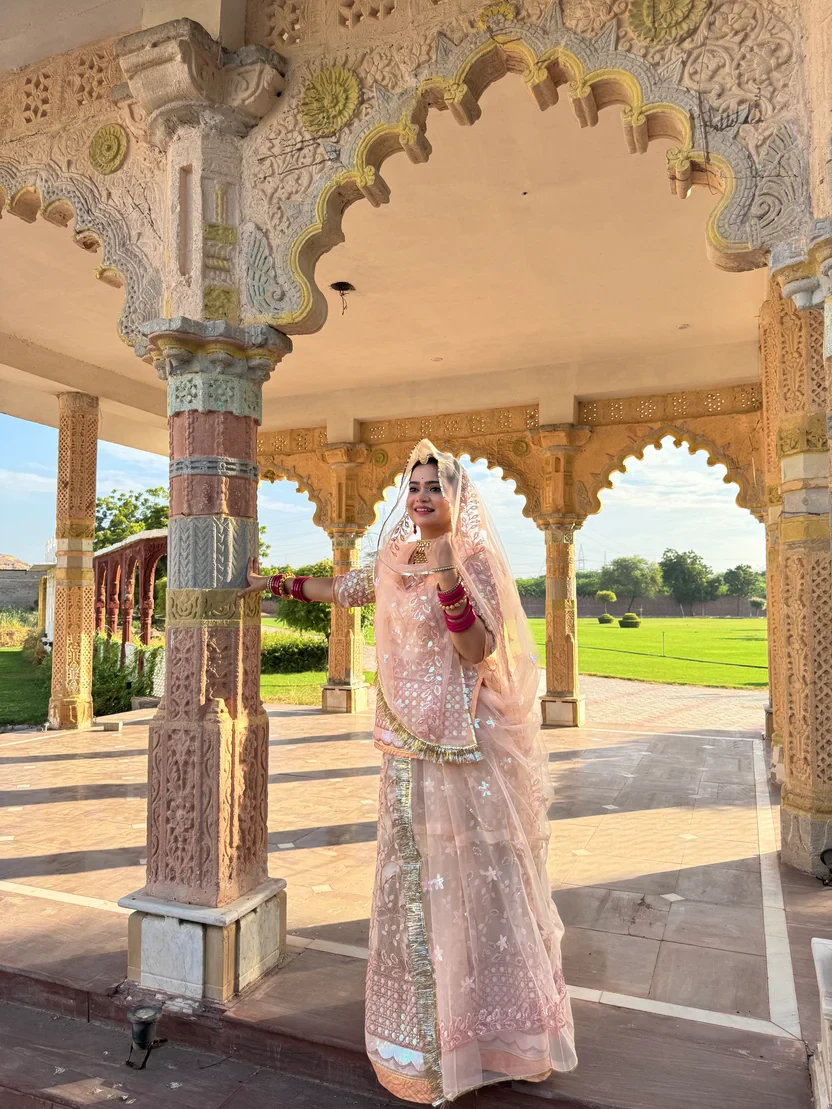 offering a lightweight and breathable feel while exuding sophistication. The poshak features intricate embroidery, shimmering sequins, and delicate zari work, making it perfect for weddings, festive occasions, or grand celebrations. Paired with a matching Net Odhna, this ensemble creates a regal and graceful appearance.