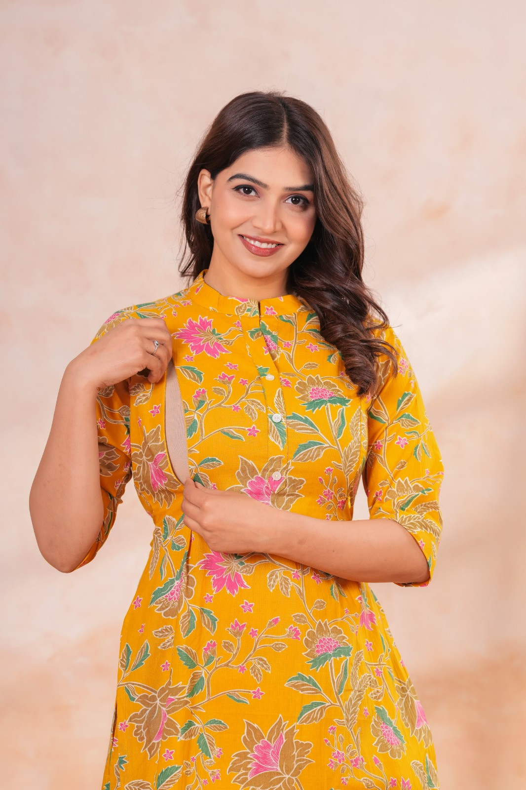 Brighten your maternity wardrobe with this elegant Mustard Yellow Floral Maternity & Feeding Kurta Pant Co-Ord Set. Made from soft, breathable cotton, it ensures all-day comfort during pregnancy and postpartum. The straight-fit kurta features concealed side zippers for easy nursing access, paired with comfortable straight pants with an elastic waistband—perfect for hospital wear, home, and casual outings.