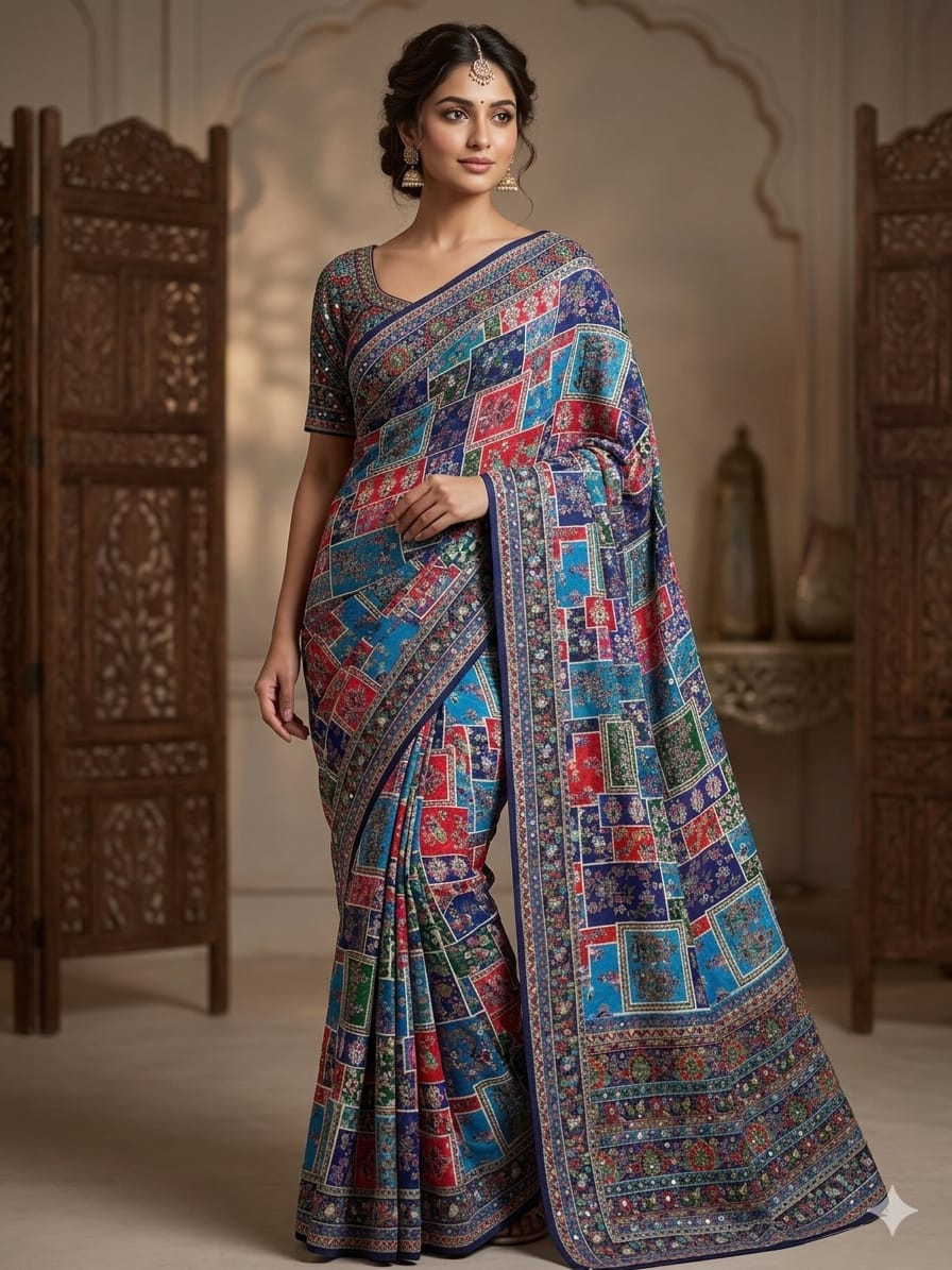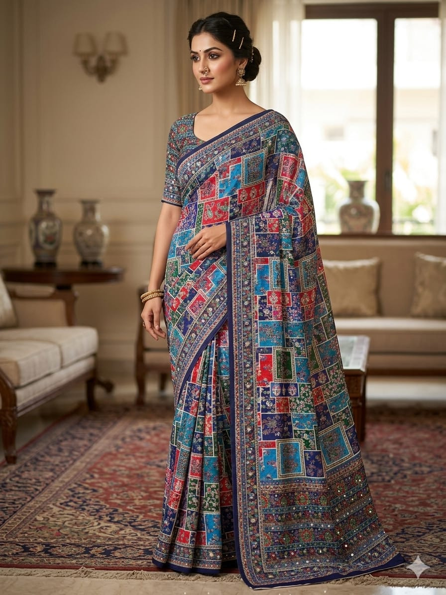 Fabric: Luxurious Premium Chinon Silk known for its elegant drape and soft, breathable texture.