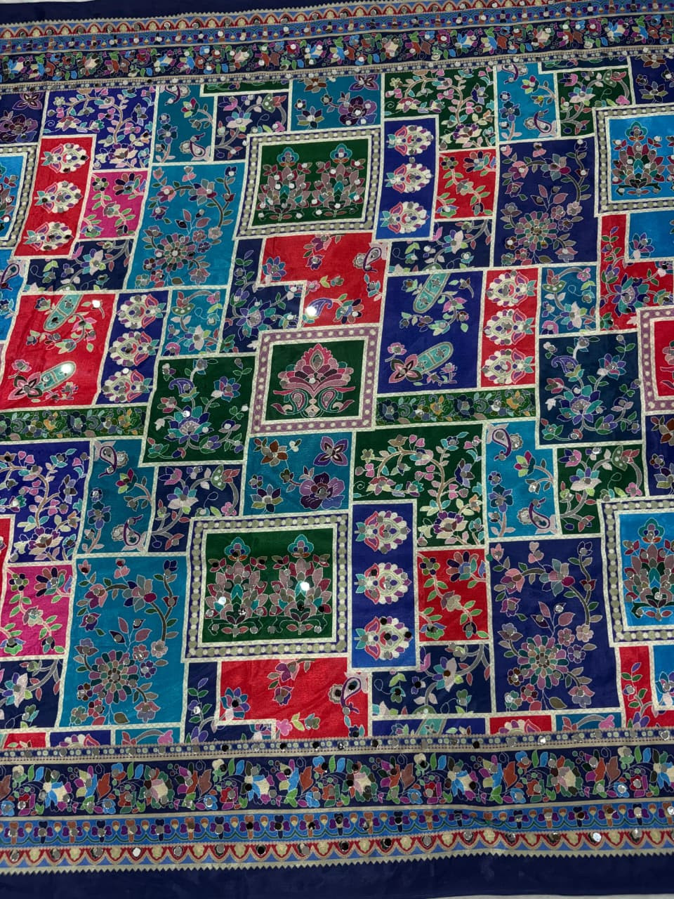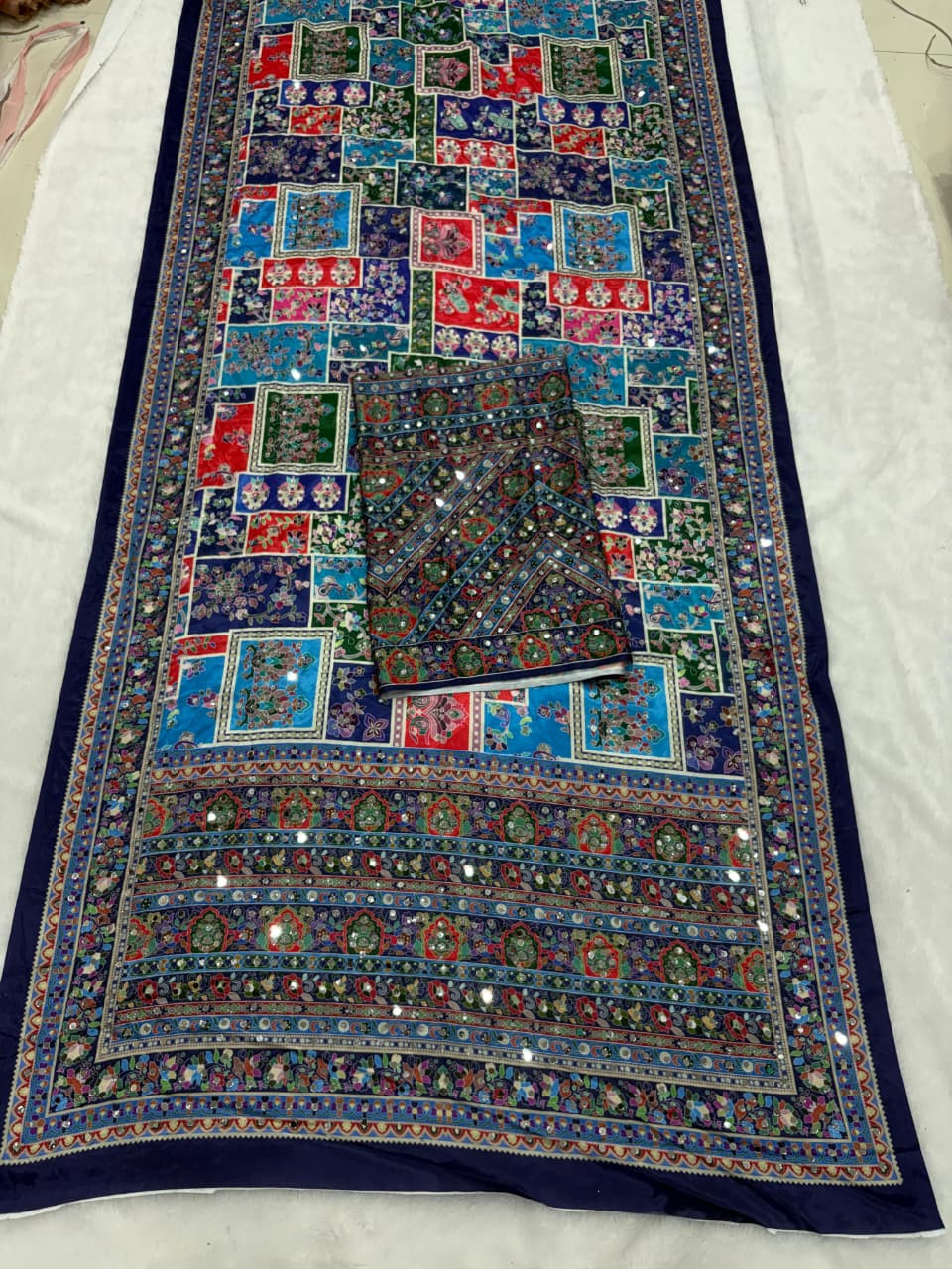 The Blouse: Comes with a matching unstitched Chinon Silk blouse piece, fully adorned with real mirror work to complete the regal look.