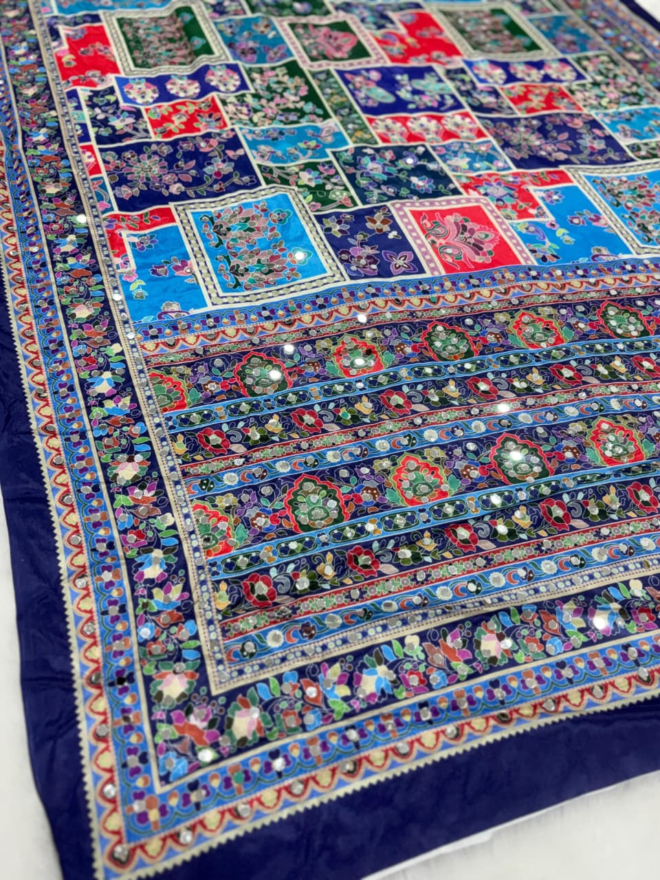 Artistry: Elaborate Real Mirror Work meticulously placed across the entire saree to catch every flicker of light.