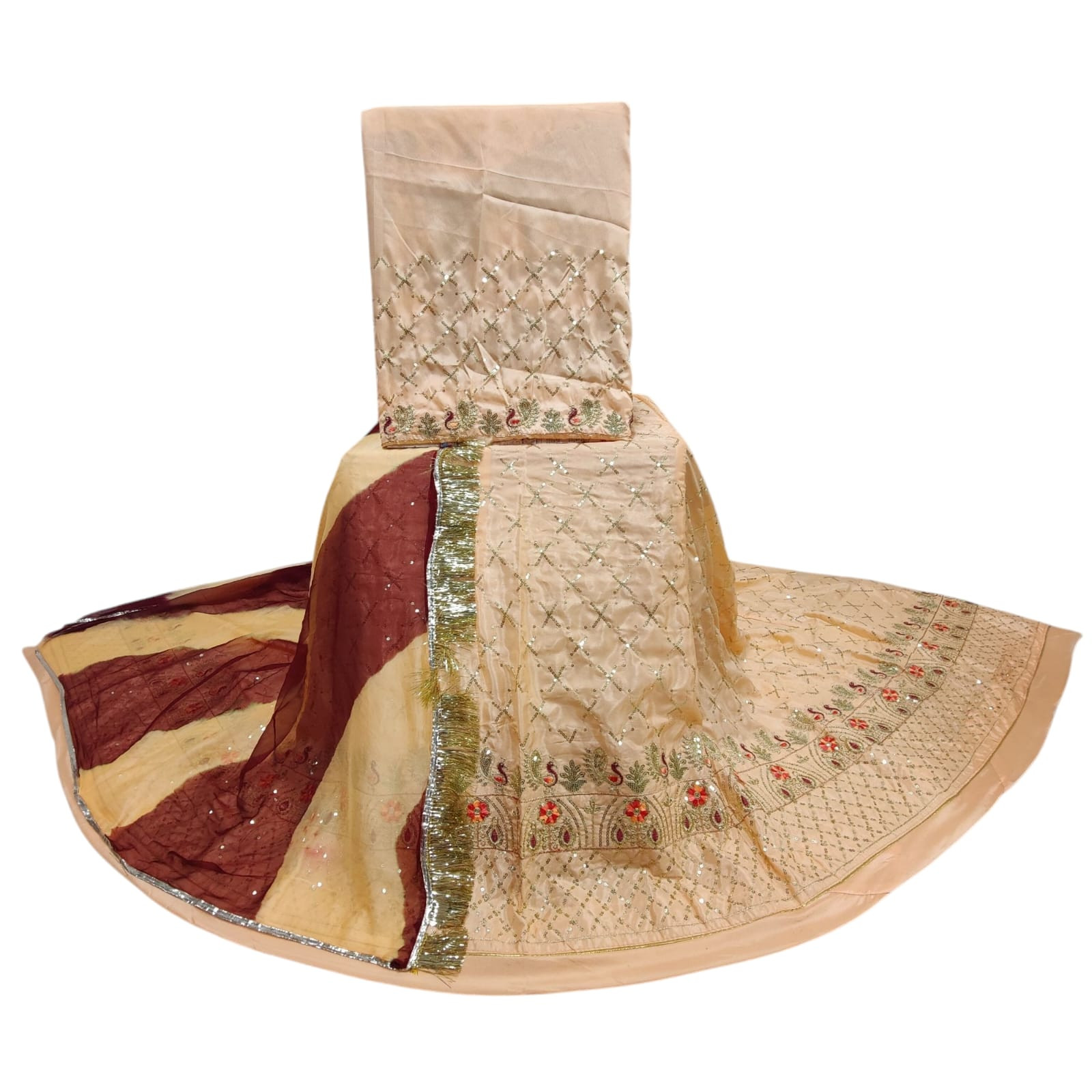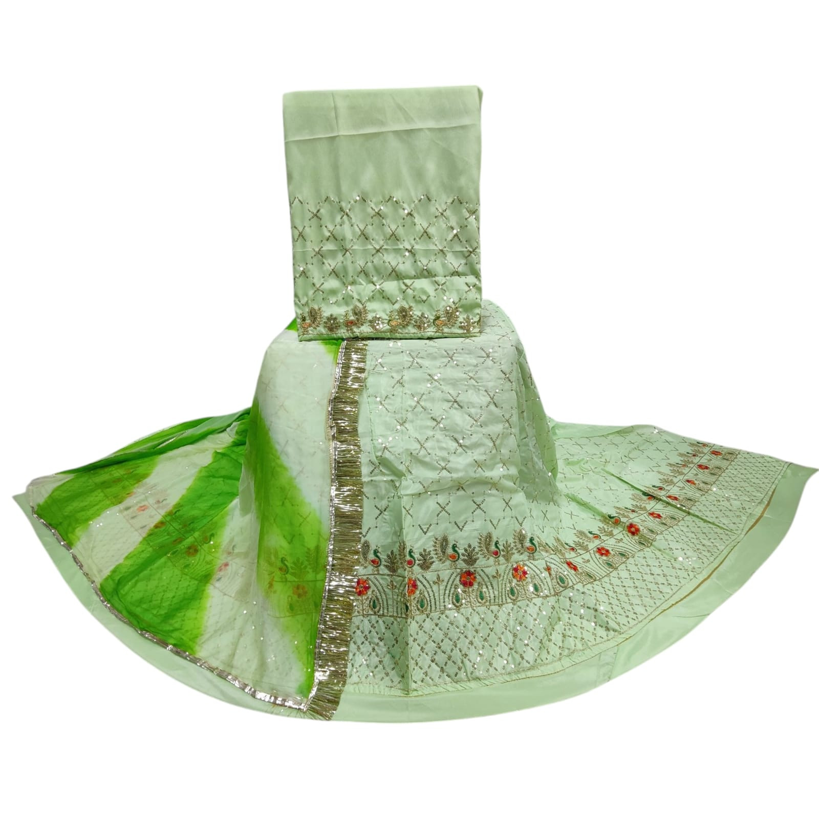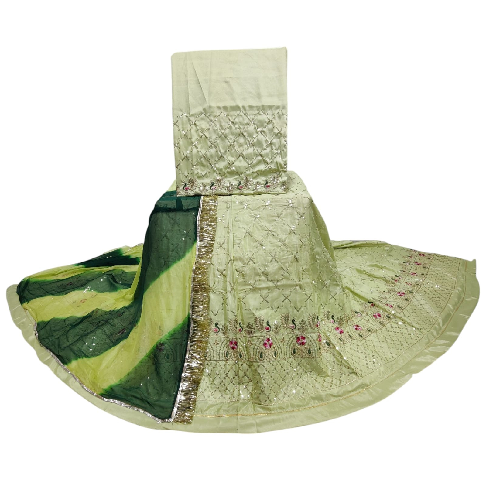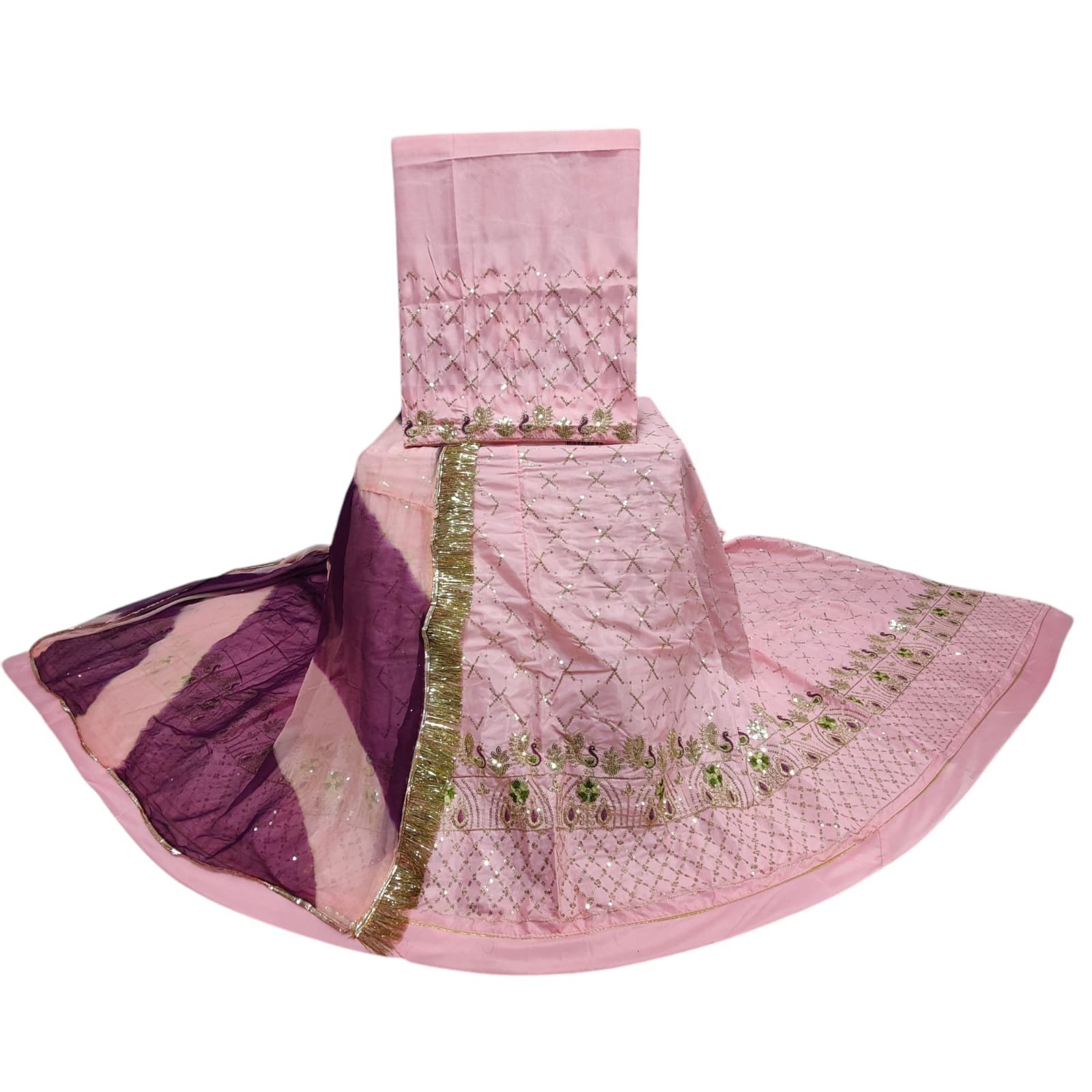The set is paired with a vibrant multicolour Nazmin chiffon odhni, measuring 2.25 meters, offering a graceful drape and lightweight comfort. The odhni is embellished with Gota Kinari and Turi lace, adding a rich traditional finish and making it perfect for festive events, weddings, or cultural gatherings.