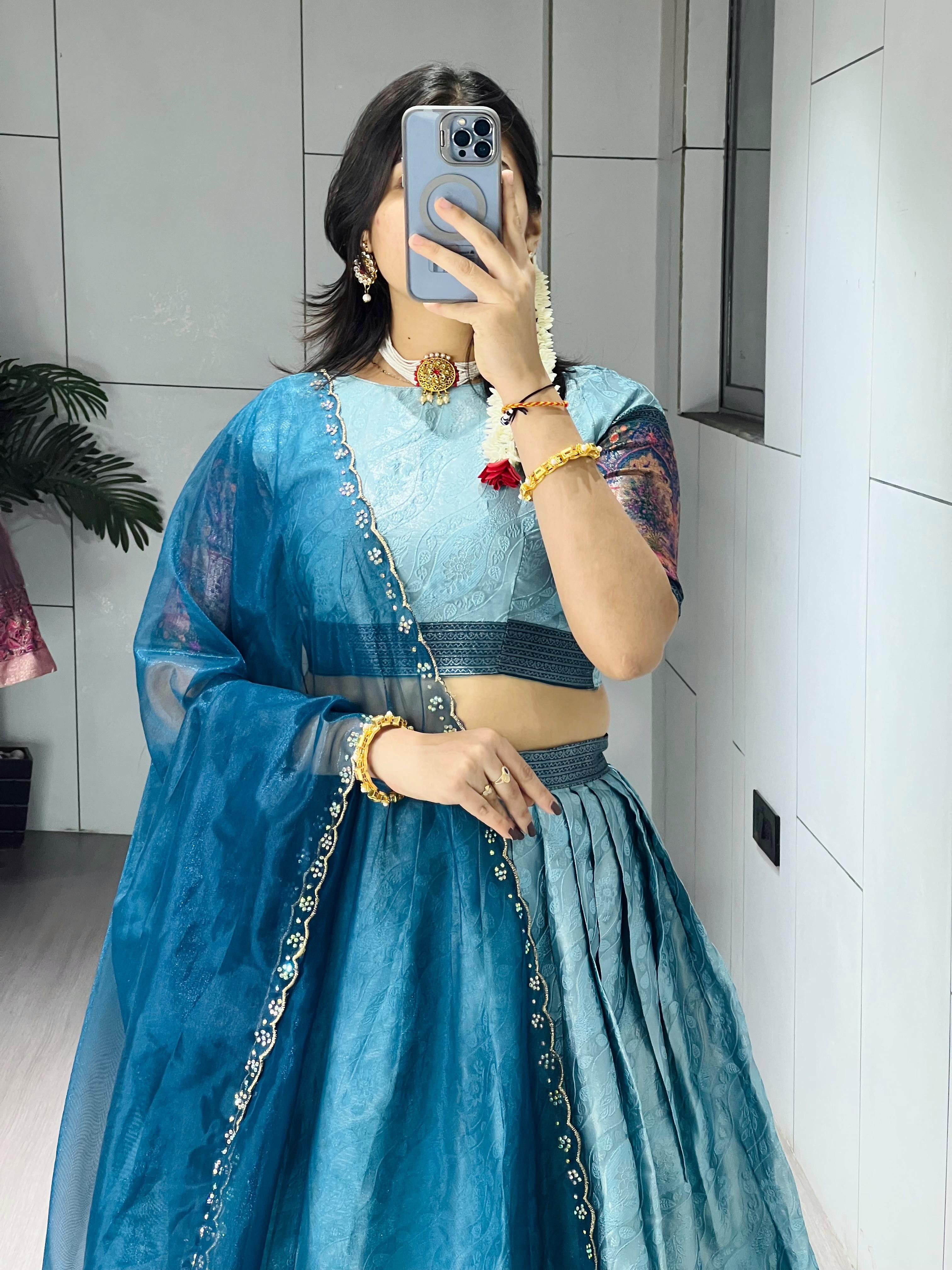 The lehenga comes fully stitched with a graceful 3.5-meter flair, enhanced by canvas layering and can-can for a voluminous, flattering silhouette. Paired with a beautifully woven silver zari blouse (unstitched for custom fitting) and a vibrant twill dupatta featuring detailed handwork, this ensemble is ideal for weddings, festive occasions, and grand celebrations.
