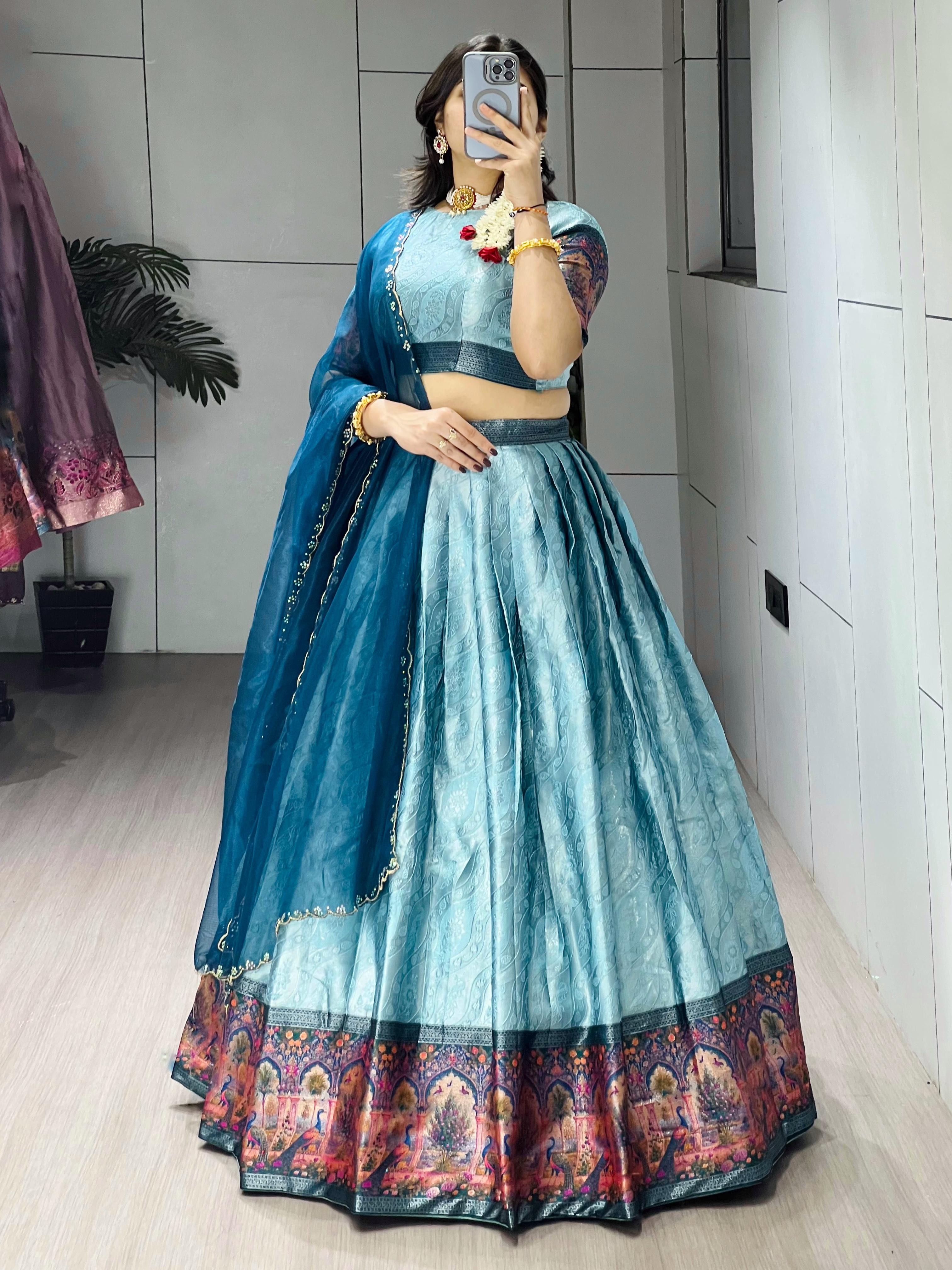 Step into timeless elegance with this stunning Silk Traditional Lehenga Choli, crafted to bring out royal charm in every celebration. Designed with intricate zari weaving and a rich Kalamkari border, this outfit perfectly blends heritage craftsmanship with modern styling.