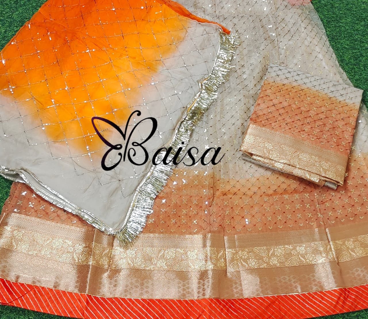 An organza Banarasi border Rajputi poshak beautifully combines traditional elegance with a light, airy fabric. Here are some key features of this attire: