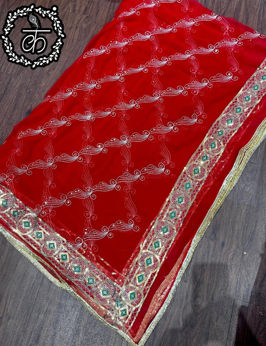 The royal pure odhani is adorned with four-side heavy jaal work and gottapatti turris, completing the majestic look. The 2-meter heavy kurti features allover embroidery and comes with stitched astar for perfect comfort and drape.