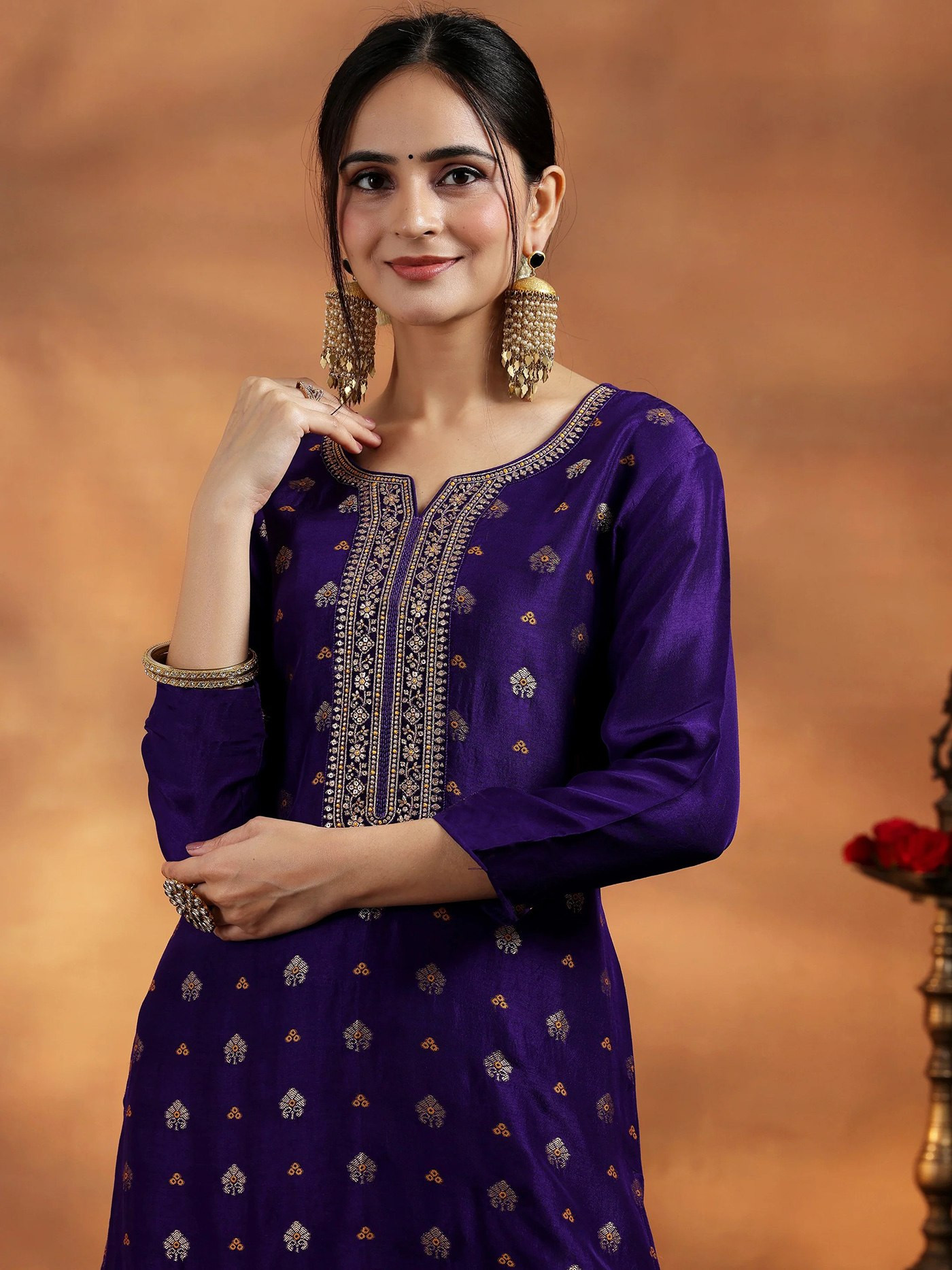 Step into elegance with the newly launched Violet Wooglee Suit Edition, designed to give you a rich and graceful ethnic look. Crafted from premium Art Silk fabric, this suit set showcases exquisite embroidery combined with Jacquard weaving, making it perfect for festive occasions, parties, and traditional gatherings.