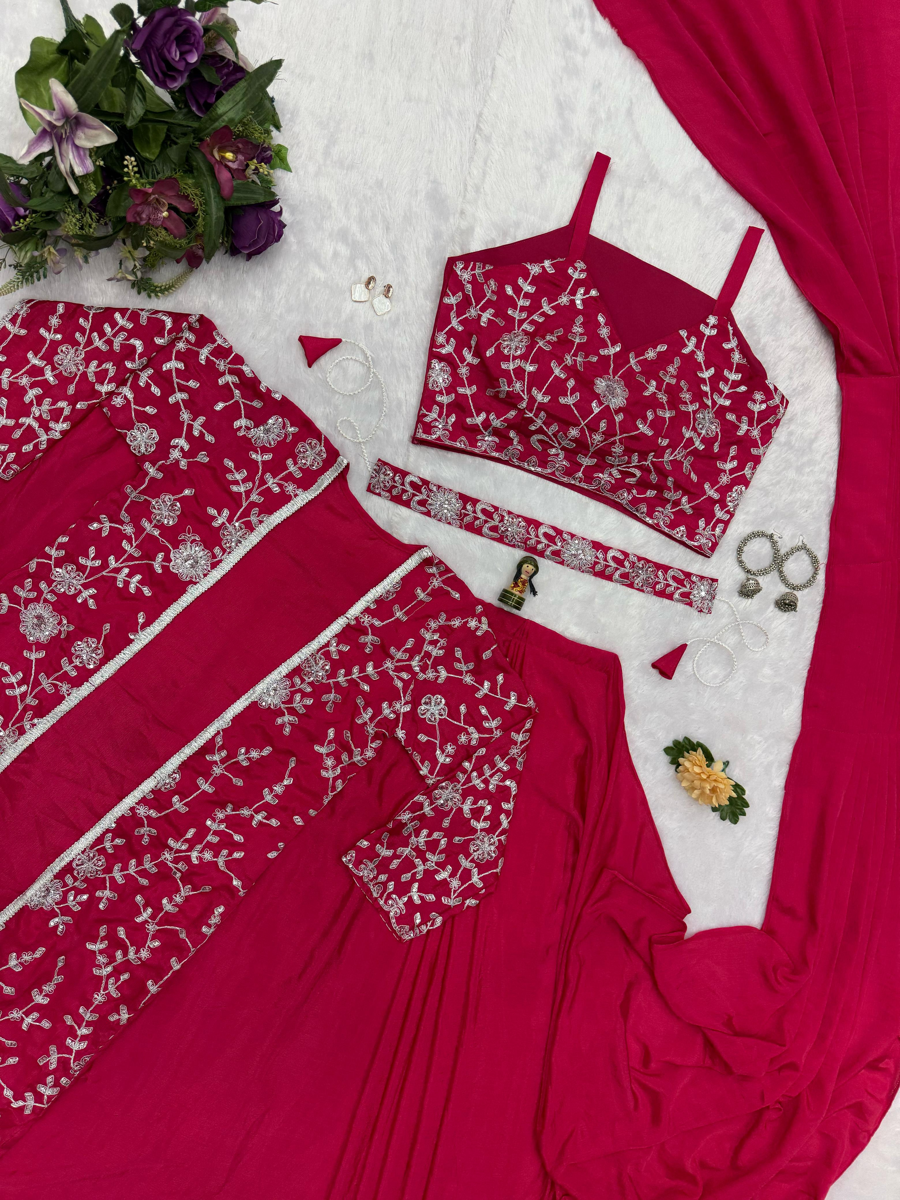 WE ARE LAUNCHING NEW SUPERHIT TRENDING READY TO WEAR SAREE WITH FULLY EMBROIDERED KOTI ON CHINON FABRIC WITH STITCH BLOUSE