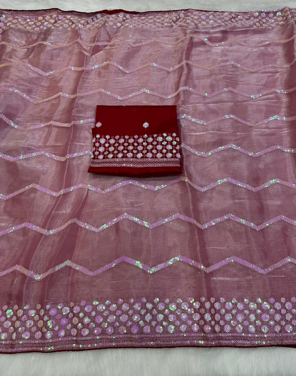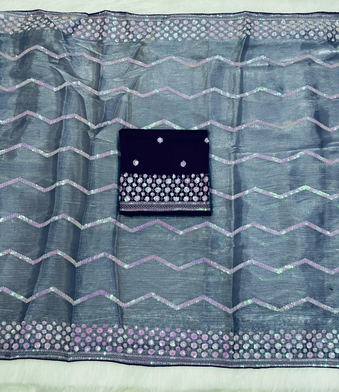 Fabric : Zimmy Choo Saree With Beautiful 5MM Sequence Embroidery C-Pallu Work Along With Contrast Piping Border