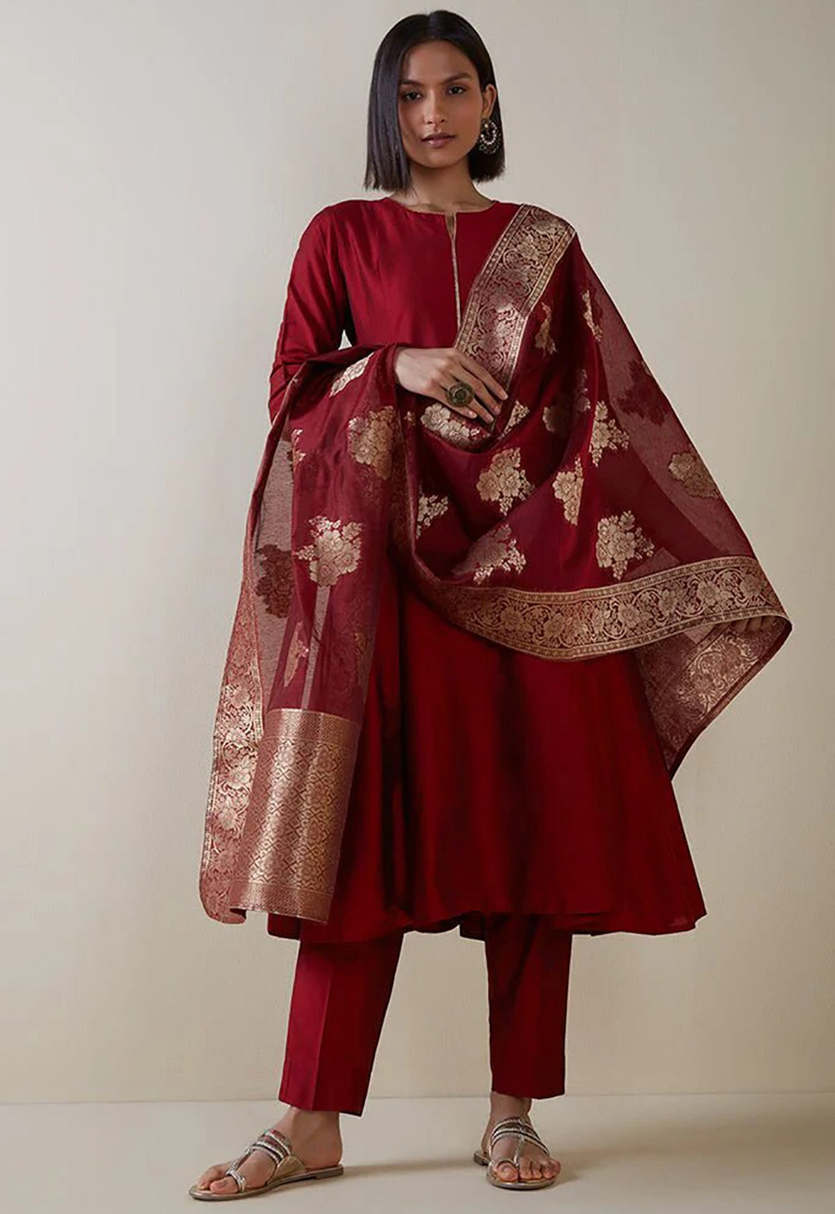 Elevate your ethnic wardrobe with this elegant Women’s Silk Kurta Pant Dupatta Set. Crafted in premium cotton silk fabric, this set offers comfort with a luxurious touch. The solid kurta features a graceful 43-inch length with ¾ sleeves, perfectly paired with stylish cotton silk pants. Completing the look is a silk blend dupatta with rich jacquard work, adding festive charm. Ideal for casual gatherings, festive occasions, and traditional celebrations.