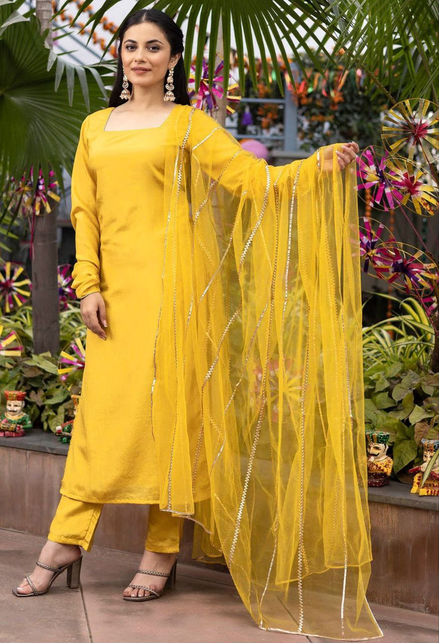 Elevate your festive and ethnic wardrobe with this elegant Women’s Silk Kurta Pant Dupatta Set. Crafted from premium Roman silk, the solid yellow kurta features a graceful 43-inch length with full sleeves for a refined look. The straight-fit pant is designed in matching Roman silk with a 37-inch length, ensuring both comfort and style. Paired with a delicate 2.0m net dupatta, this set is perfect for festive occasions, weddings, parties, or traditional gatherings.