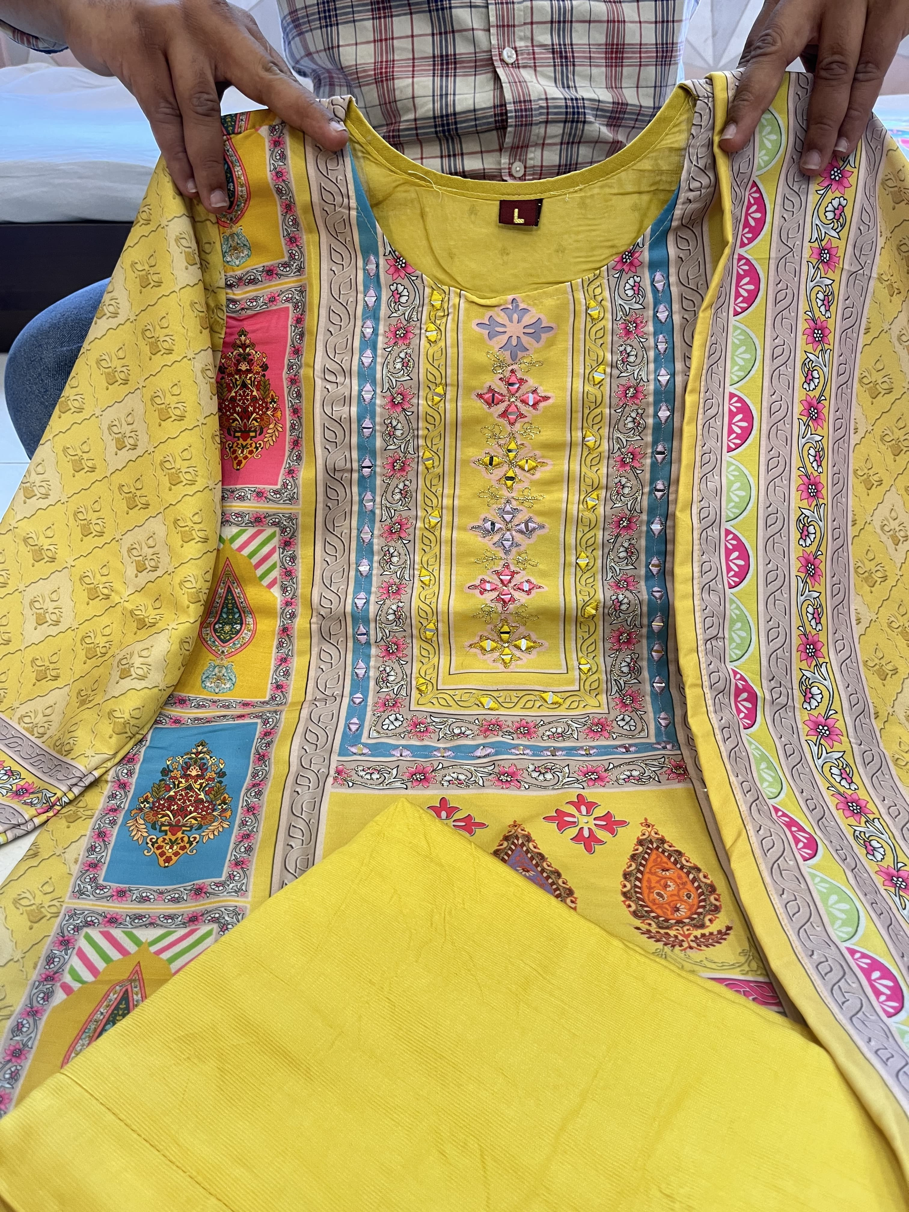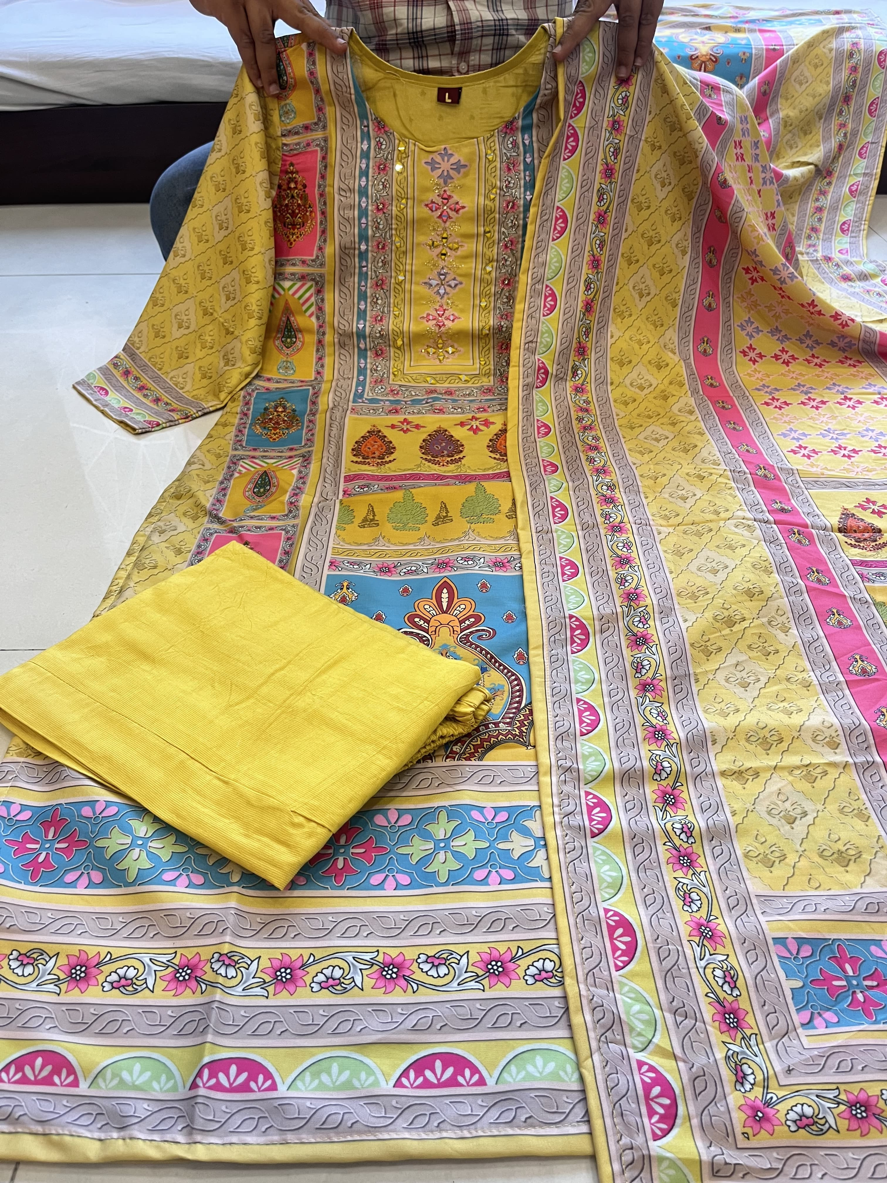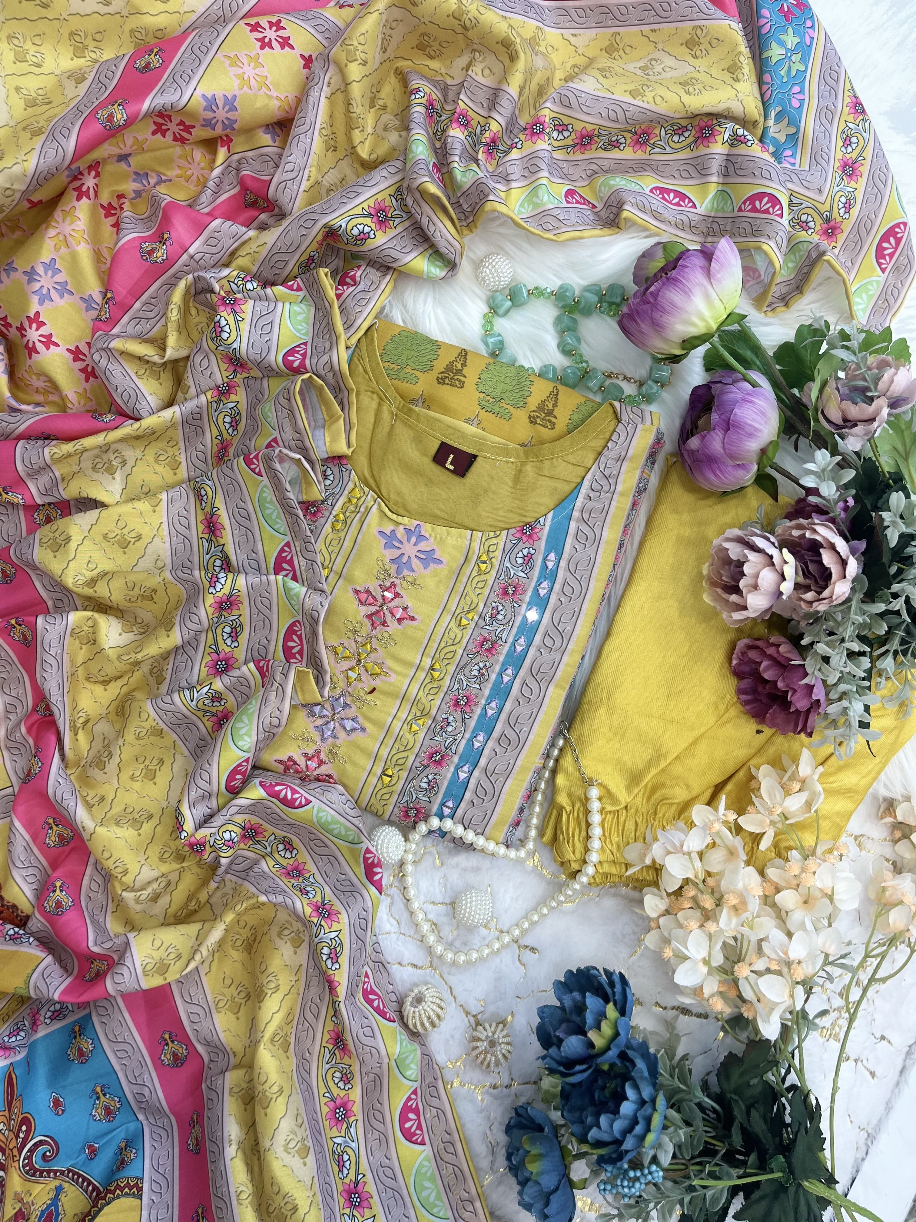 Step into style with this beautifully designed yellow muslin suit! Soft, comfortable, and elegantly detailed with intricate embroidery and floral prints, this outfit is perfect for any festive occasion.