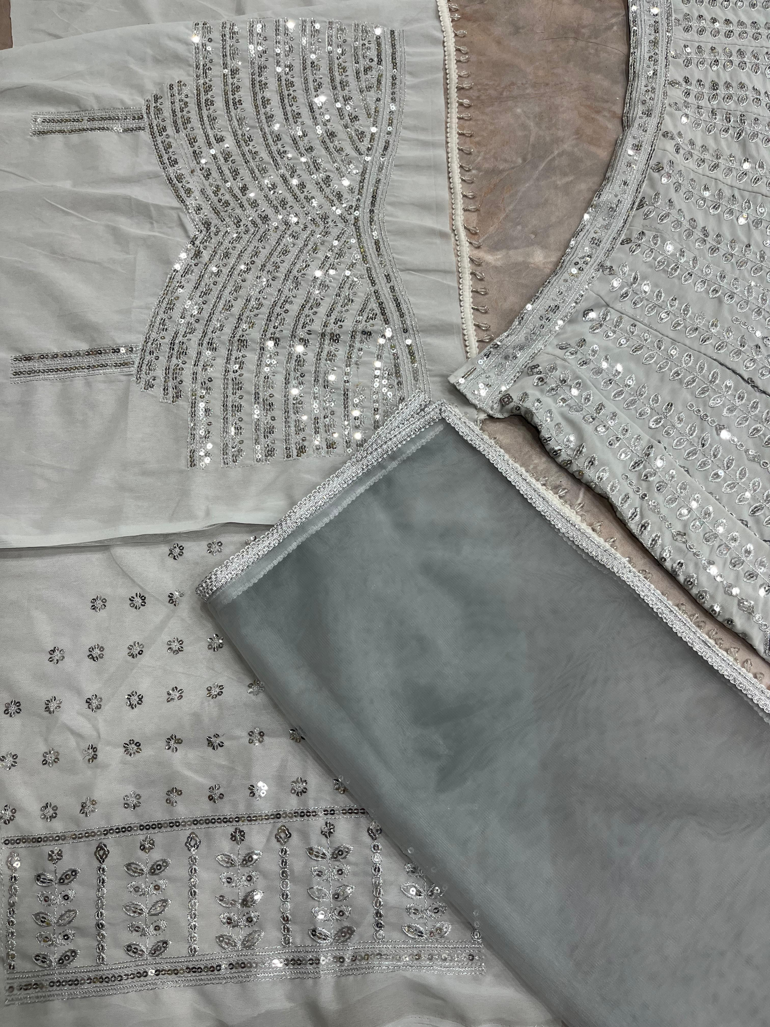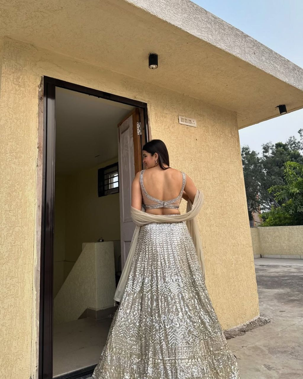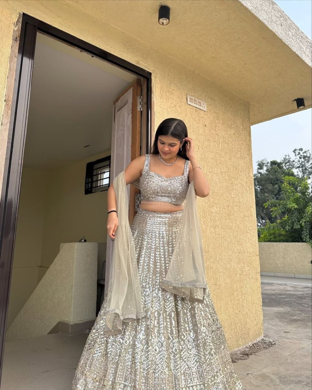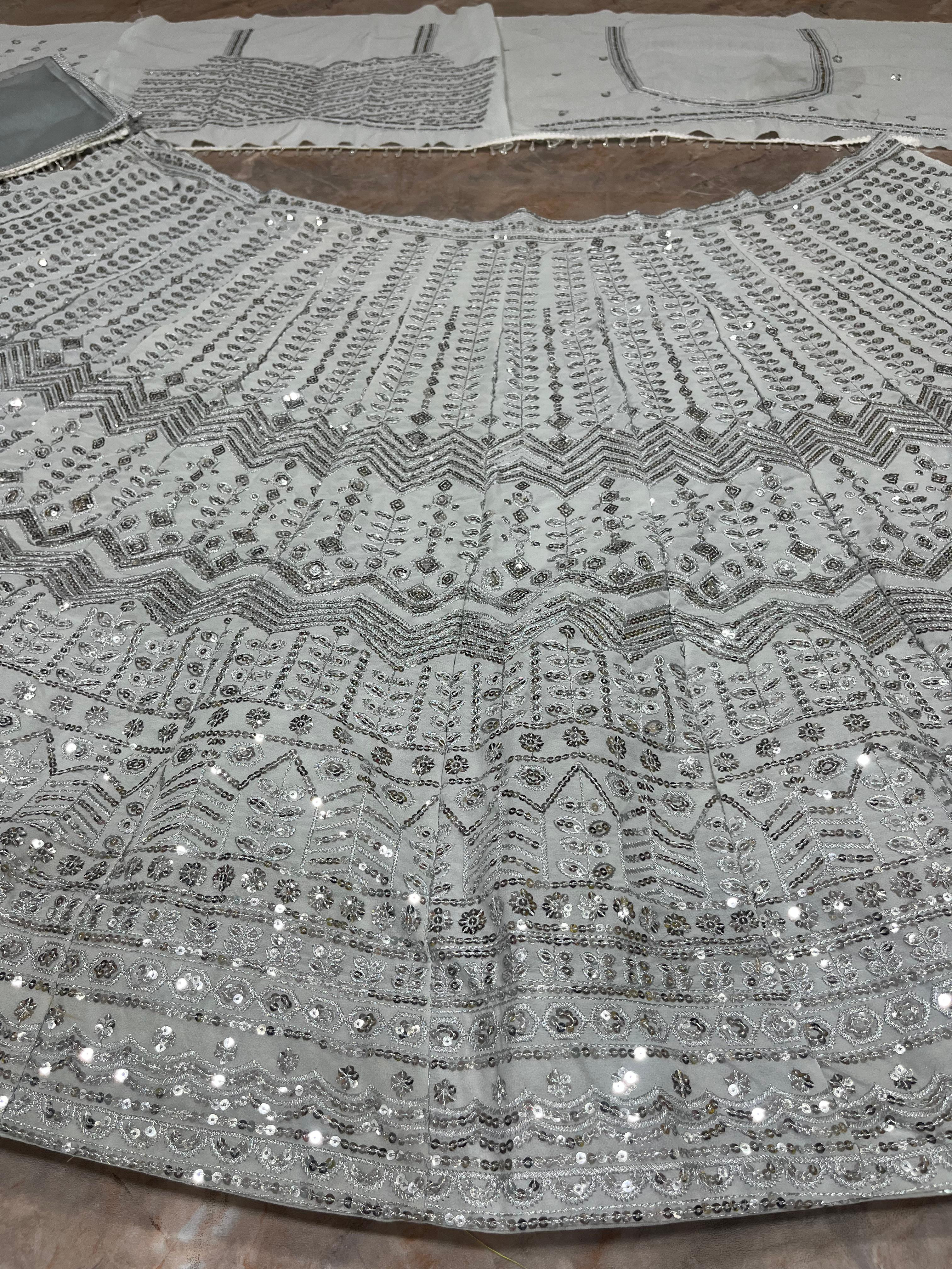 The semi-stitched lehenga allows customization up to size 44, ensuring a flattering fit. Paired with a premium faux georgette unstitched blouse adorned with delicate sequins embroidery, it offers styling flexibility to match your personal taste. Completing the ensemble is a beautifully crafted butterfly net dupatta with elegant embroidery sequins work, adding a soft and luxurious finishing touch.