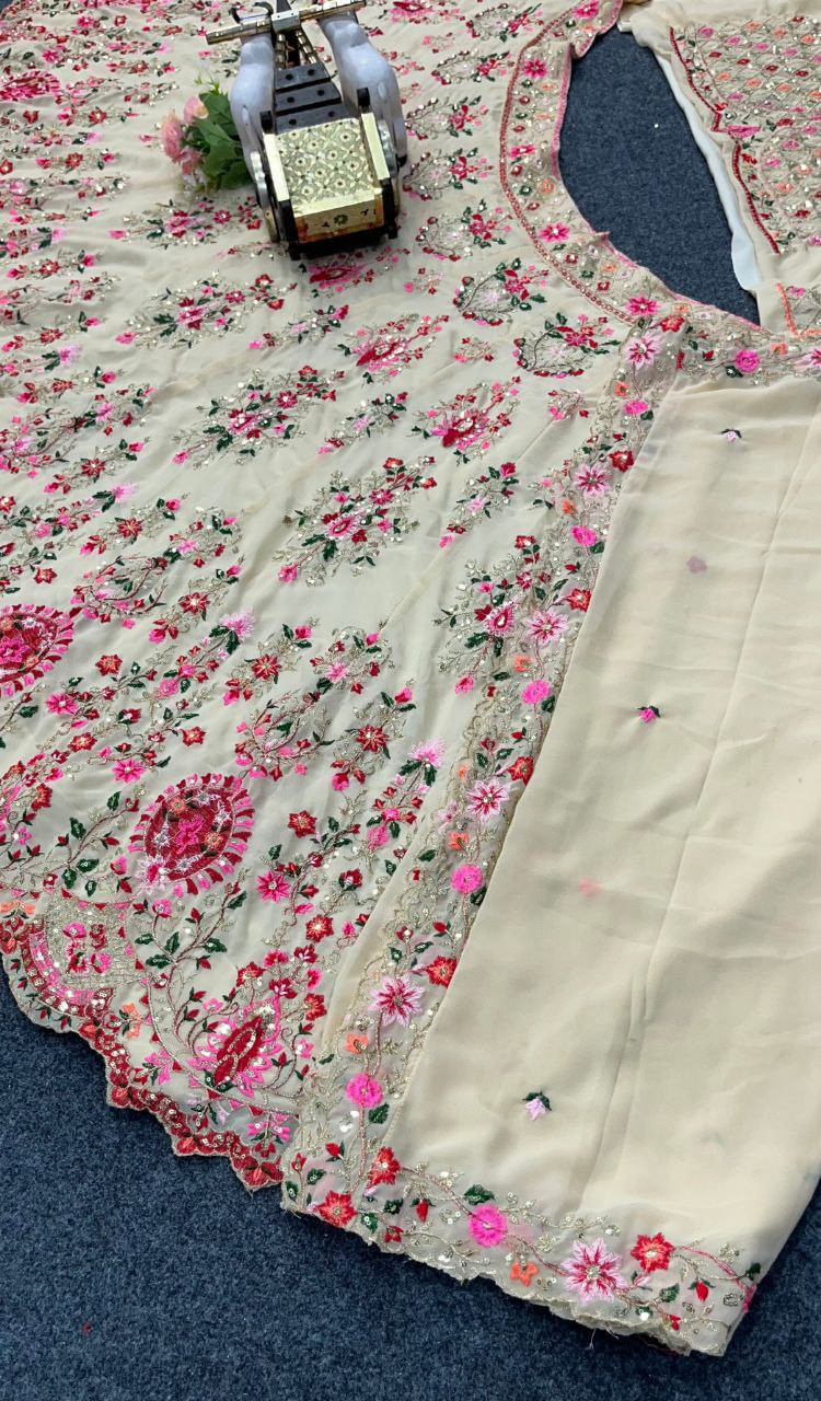 Step into elegance with this Exquisite 4 Meter Flared Embroidered Sequins Work Lehenga, crafted from premium Faux Georgette for a luxurious drape and unmatched comfort.