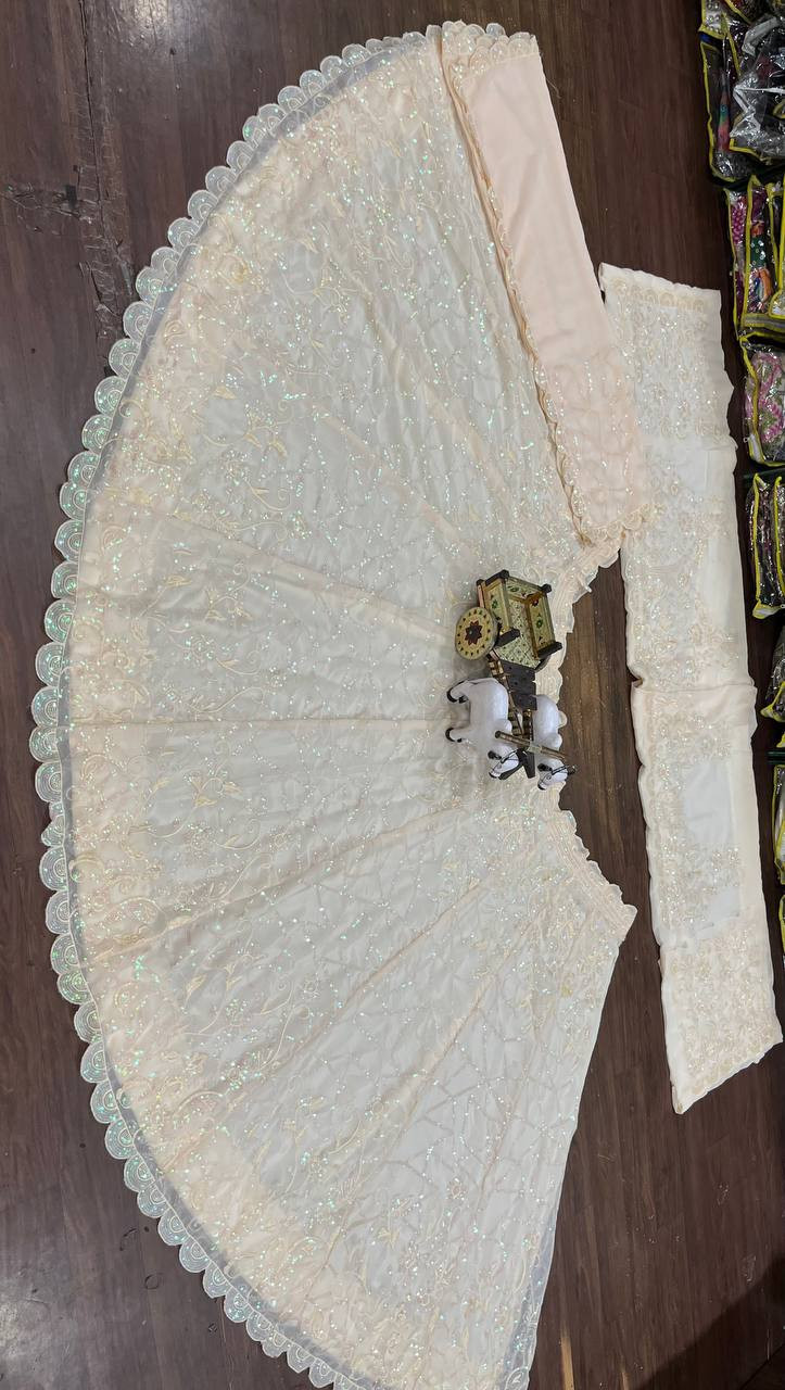 The semi-stitched design allows easy customization up to size 44, while the matching embroidered blouse and beautiful Fox Georgette dupatta complete the regal look — perfect for weddings, sangeet nights, receptions, or festive celebrations.