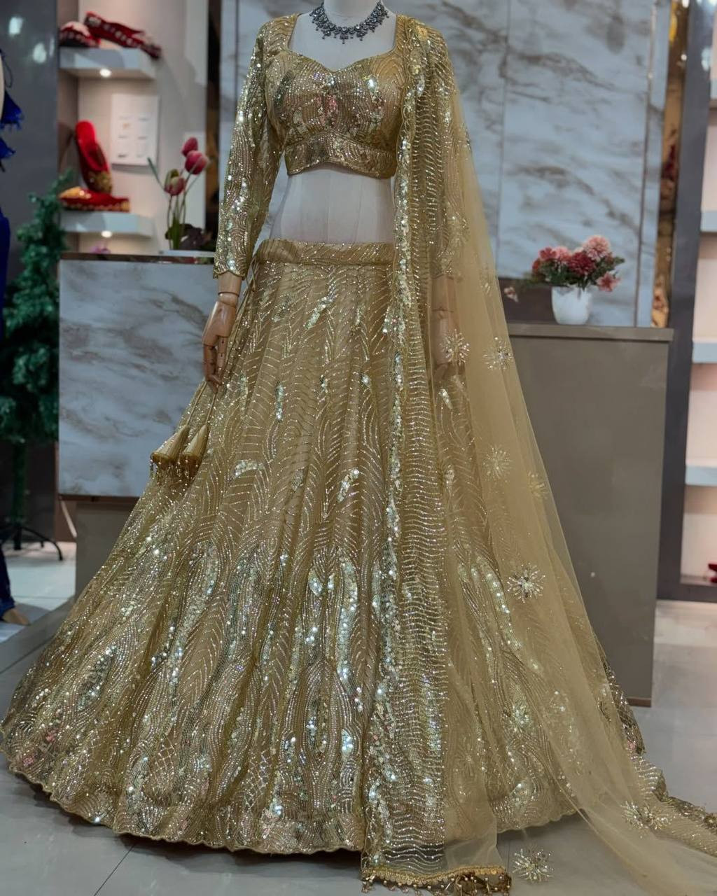 The lehenga showcases rich sequins embroidery, shimmering beautifully with every movement. Paired with a 1.3-meter unstitched soft net blouse featuring matching sequins work and lining for easy customization. Completing the set is a 2.3-meter soft net dupatta adorned with exquisite embroidered sequins for a truly regal finish.